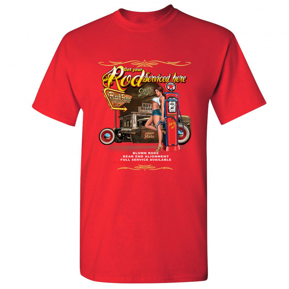 A print featuring a sexy pin-up girl leaning on a gas pump. There is a hot rod behind her and a "Rat Rod Roudhouse" in the background. The print also includes a bunch of innuendos: "get your rod serviced here, blown rods, rear end alignment, full service