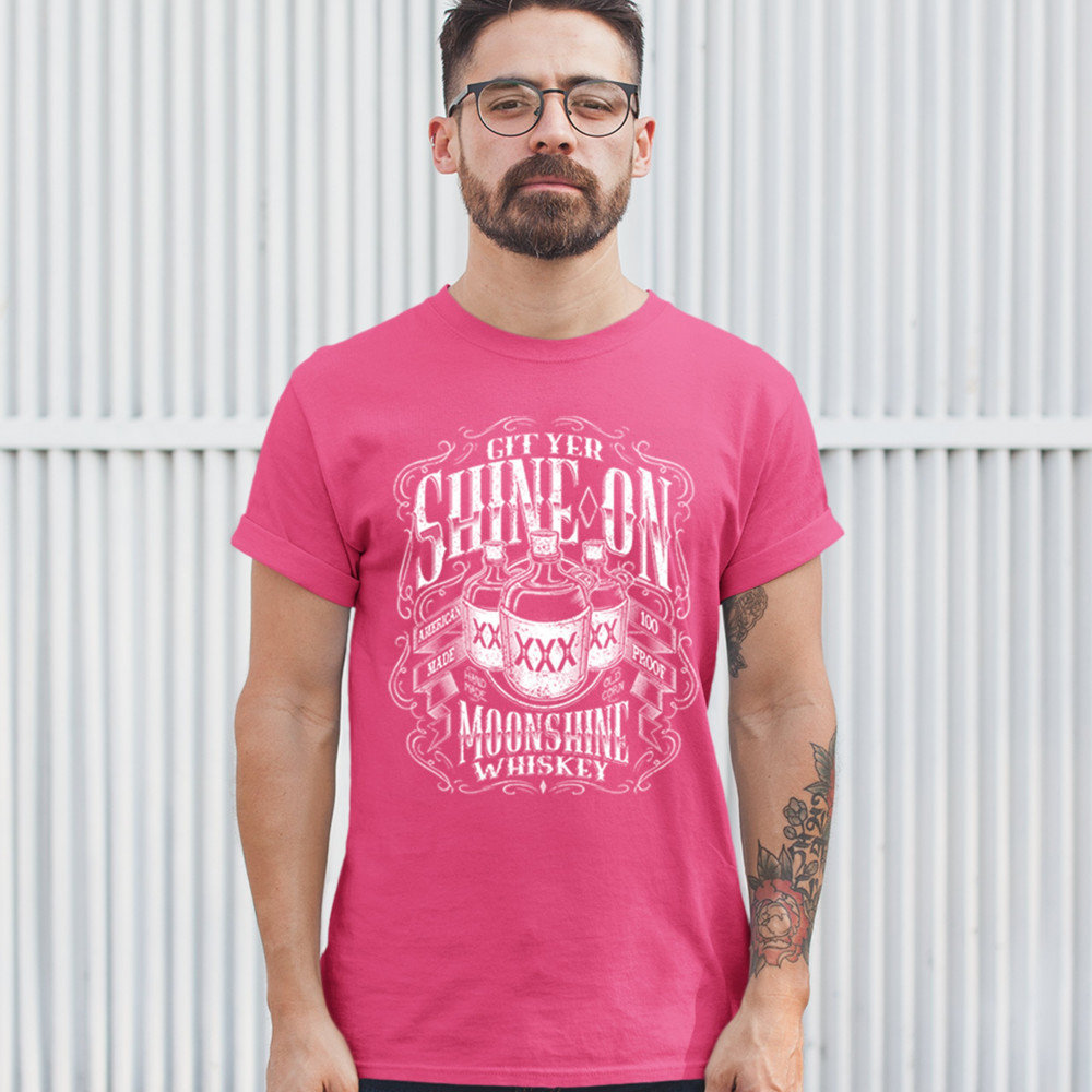 GIT YER SHINE ON MOONSHINE WHISKEY t-shirt xxx mason jars drinking men's tee hot pink