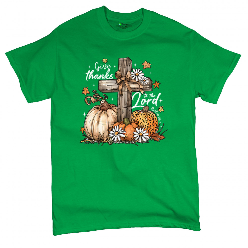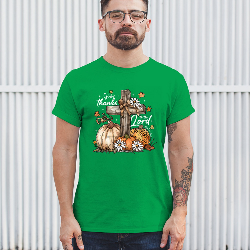Thanksgiving design with pumpkins, daisies, and rustic cross. Perfect for Turkey Day, faithful family gatherings, and fall festival blessings.