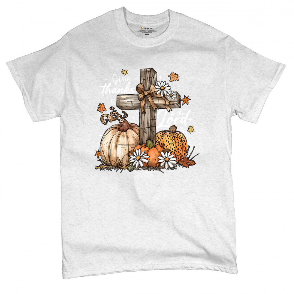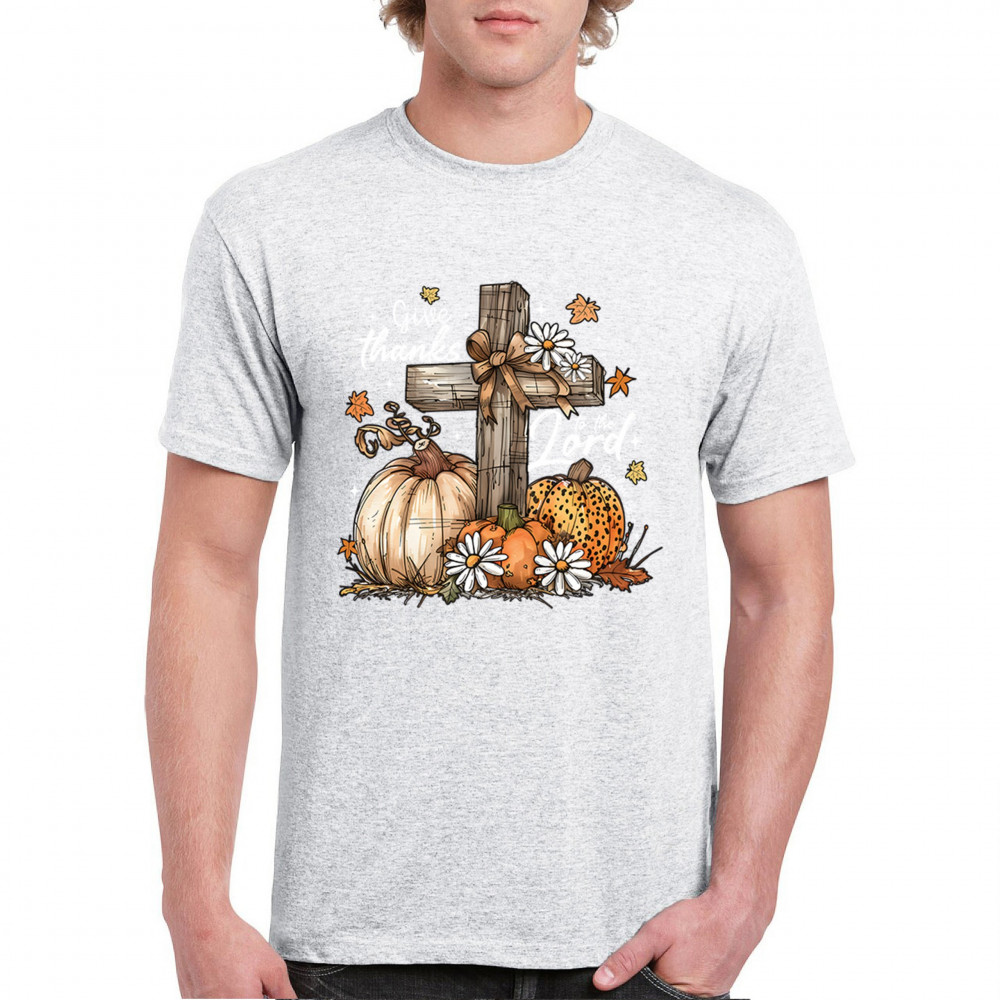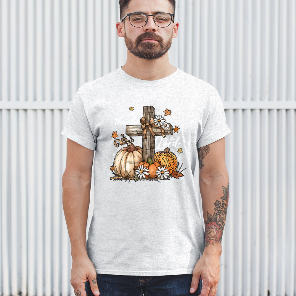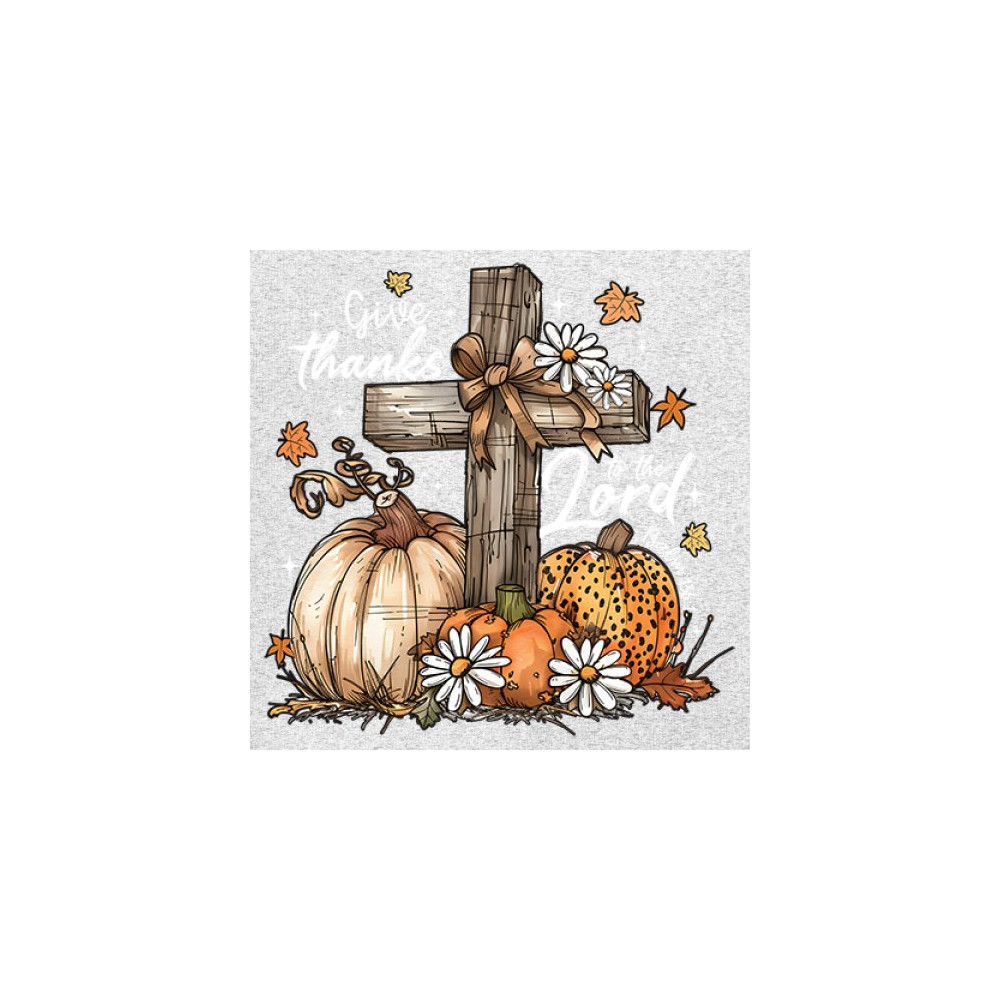 Thanksgiving design with pumpkins, daisies, and rustic cross. Perfect for Turkey Day, faithful family gatherings, and fall festival blessings.