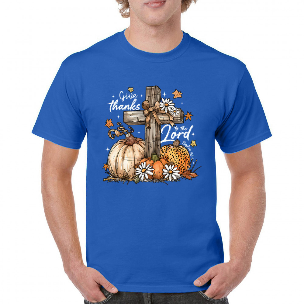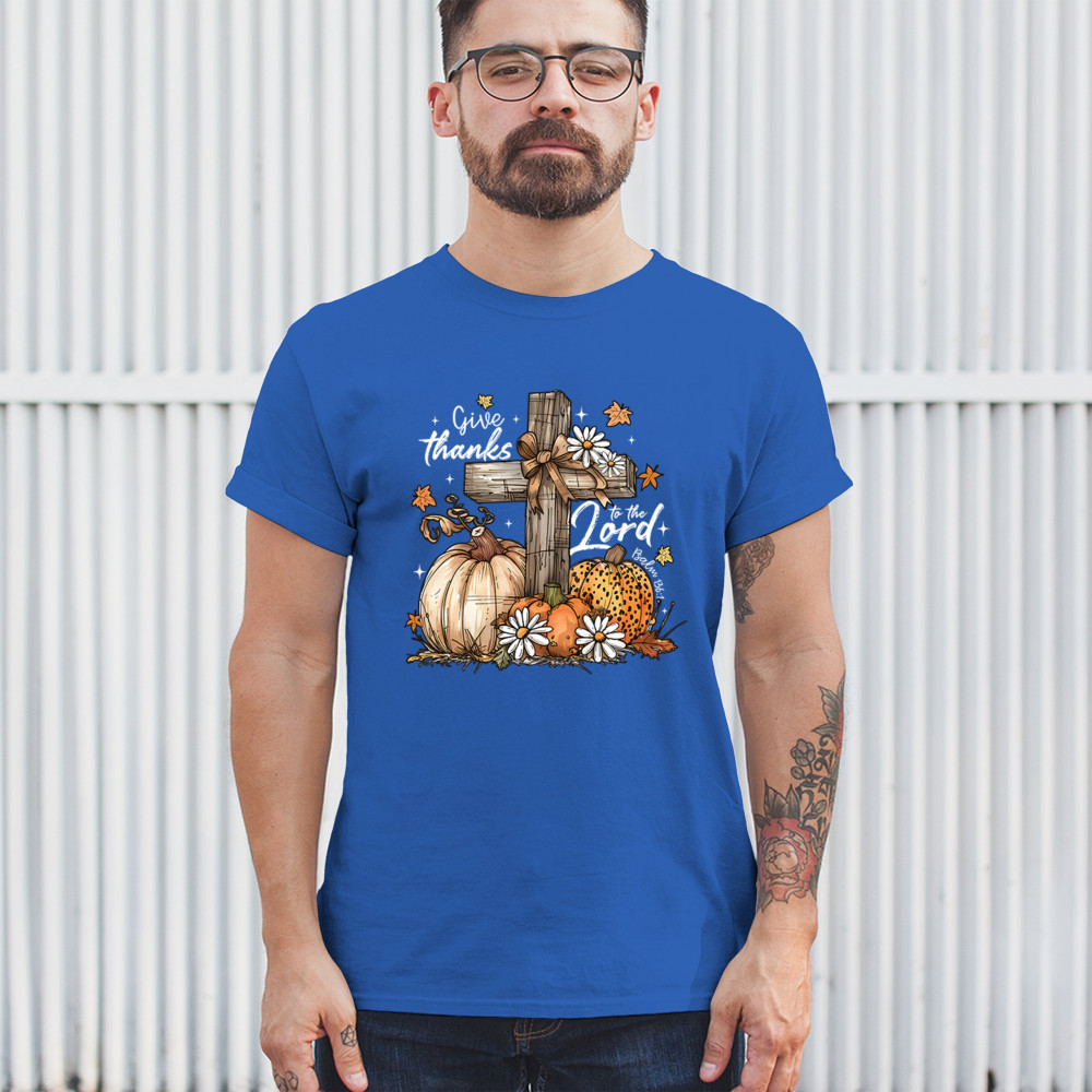 Thanksgiving design with pumpkins, daisies, and rustic cross. Perfect for Turkey Day, faithful family gatherings, and fall festival blessings.