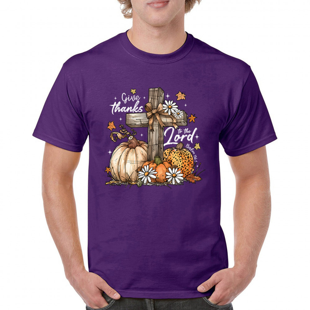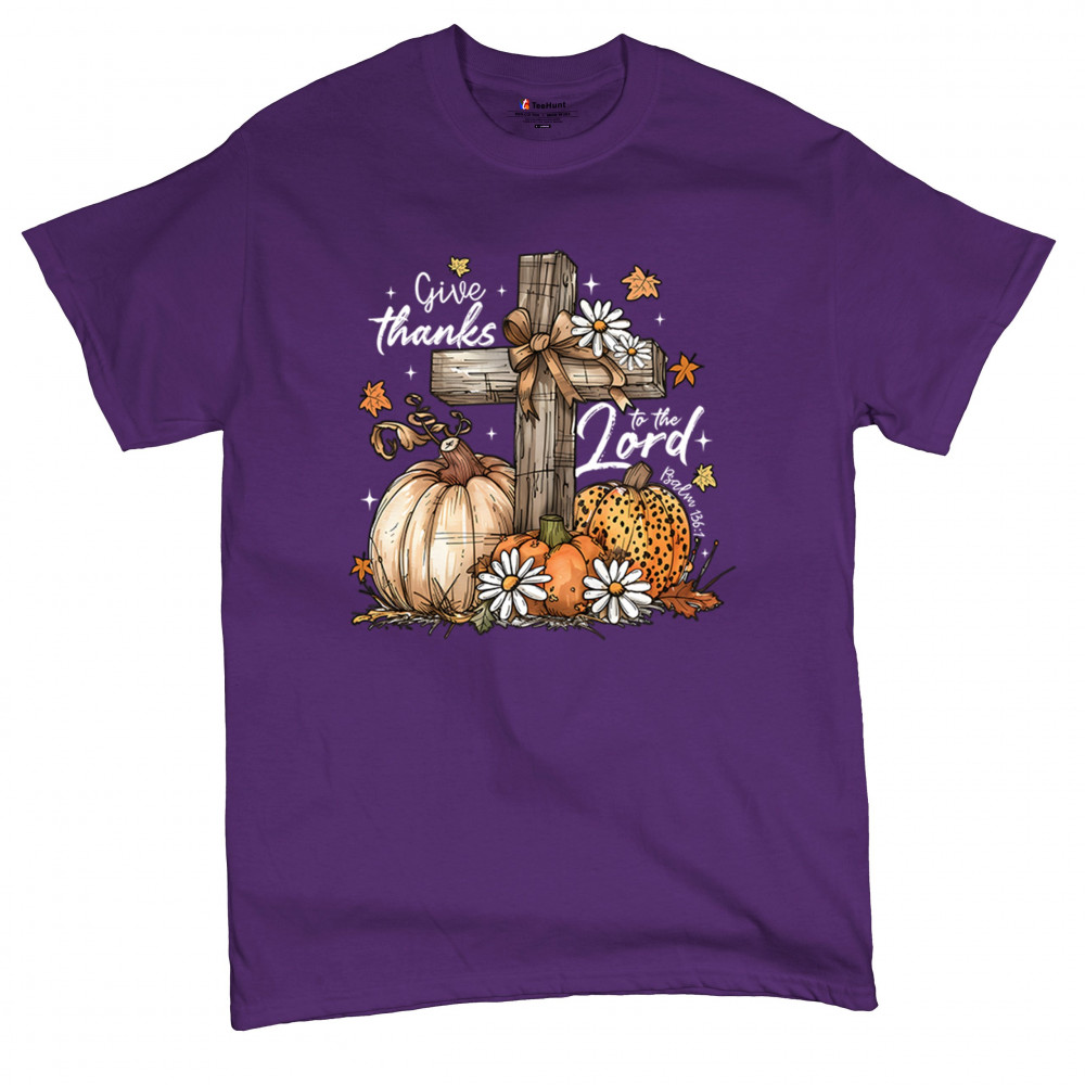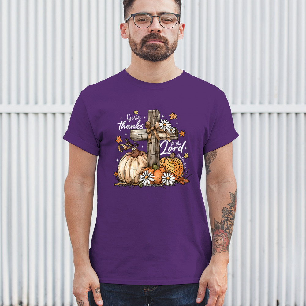 Thanksgiving design with pumpkins, daisies, and rustic cross. Perfect for Turkey Day, faithful family gatherings, and fall festival blessings.