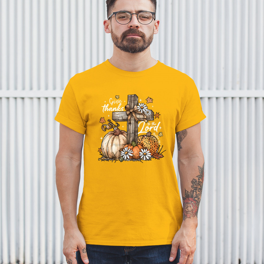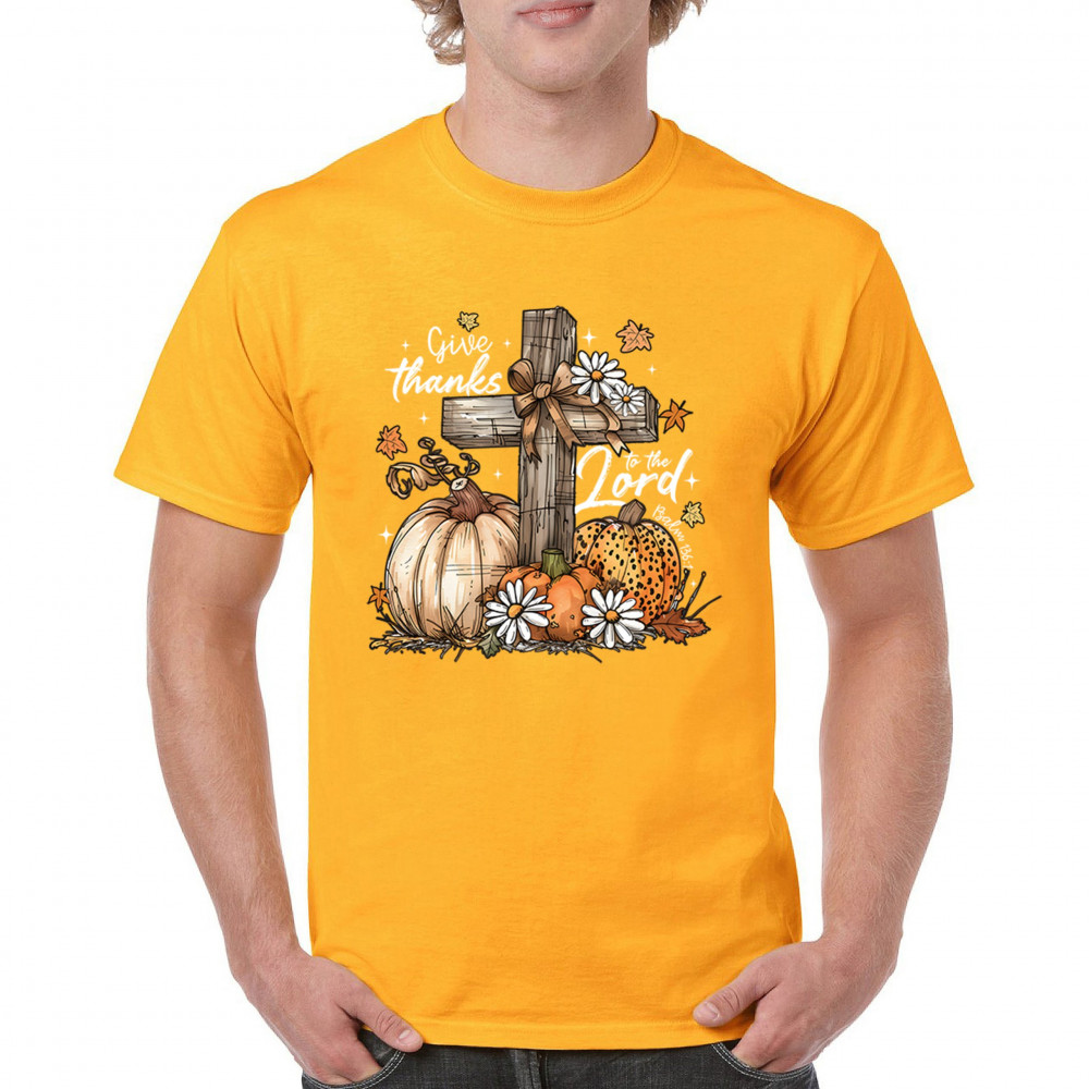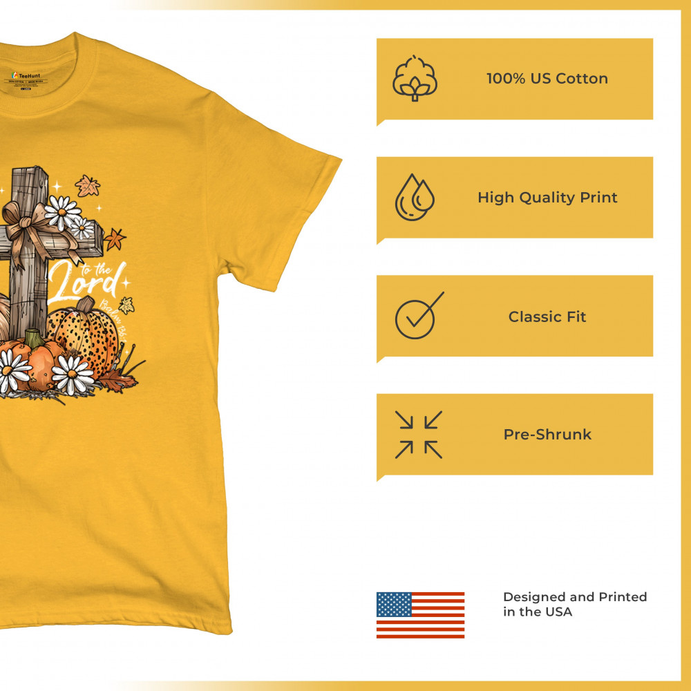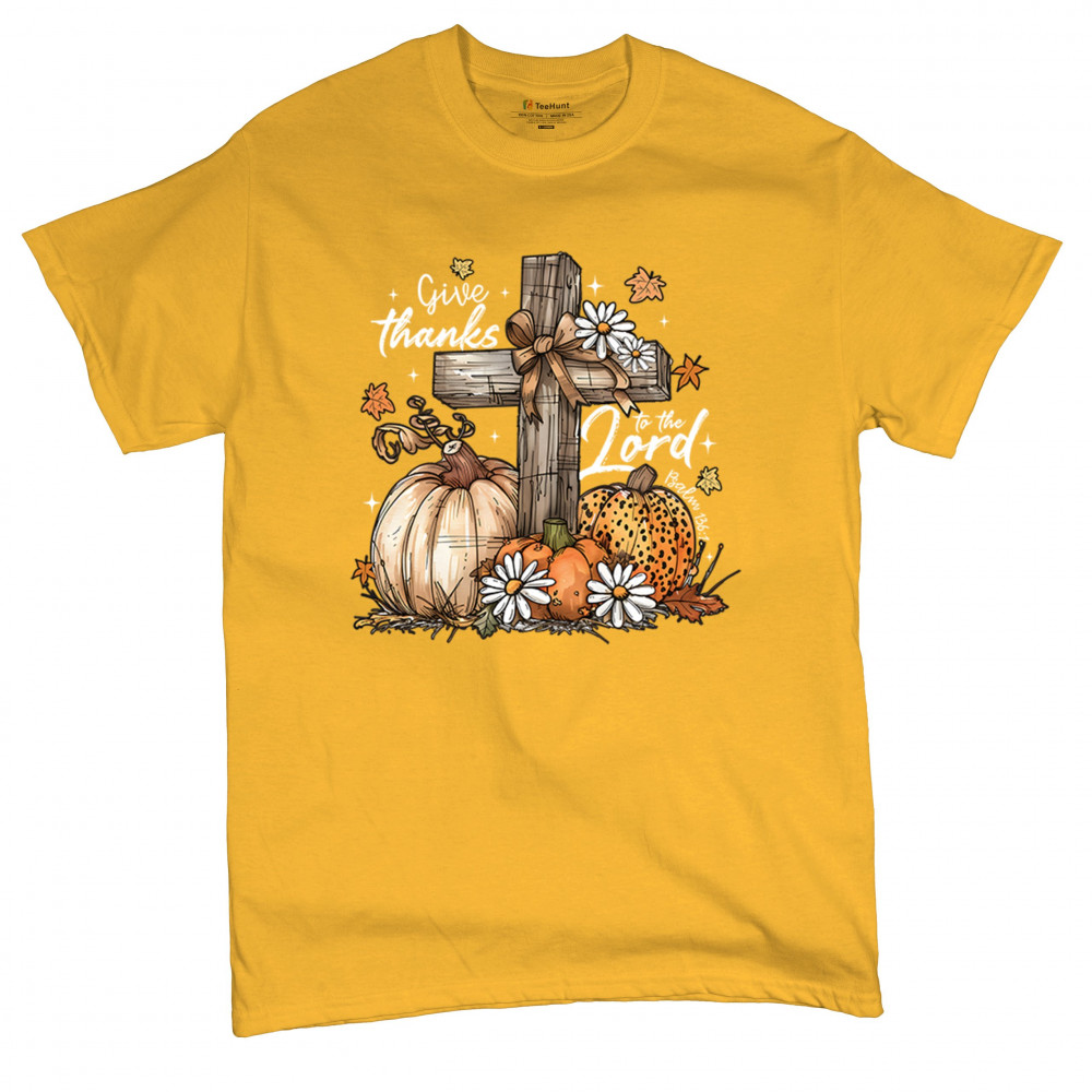 Thanksgiving design with pumpkins, daisies, and rustic cross. Perfect for Turkey Day, faithful family gatherings, and fall festival blessings.