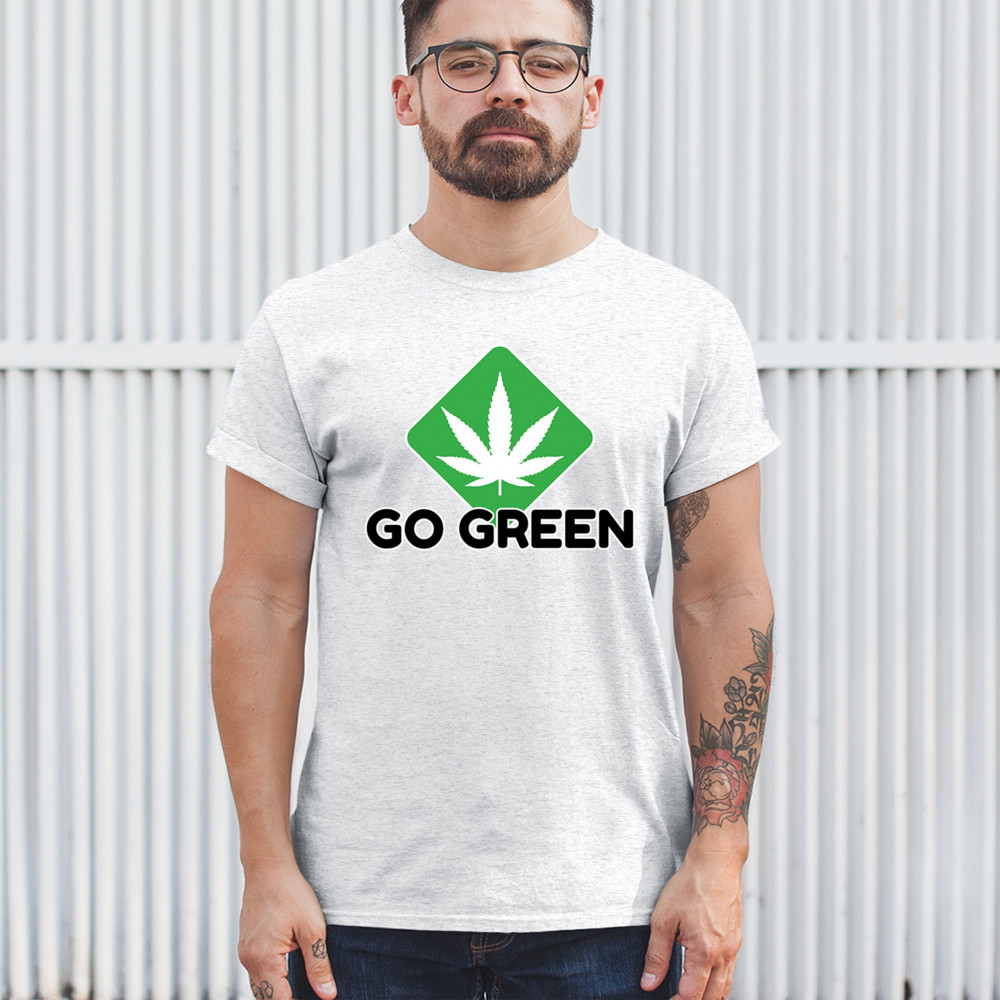 Bold Go Green design with cannabis leaf icon. Perfect for 420 fans, eco-conscious wearers, stoners, and marijuana advocates.