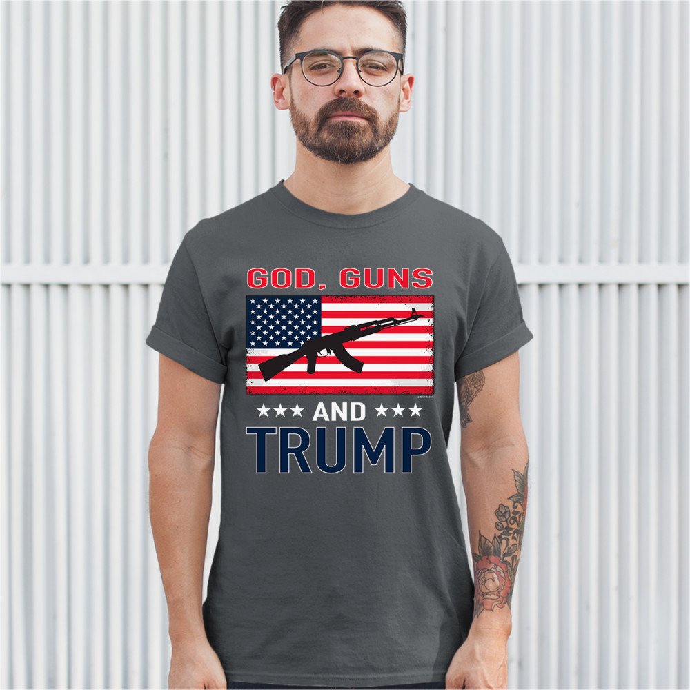 A political print saying "God, Guns and Trump". In the center there is the American flag with a silhouette of AK-47 rifle on it. A great choice to wear for a Trump rally or give as a gift to a Donald Trump and Mike Pence supporter before 2020 presidential elections.