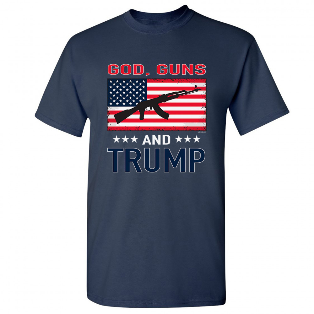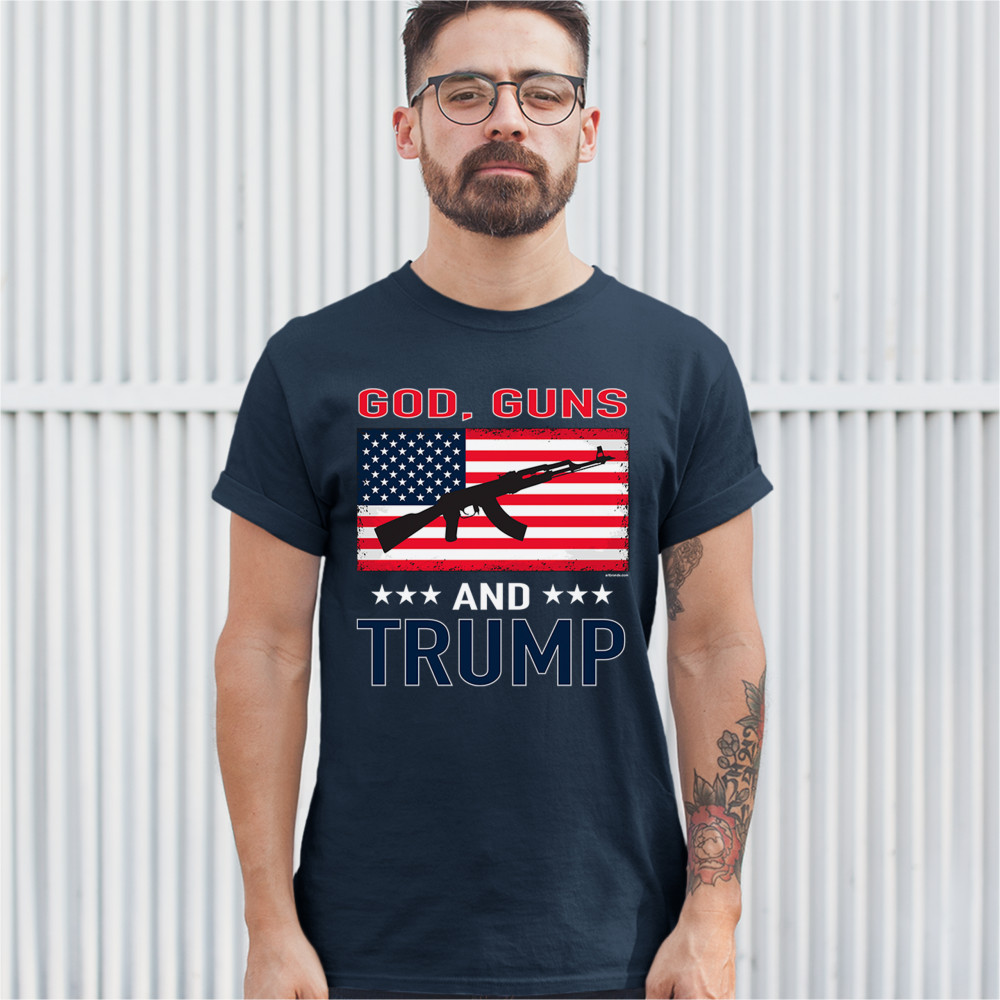 A political print saying "God, Guns and Trump". In the center there is the American flag with a silhouette of AK-47 rifle on it. A great choice to wear for a Trump rally or give as a gift to a Donald Trump and Mike Pence supporter before 2020 presidential elections.