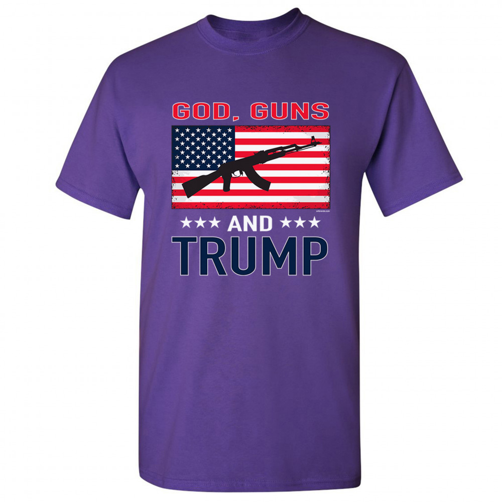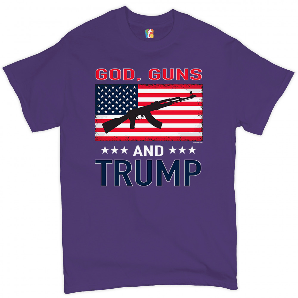 A political print saying "God, Guns and Trump". In the center there is the American flag with a silhouette of AK-47 rifle on it. A great choice to wear for a Trump rally or give as a gift to a Donald Trump and Mike Pence supporter before 2020 presidential elections.