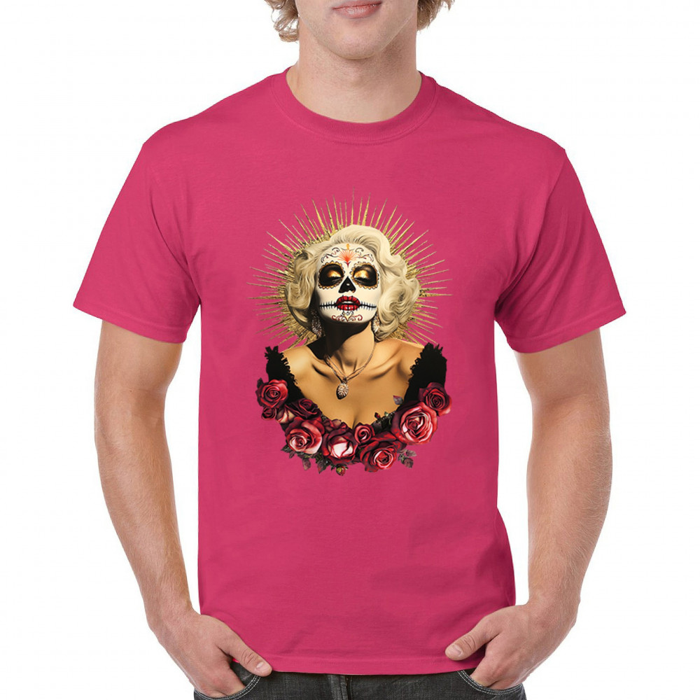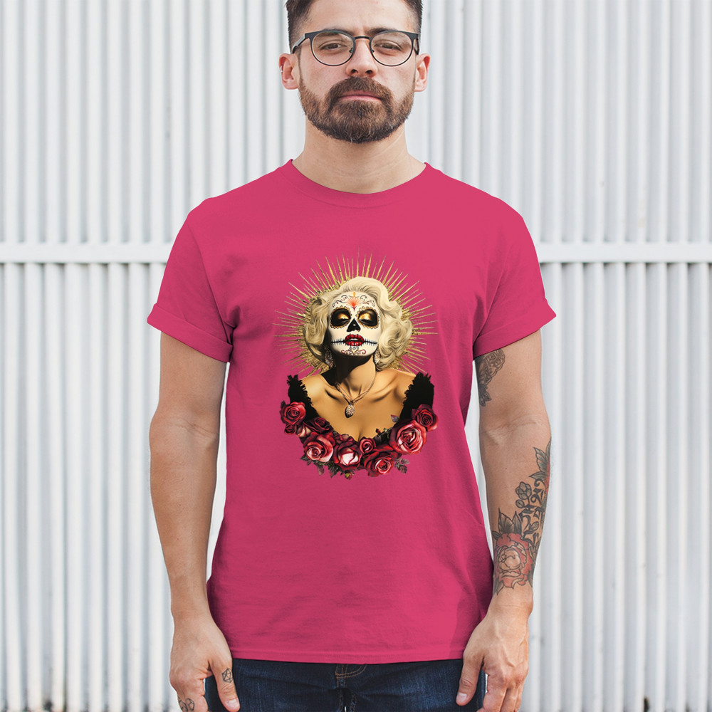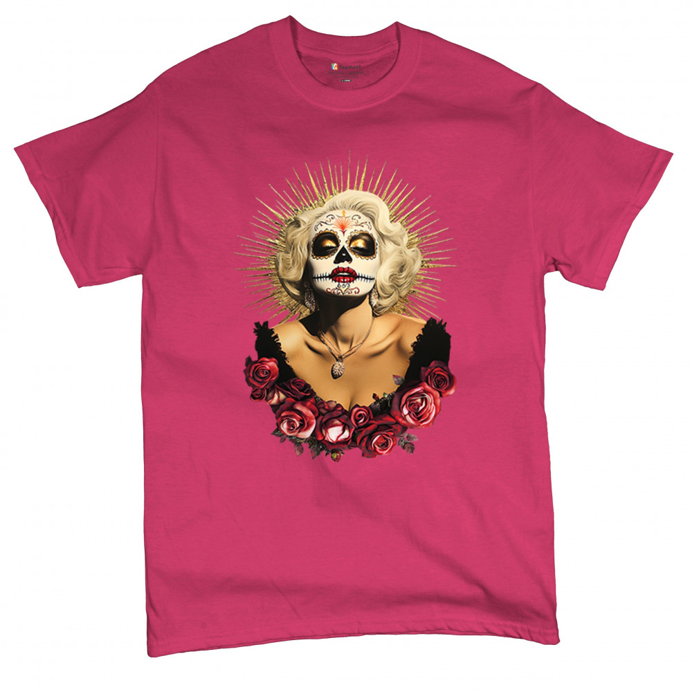 This bold and beautiful sugar skull design features a glamorous calavera woman crowned in a golden halo and framed by roses. A divine tribute to Dia de los Muertos, this look blends vintage glam, Latin culture, makeup artistry, and sacred symbolism. Perfect for fans of gothic beauty, Halloween, and heritage expression.