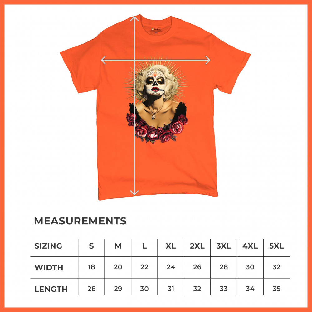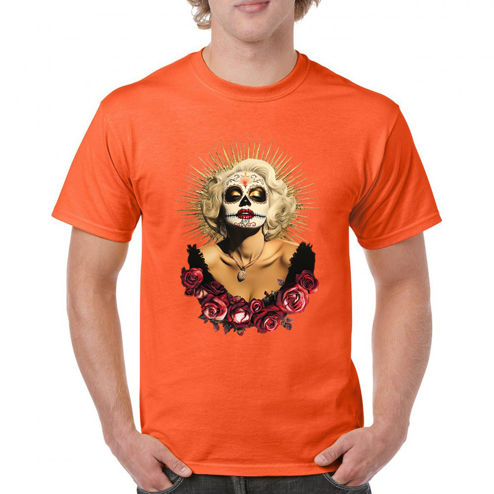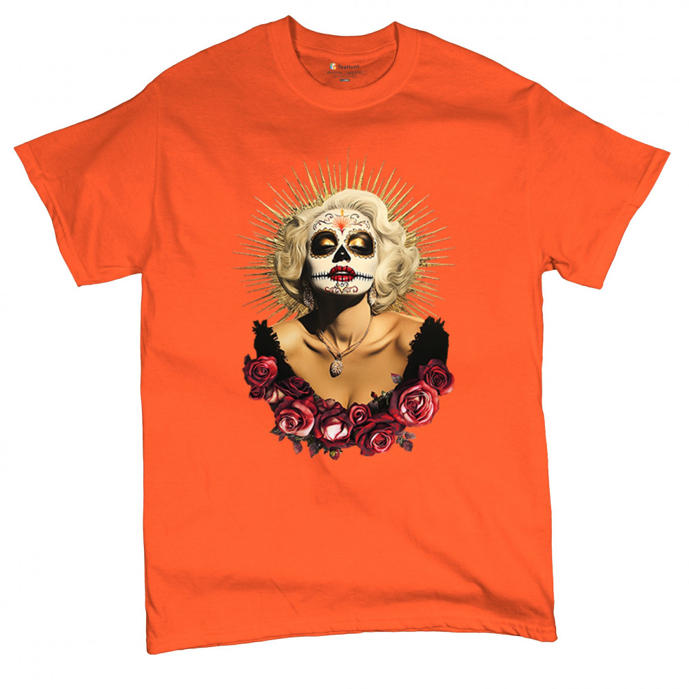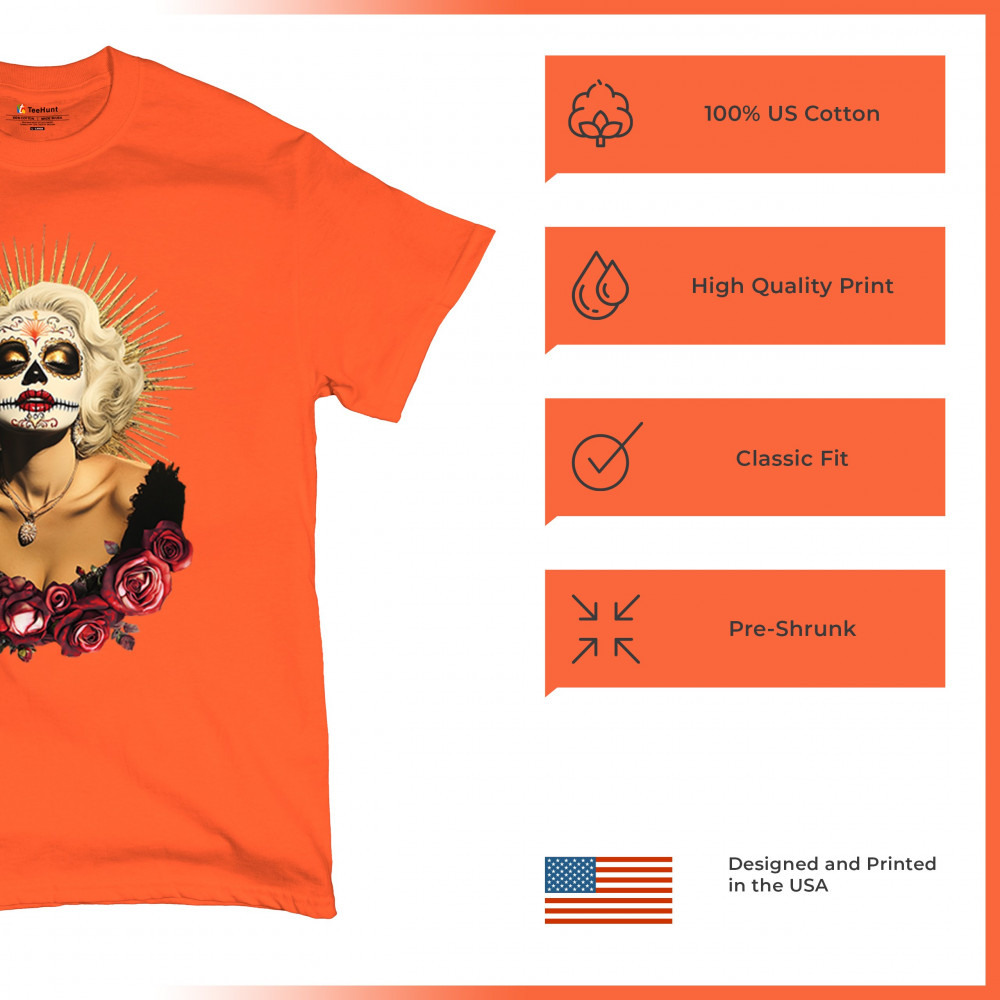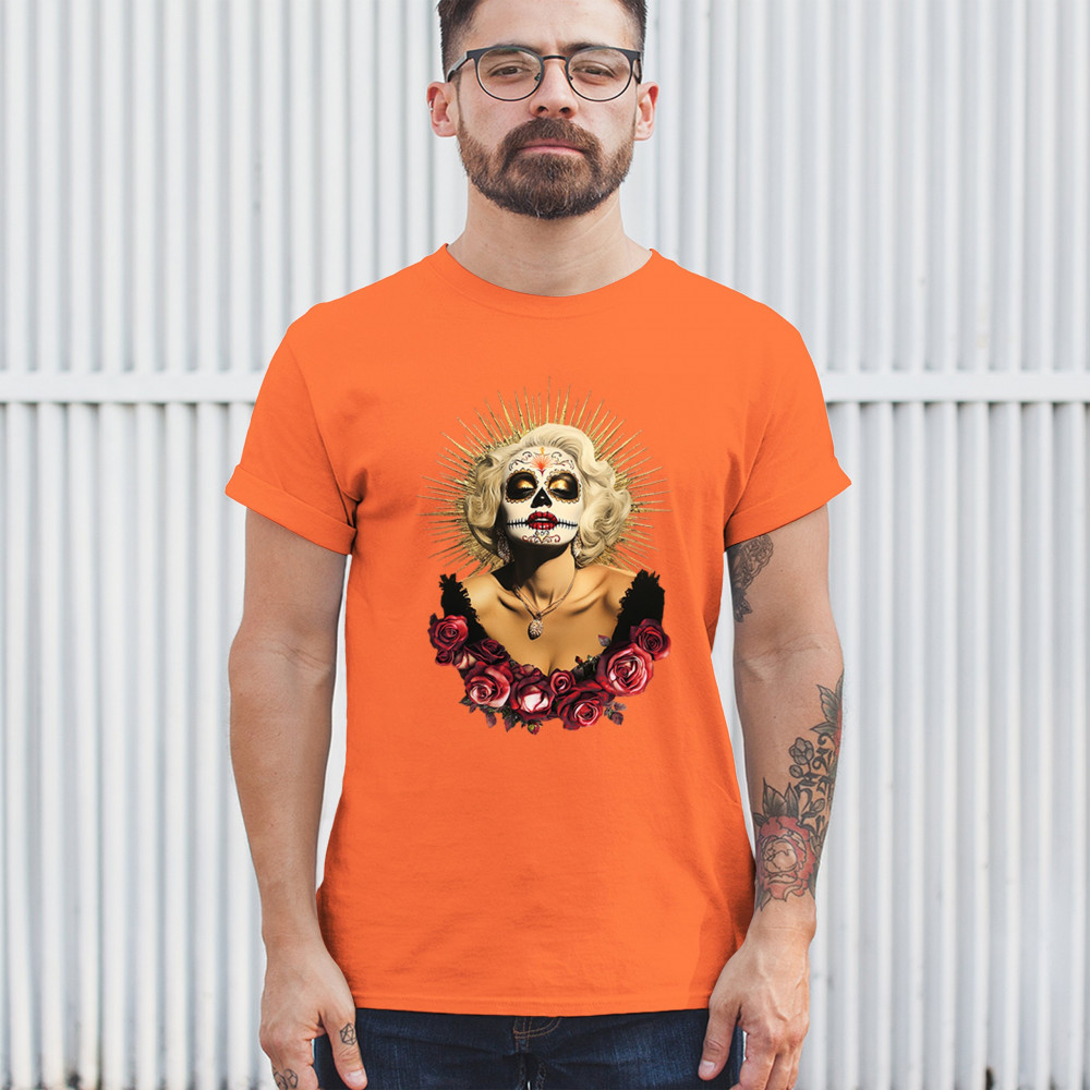 This bold and beautiful sugar skull design features a glamorous calavera woman crowned in a golden halo and framed by roses. A divine tribute to Dia de los Muertos, this look blends vintage glam, Latin culture, makeup artistry, and sacred symbolism. Perfect for fans of gothic beauty, Halloween, and heritage expression.