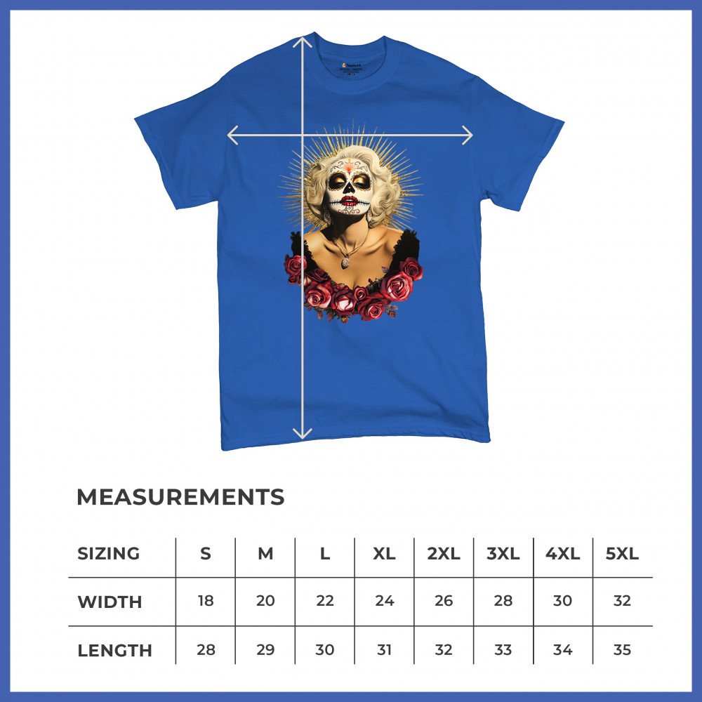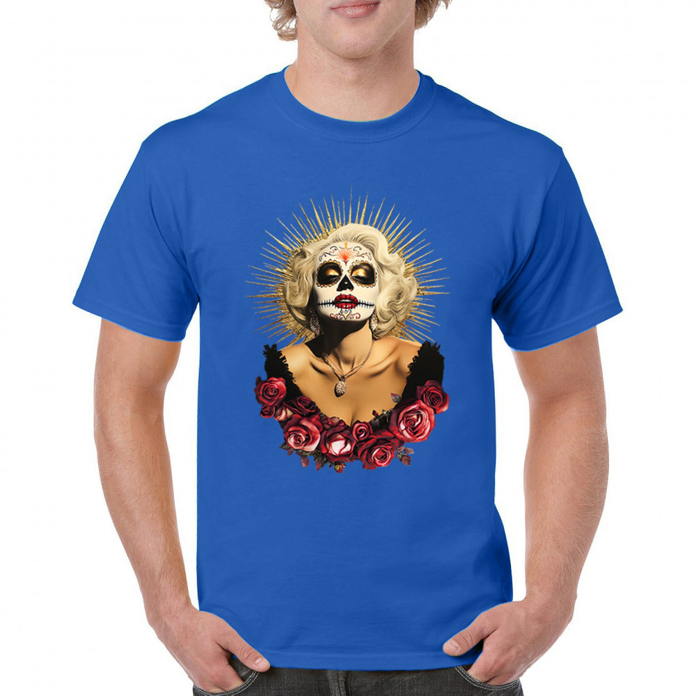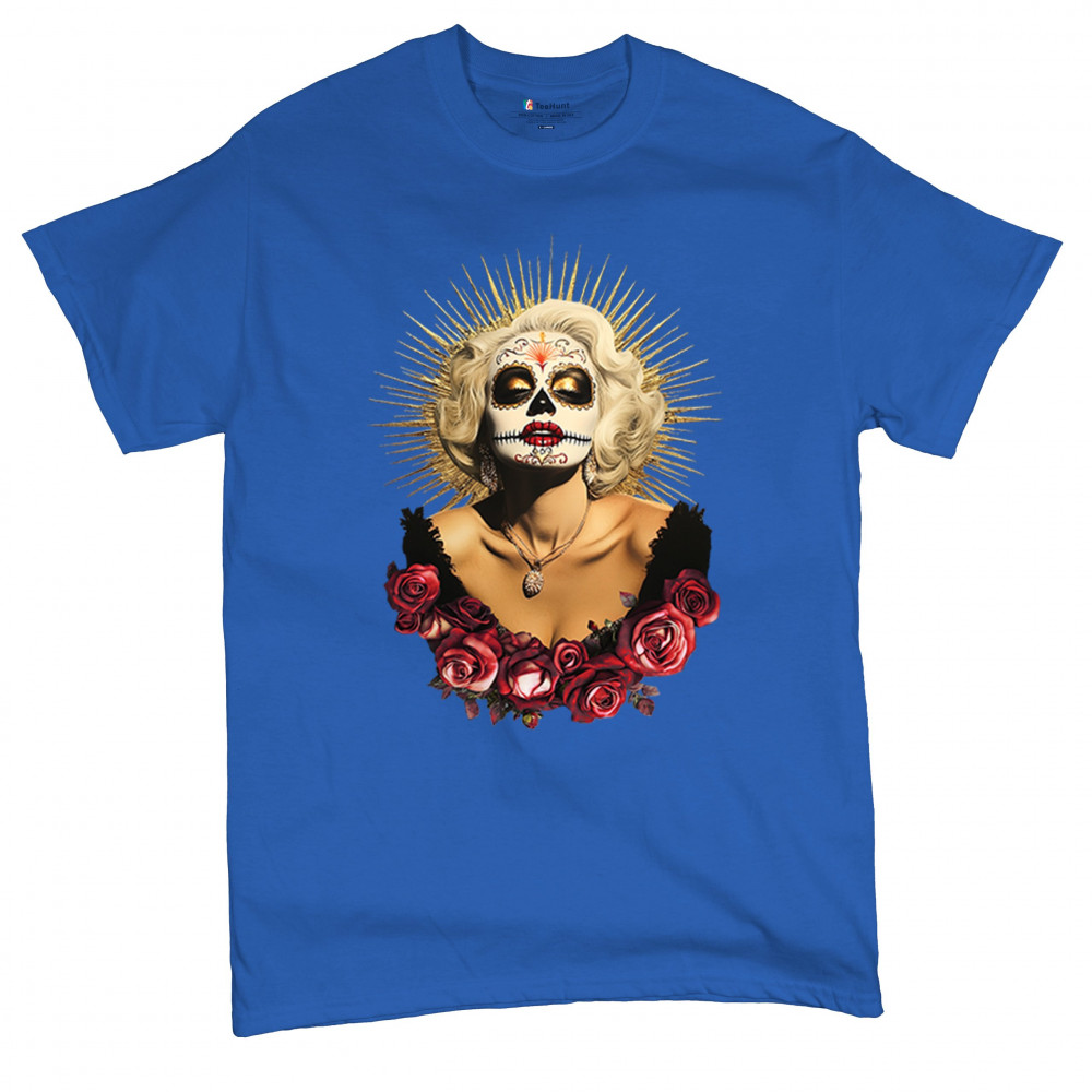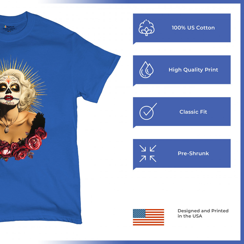 This bold and beautiful sugar skull design features a glamorous calavera woman crowned in a golden halo and framed by roses. A divine tribute to Dia de los Muertos, this look blends vintage glam, Latin culture, makeup artistry, and sacred symbolism. Perfect for fans of gothic beauty, Halloween, and heritage expression.