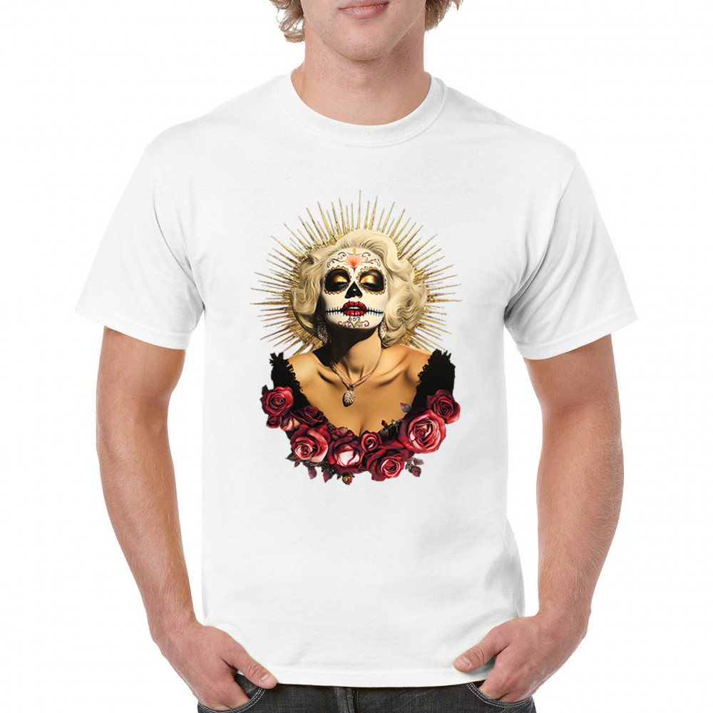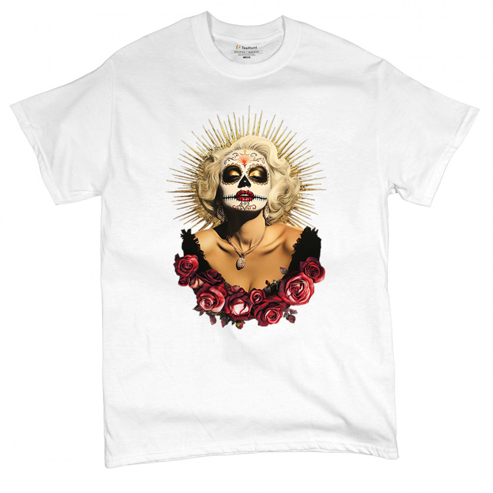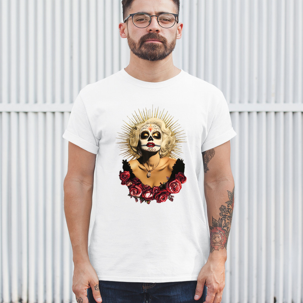 This bold and beautiful sugar skull design features a glamorous calavera woman crowned in a golden halo and framed by roses. A divine tribute to Dia de los Muertos, this look blends vintage glam, Latin culture, makeup artistry, and sacred symbolism. Perfect for fans of gothic beauty, Halloween, and heritage expression.