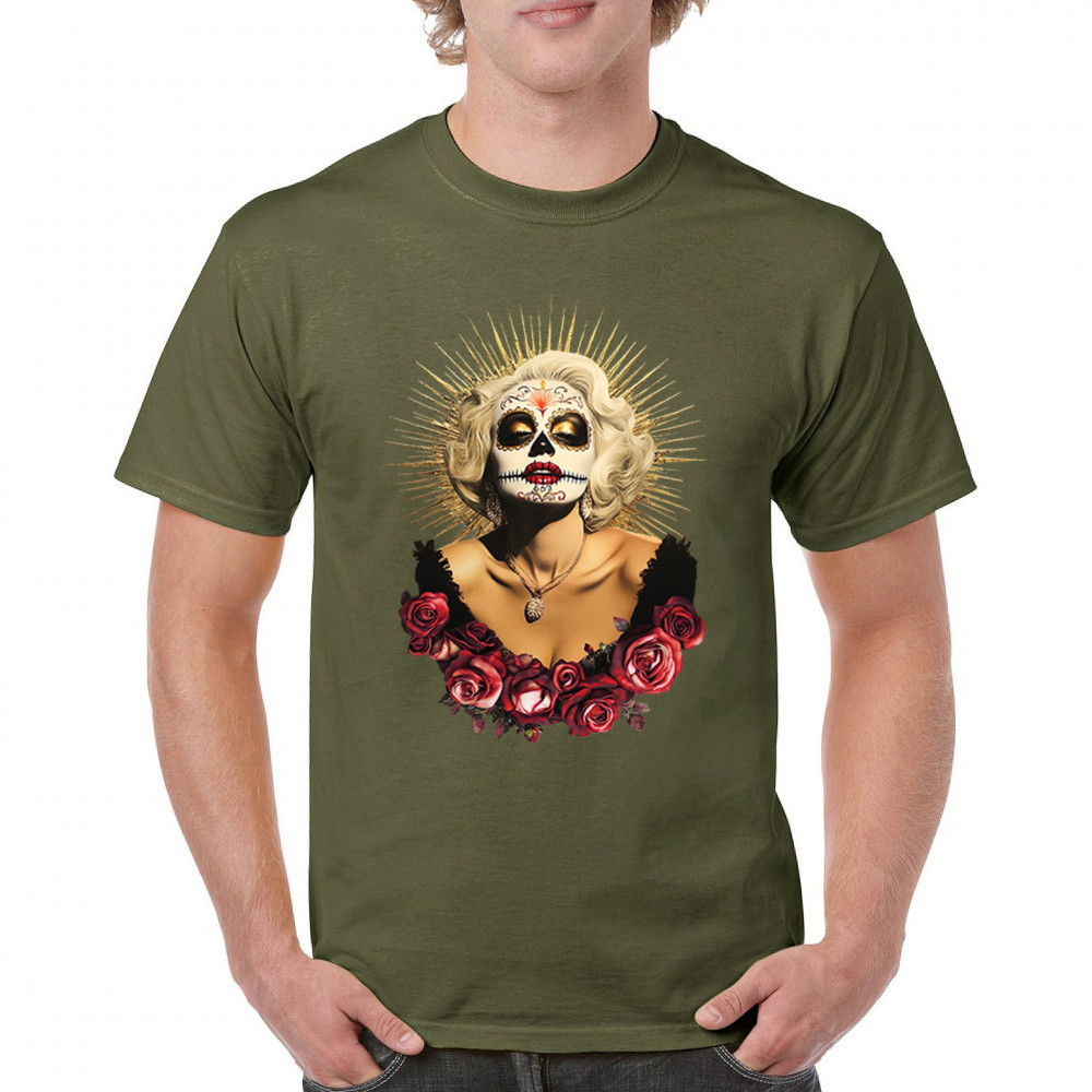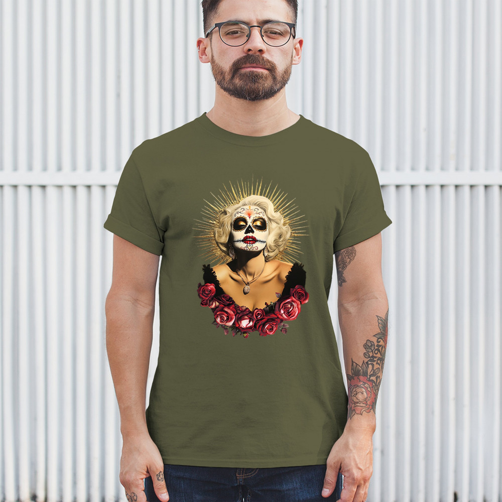 This bold and beautiful sugar skull design features a glamorous calavera woman crowned in a golden halo and framed by roses. A divine tribute to Dia de los Muertos, this look blends vintage glam, Latin culture, makeup artistry, and sacred symbolism. Perfect for fans of gothic beauty, Halloween, and heritage expression.
