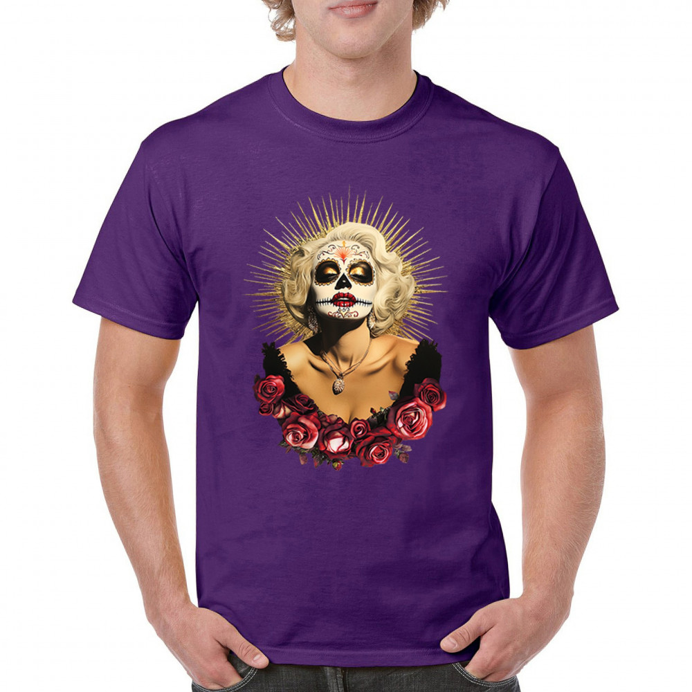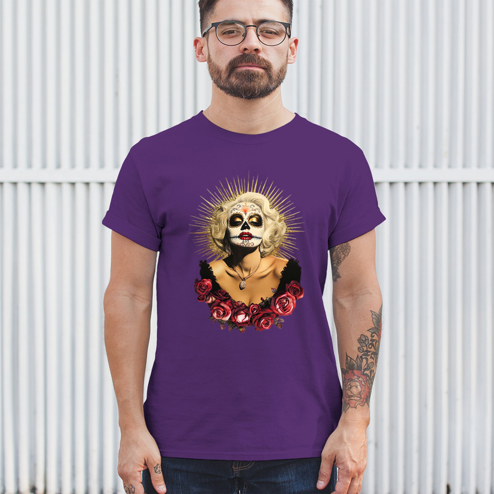 This bold and beautiful sugar skull design features a glamorous calavera woman crowned in a golden halo and framed by roses. A divine tribute to Dia de los Muertos, this look blends vintage glam, Latin culture, makeup artistry, and sacred symbolism. Perfect for fans of gothic beauty, Halloween, and heritage expression.