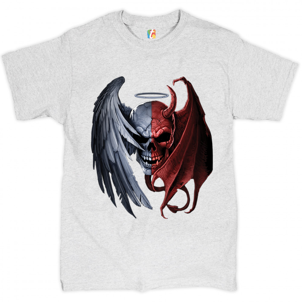 A print featuring a skull face, one half of which is light and has an angel's wing covering it and the other is dark with a horn sticking out of the forehead and a demon's wing. Below the skull you can see a demon's tail and a halo above it. A great