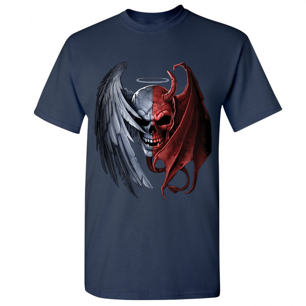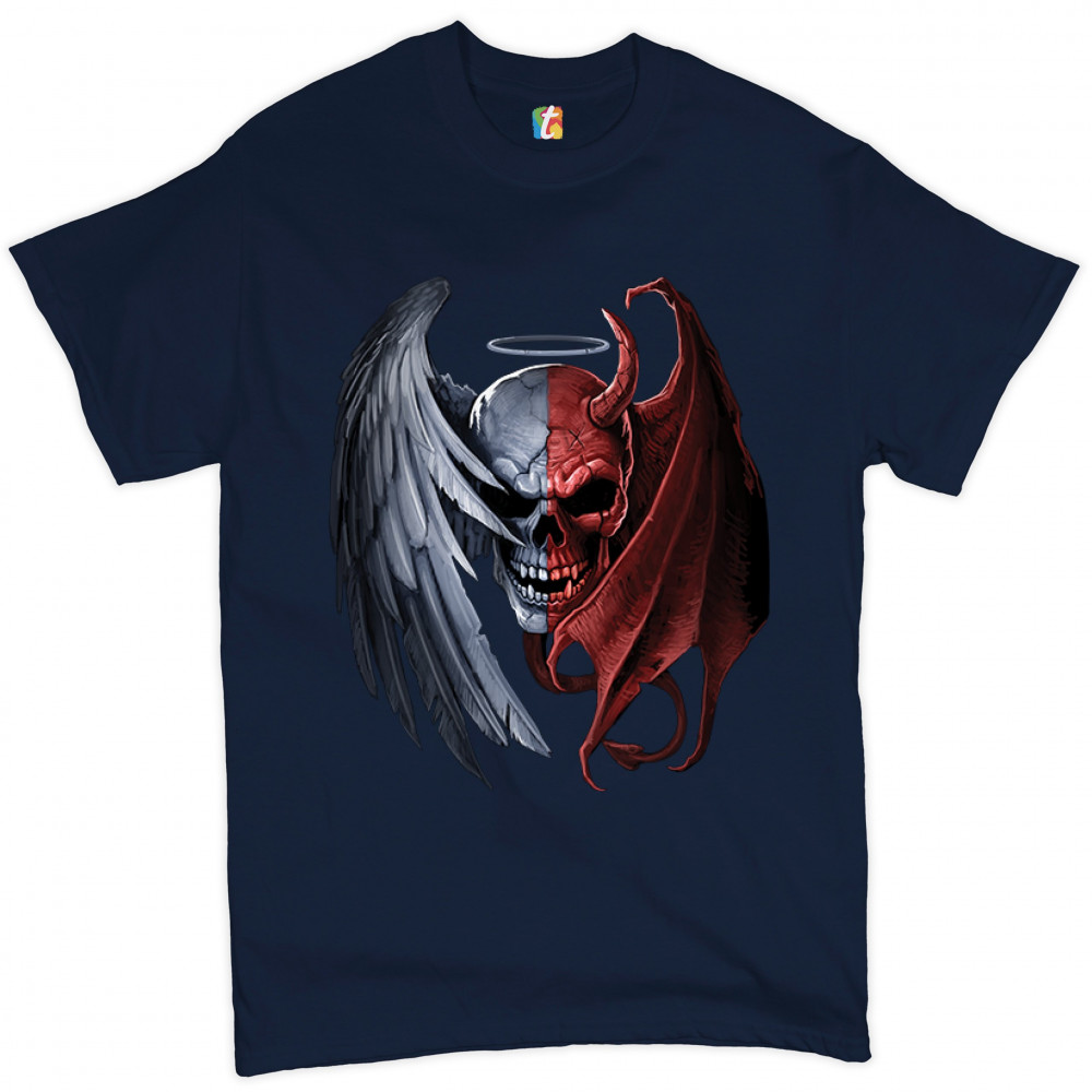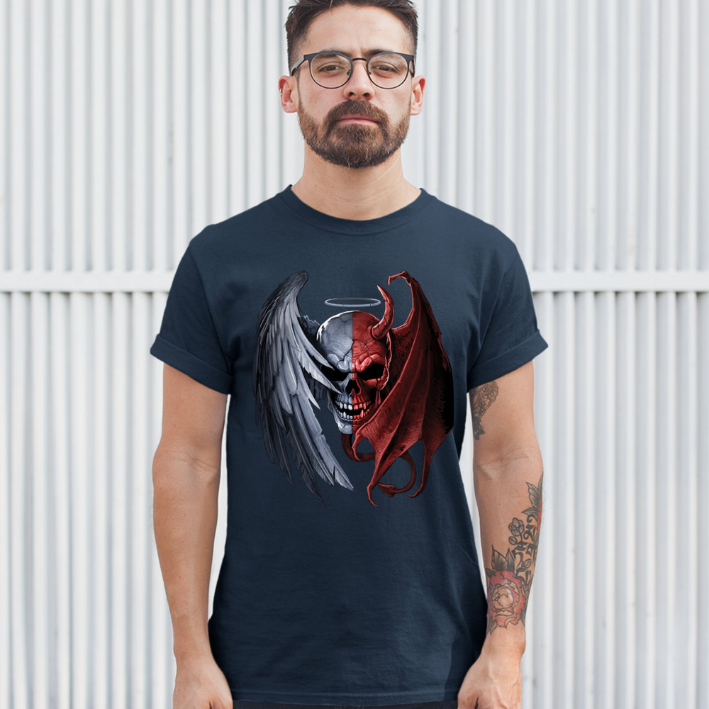 A print featuring a skull face, one half of which is light and has an angel's wing covering it and the other is dark with a horn sticking out of the forehead and a demon's wing. Below the skull you can see a demon's tail and a halo above it. A great