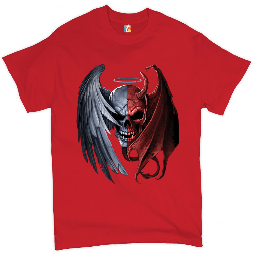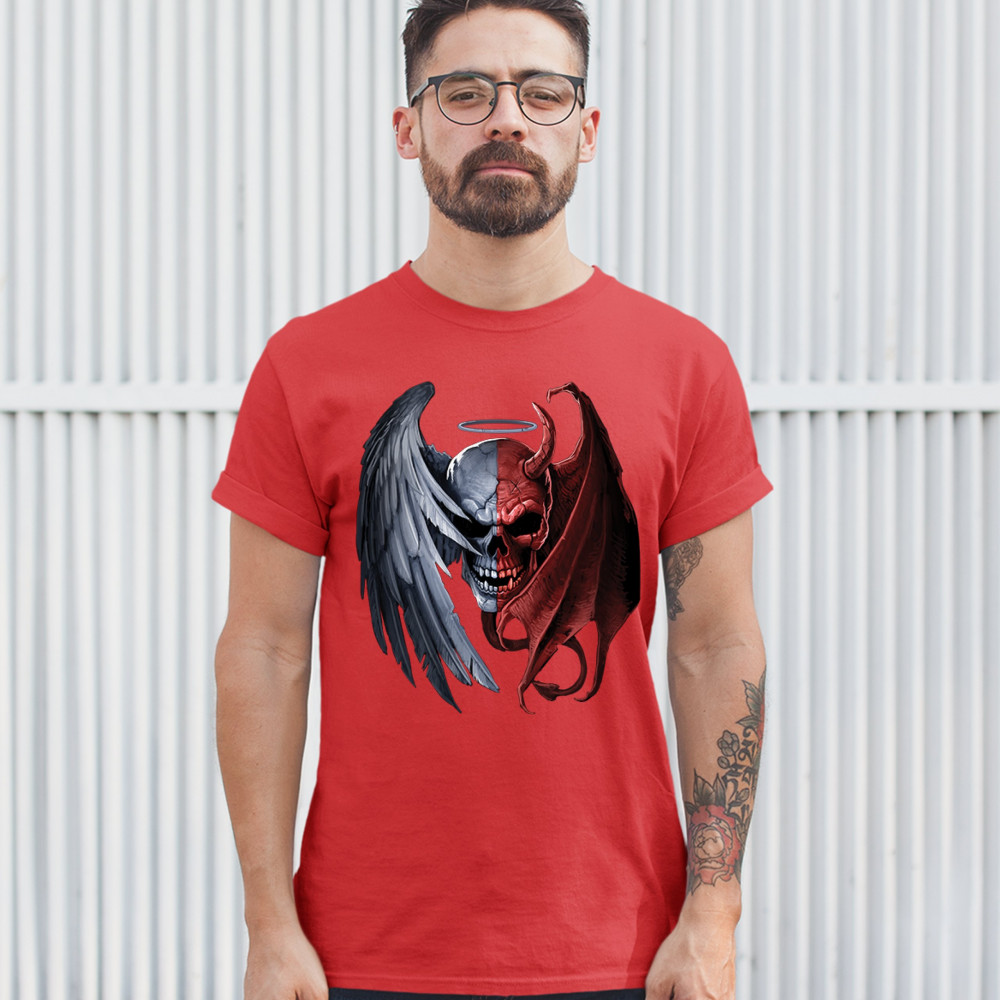 A print featuring a skull face, one half of which is light and has an angel's wing covering it and the other is dark with a horn sticking out of the forehead and a demon's wing. Below the skull you can see a demon's tail and a halo above it. A great