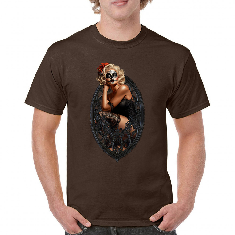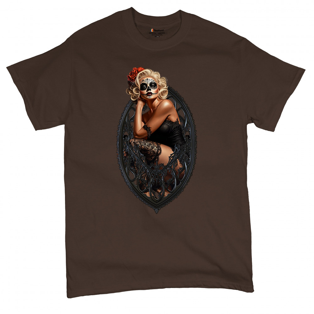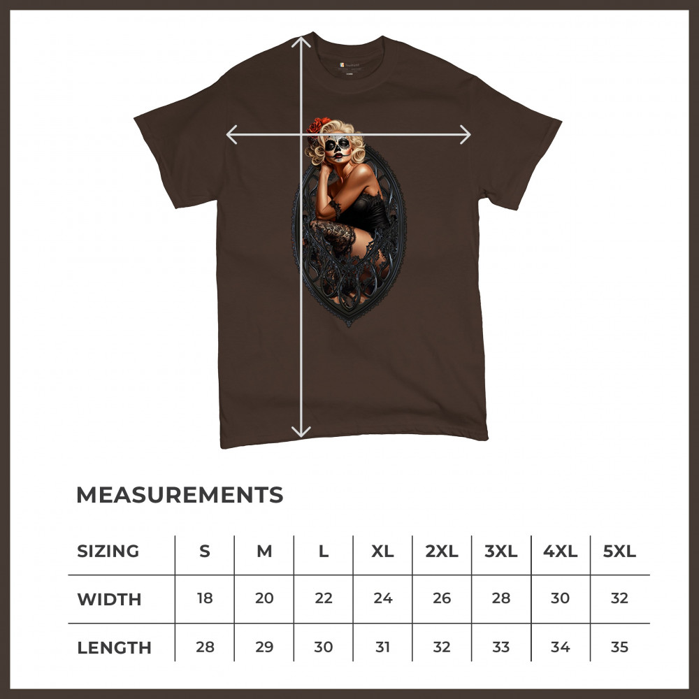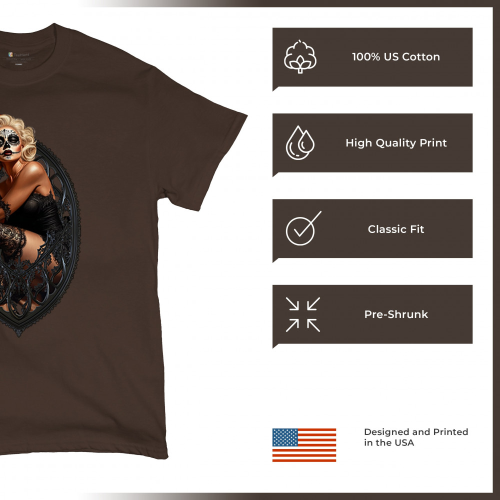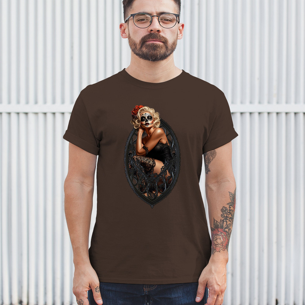 This sultry sugar skull pinup design blends gothic lace, seductive pose, and ornate frame detail for a bold Day of the Dead tribute. With striking makeup and vintage lingerie styling, it’s perfect for fans of macabre fashion, calavera art, and dark romance. A hauntingly beautiful mix of allure, attitude, and Dia de los Muertos charm.