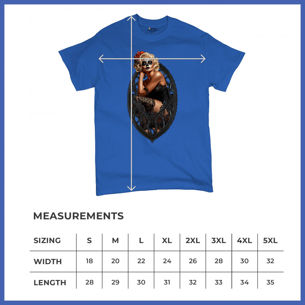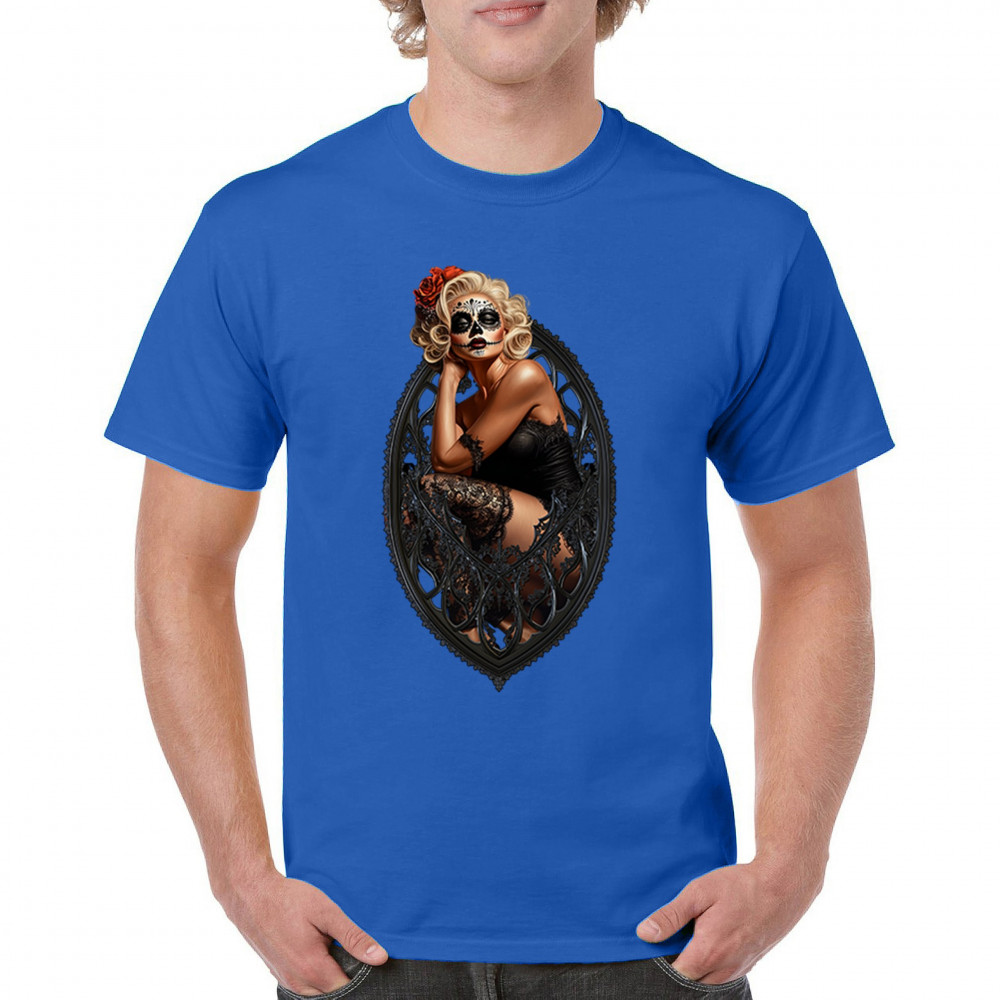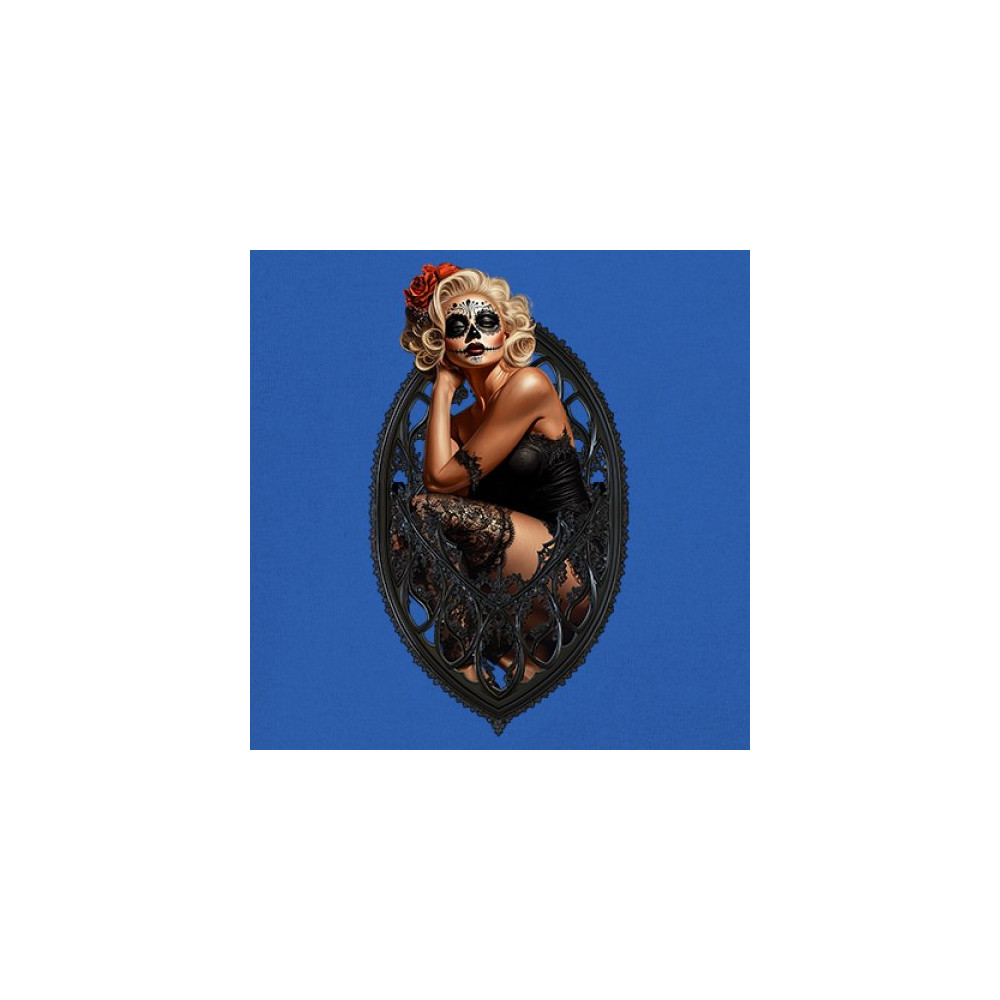 This sultry sugar skull pinup design blends gothic lace, seductive pose, and ornate frame detail for a bold Day of the Dead tribute. With striking makeup and vintage lingerie styling, it’s perfect for fans of macabre fashion, calavera art, and dark romance. A hauntingly beautiful mix of allure, attitude, and Dia de los Muertos charm.