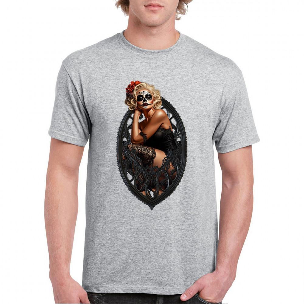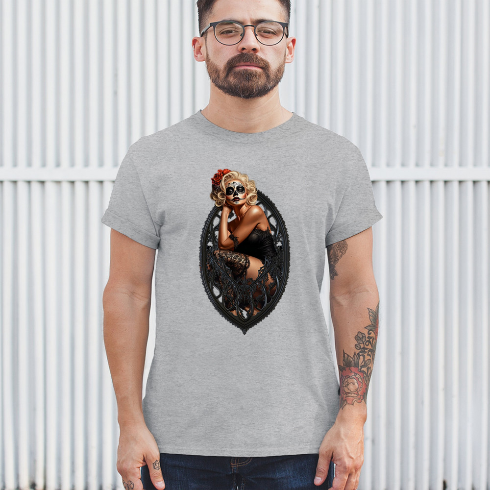 This sultry sugar skull pinup design blends gothic lace, seductive pose, and ornate frame detail for a bold Day of the Dead tribute. With striking makeup and vintage lingerie styling, it’s perfect for fans of macabre fashion, calavera art, and dark romance. A hauntingly beautiful mix of allure, attitude, and Dia de los Muertos charm.
