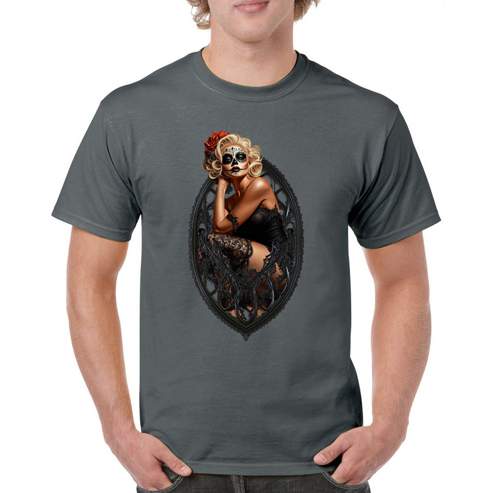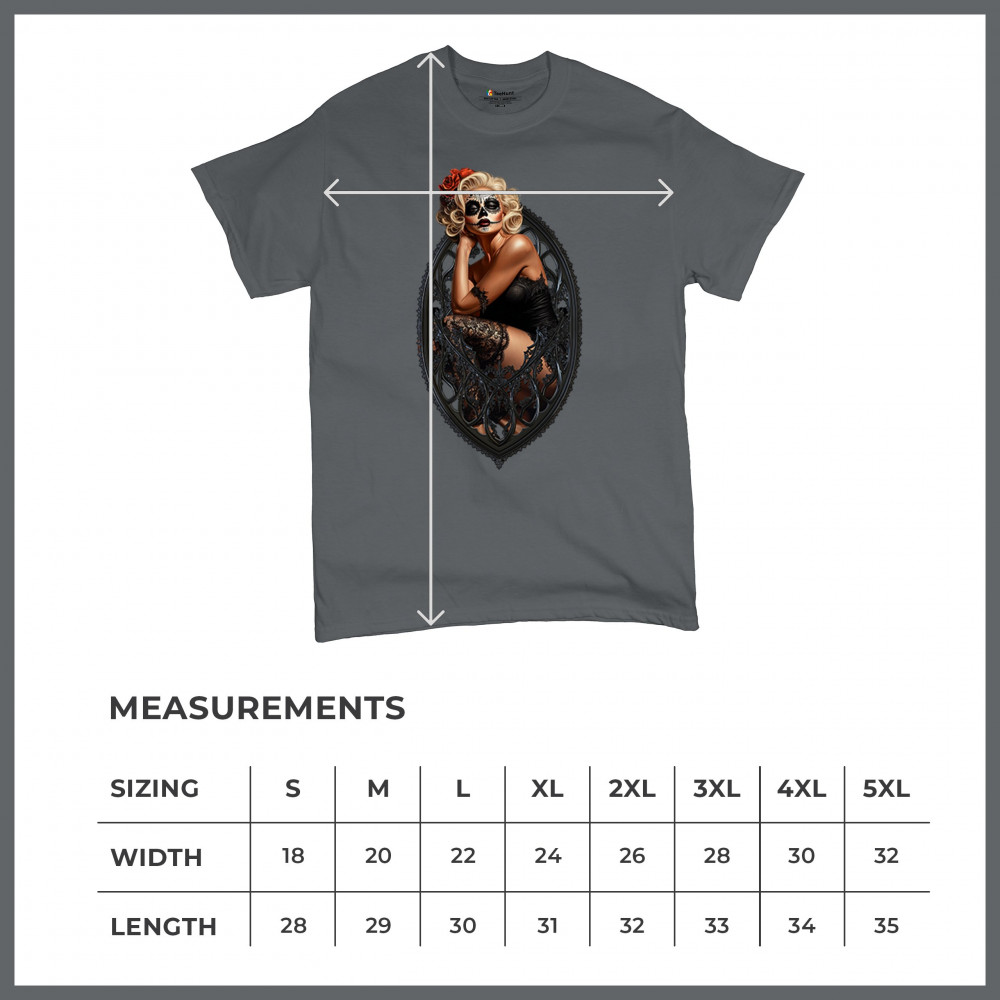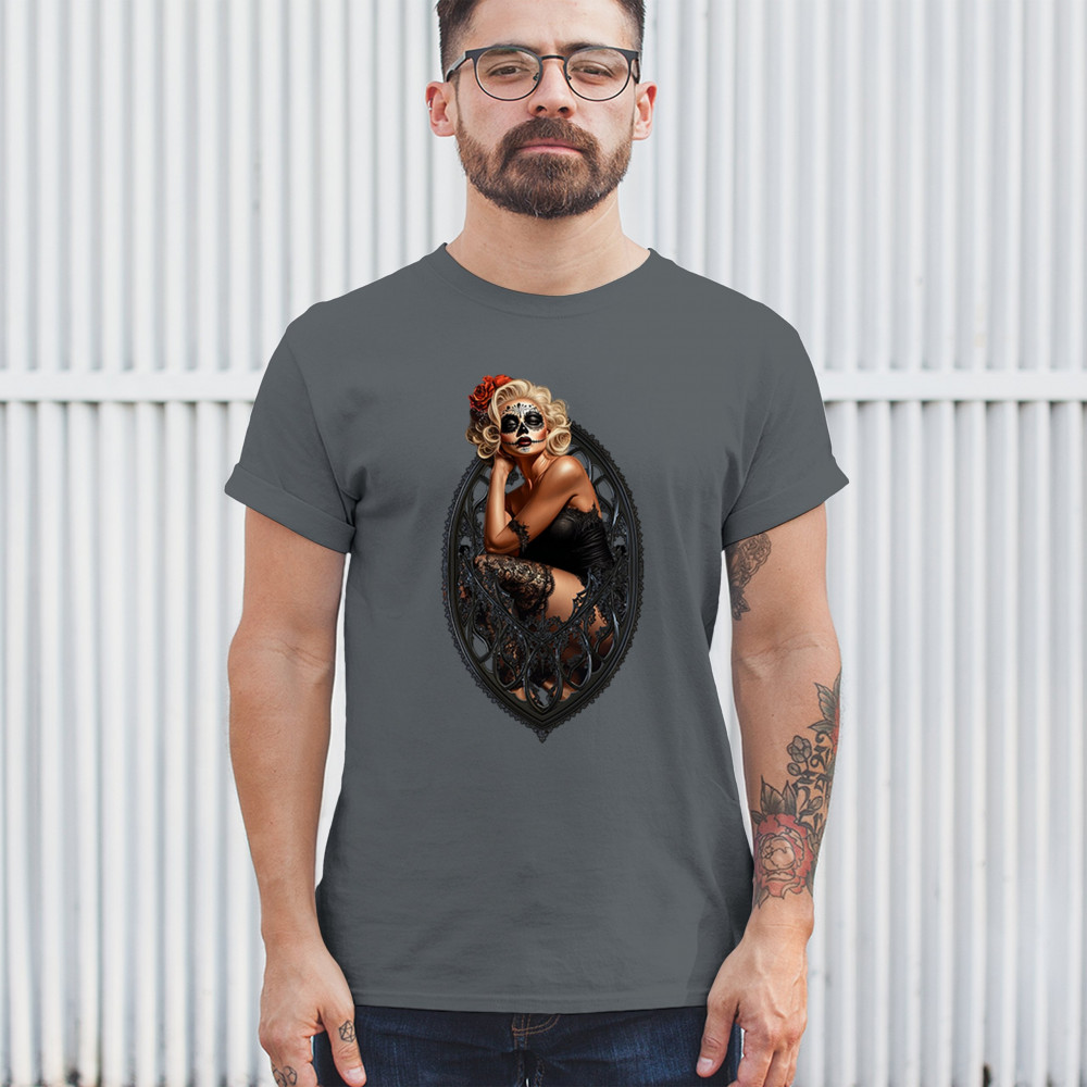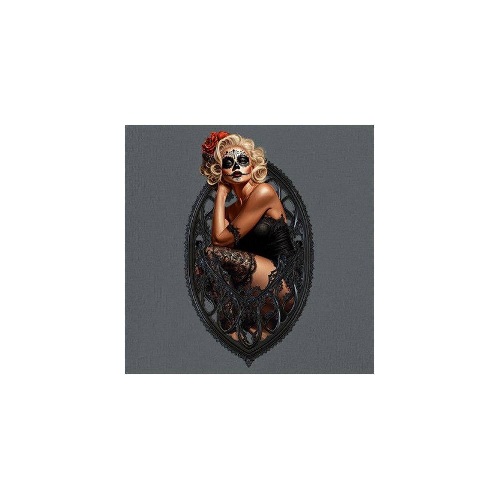 This sultry sugar skull pinup design blends gothic lace, seductive pose, and ornate frame detail for a bold Day of the Dead tribute. With striking makeup and vintage lingerie styling, it’s perfect for fans of macabre fashion, calavera art, and dark romance. A hauntingly beautiful mix of allure, attitude, and Dia de los Muertos charm.
