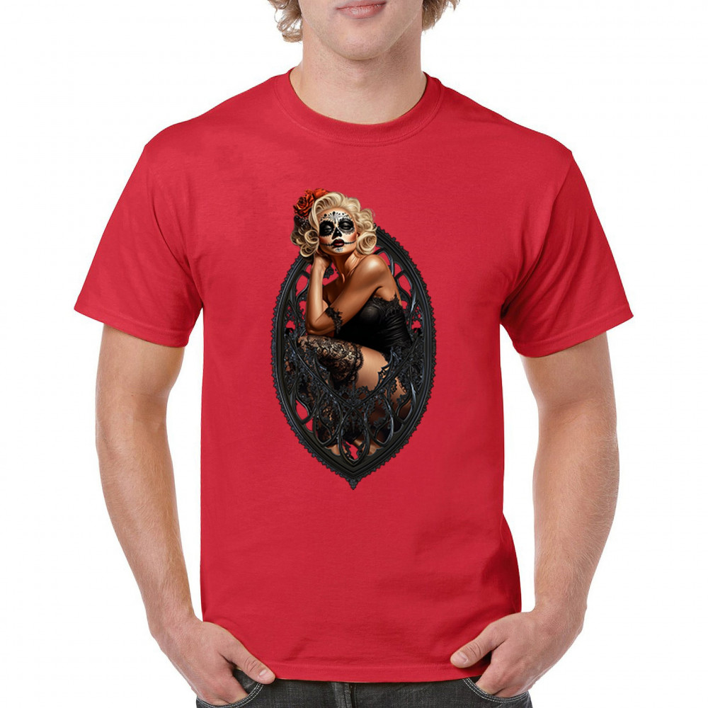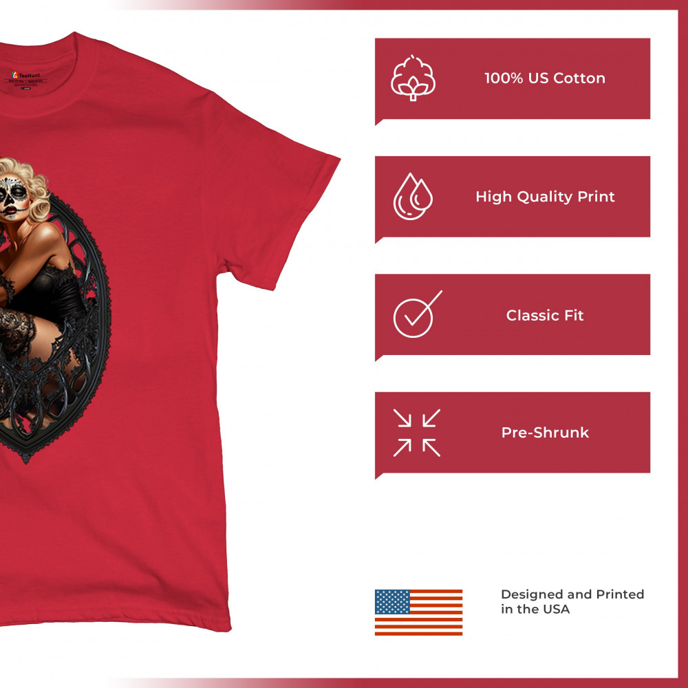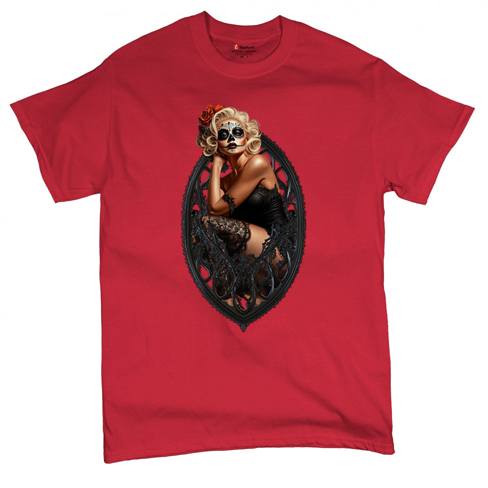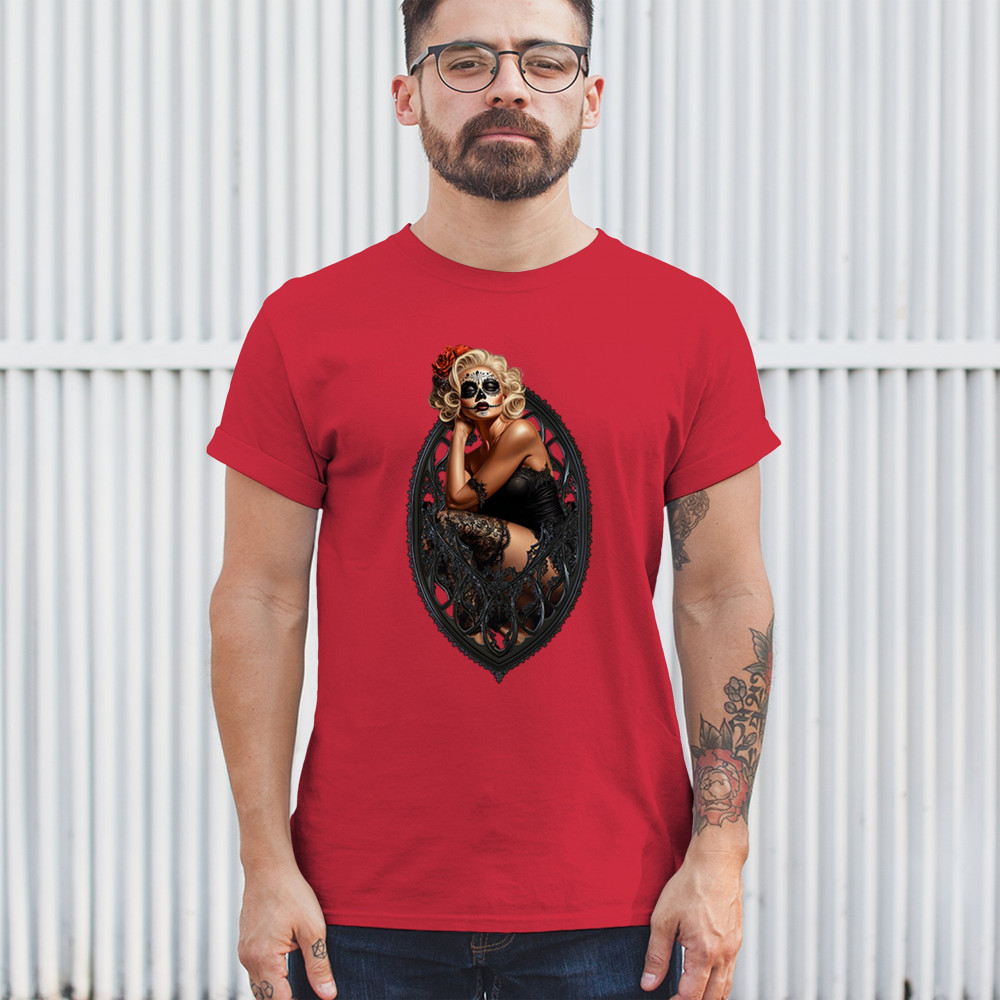 This sultry sugar skull pinup design blends gothic lace, seductive pose, and ornate frame detail for a bold Day of the Dead tribute. With striking makeup and vintage lingerie styling, it’s perfect for fans of macabre fashion, calavera art, and dark romance. A hauntingly beautiful mix of allure, attitude, and Dia de los Muertos charm.