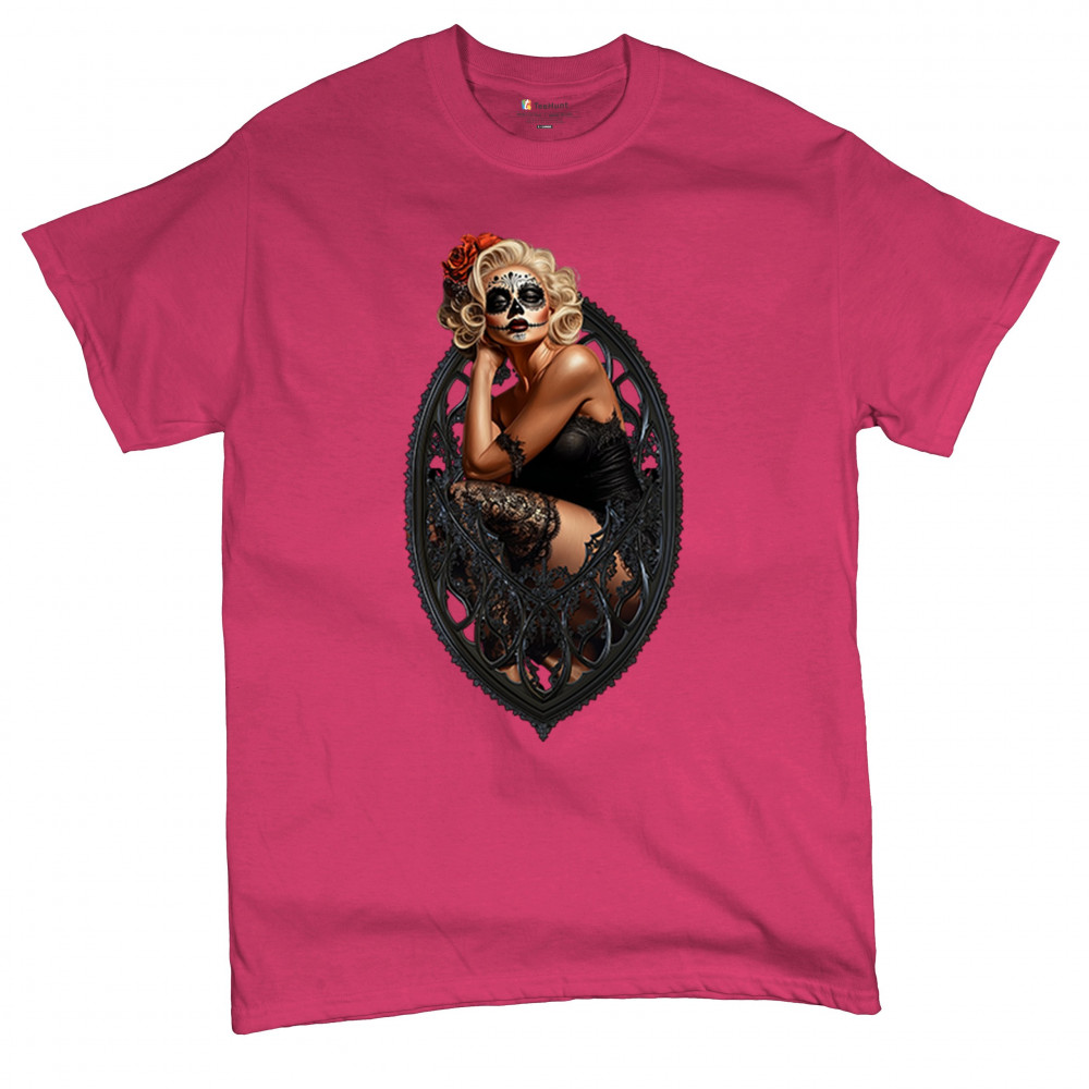 This sultry sugar skull pinup design blends gothic lace, seductive pose, and ornate frame detail for a bold Day of the Dead tribute. With striking makeup and vintage lingerie styling, it’s perfect for fans of macabre fashion, calavera art, and dark romance. A hauntingly beautiful mix of allure, attitude, and Dia de los Muertos charm.