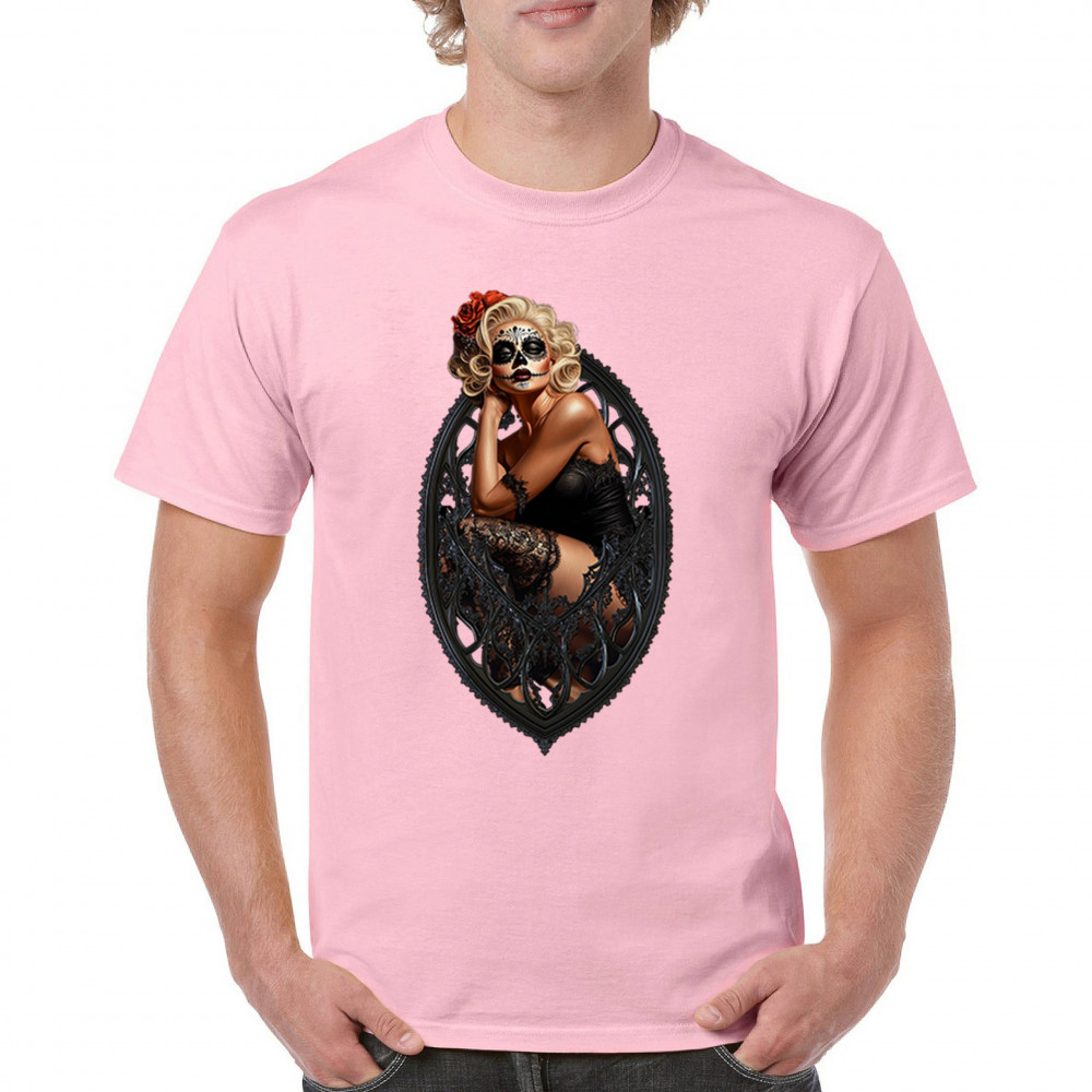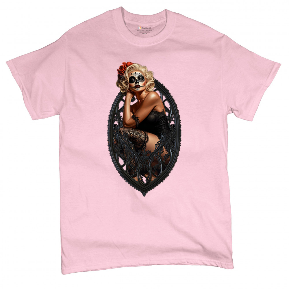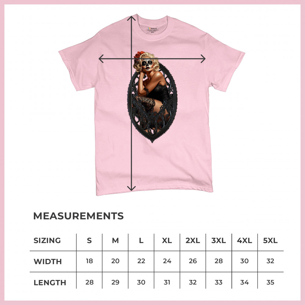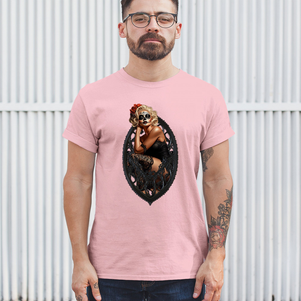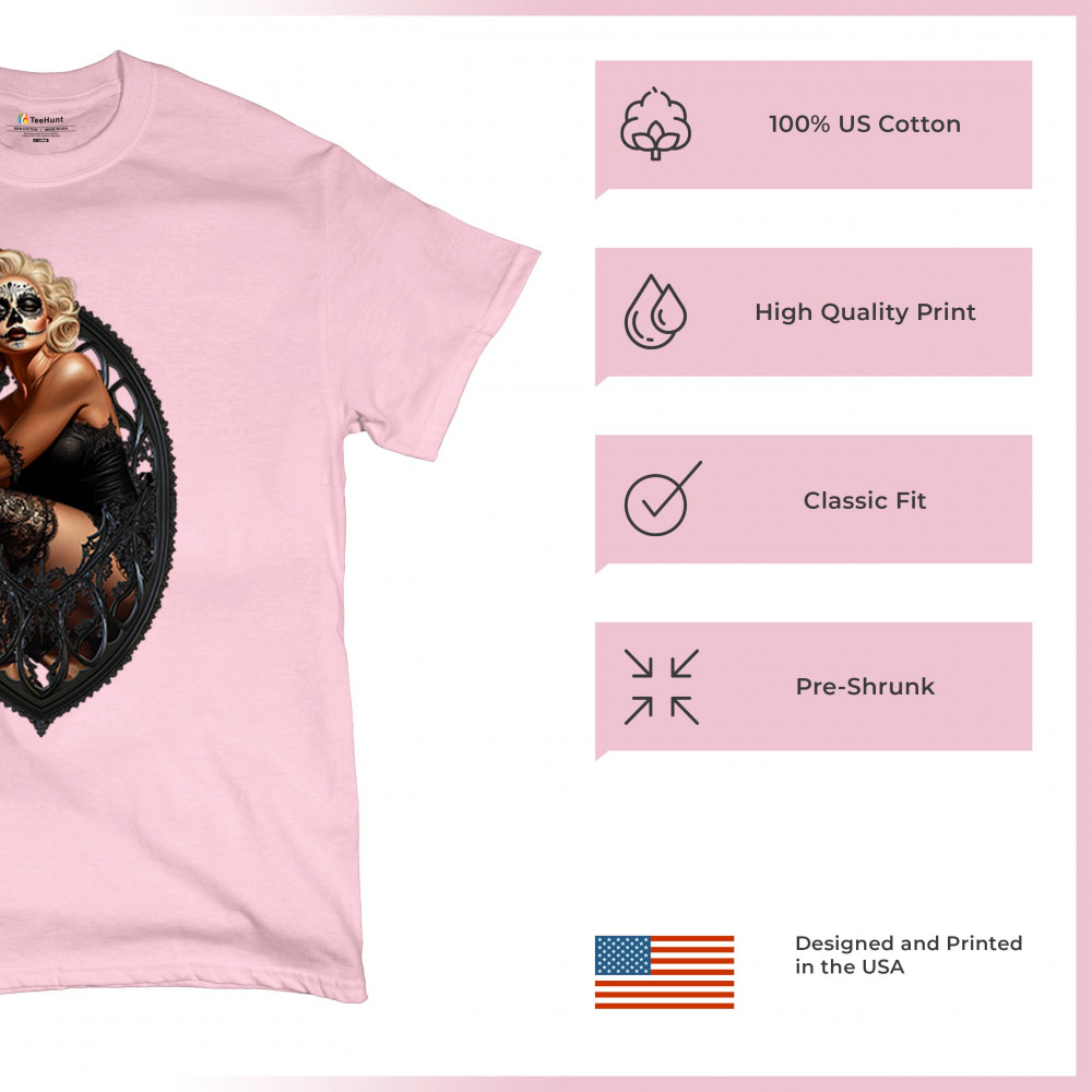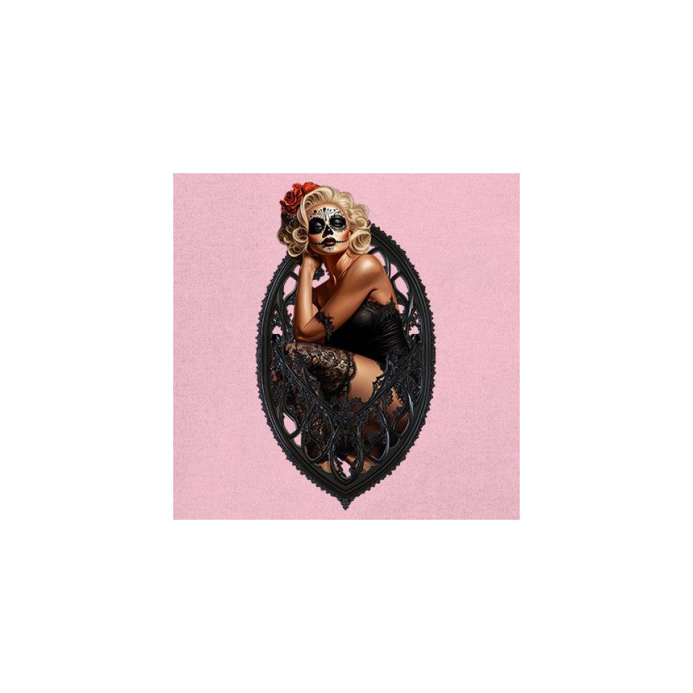 This sultry sugar skull pinup design blends gothic lace, seductive pose, and ornate frame detail for a bold Day of the Dead tribute. With striking makeup and vintage lingerie styling, it’s perfect for fans of macabre fashion, calavera art, and dark romance. A hauntingly beautiful mix of allure, attitude, and Dia de los Muertos charm.