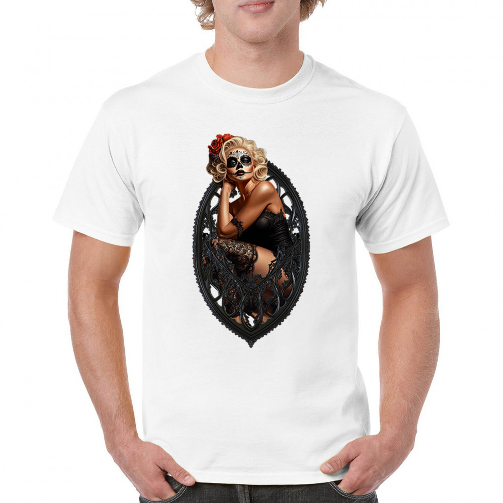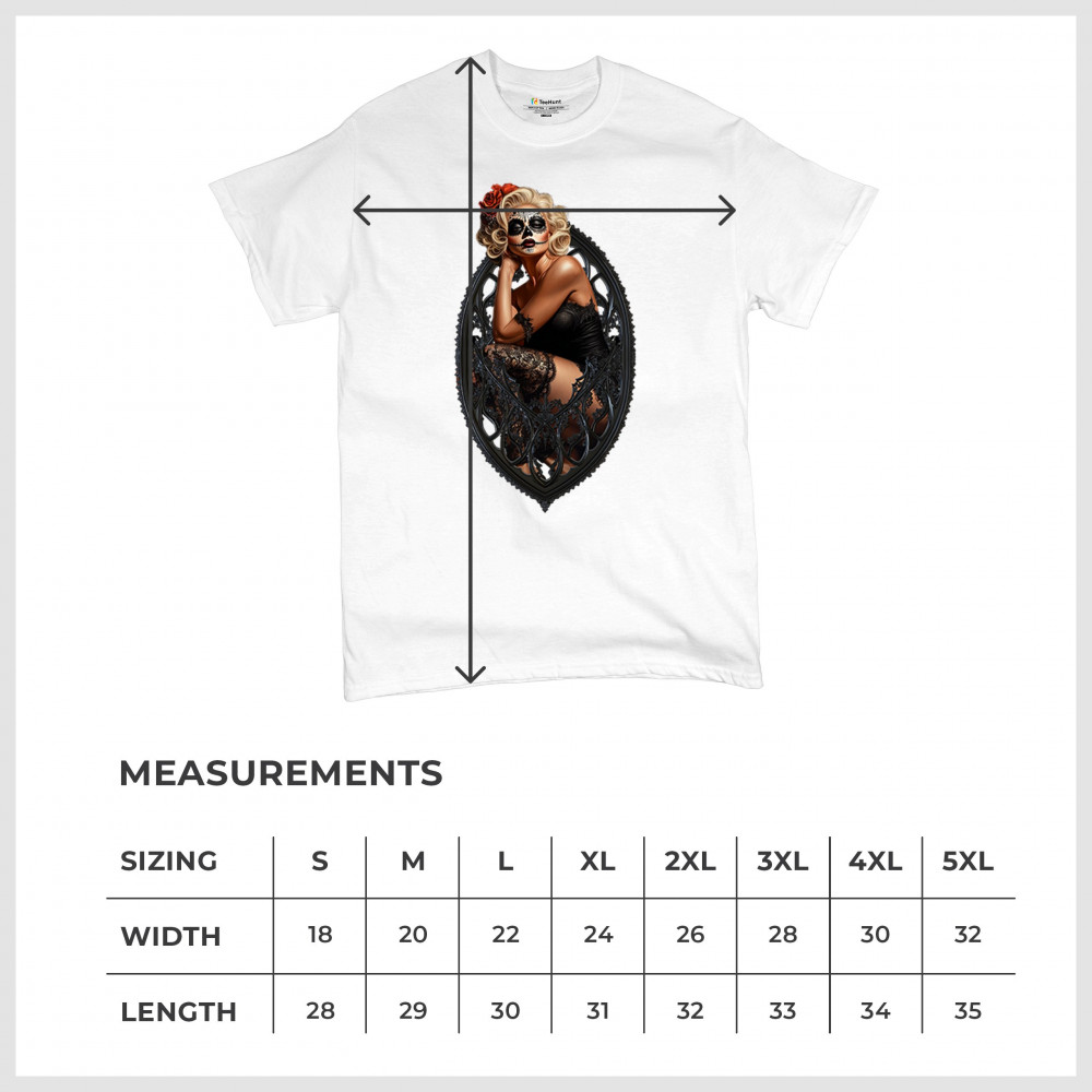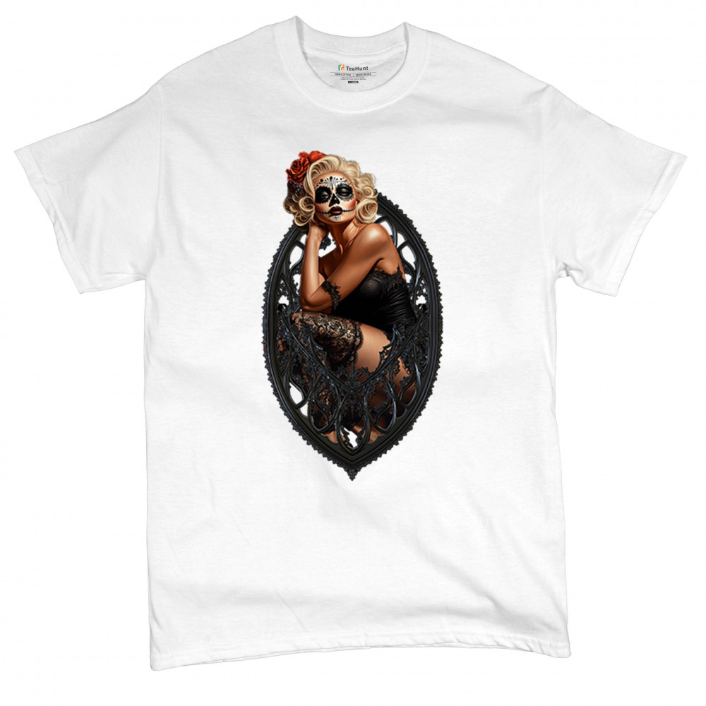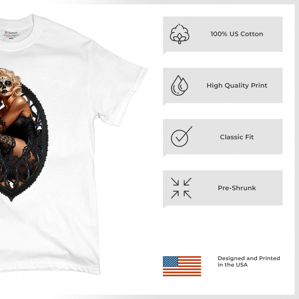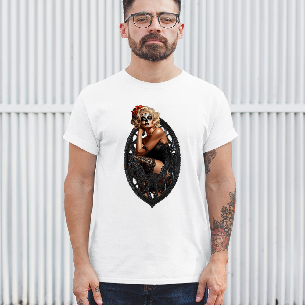 This sultry sugar skull pinup design blends gothic lace, seductive pose, and ornate frame detail for a bold Day of the Dead tribute. With striking makeup and vintage lingerie styling, it’s perfect for fans of macabre fashion, calavera art, and dark romance. A hauntingly beautiful mix of allure, attitude, and Dia de los Muertos charm.