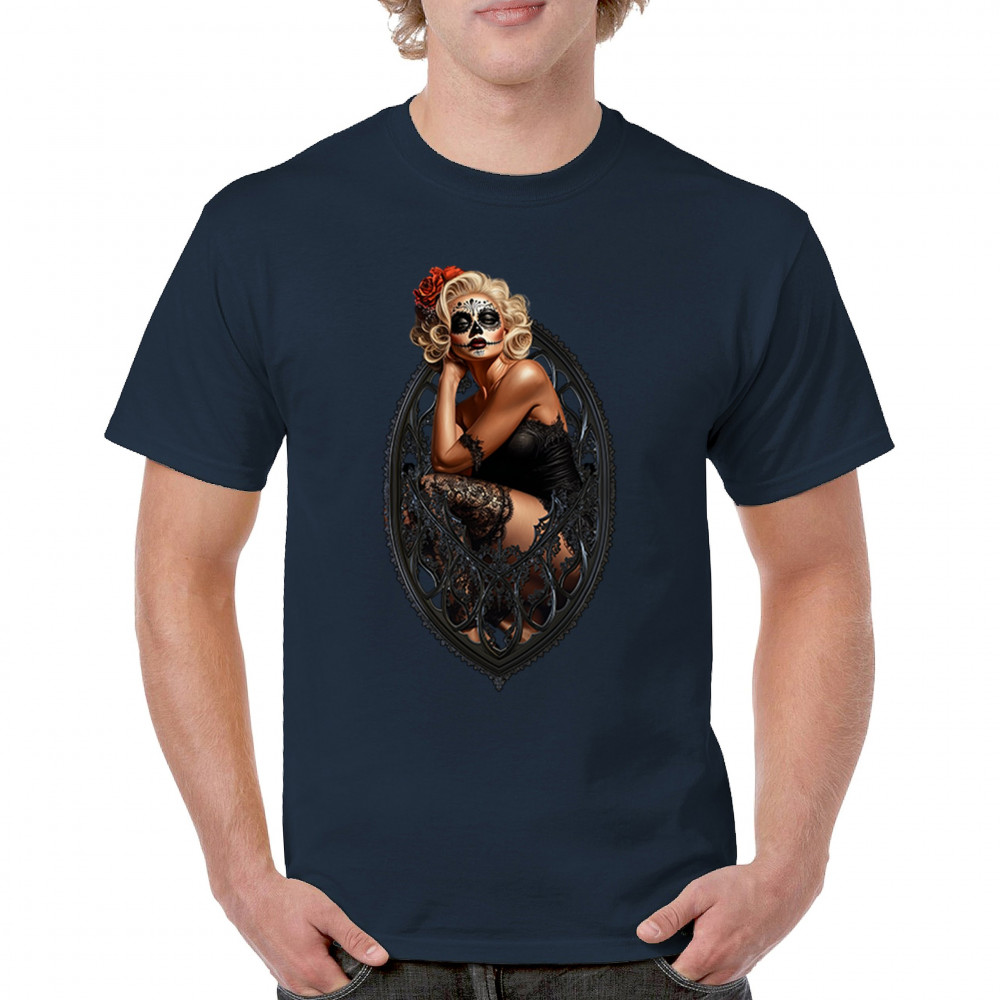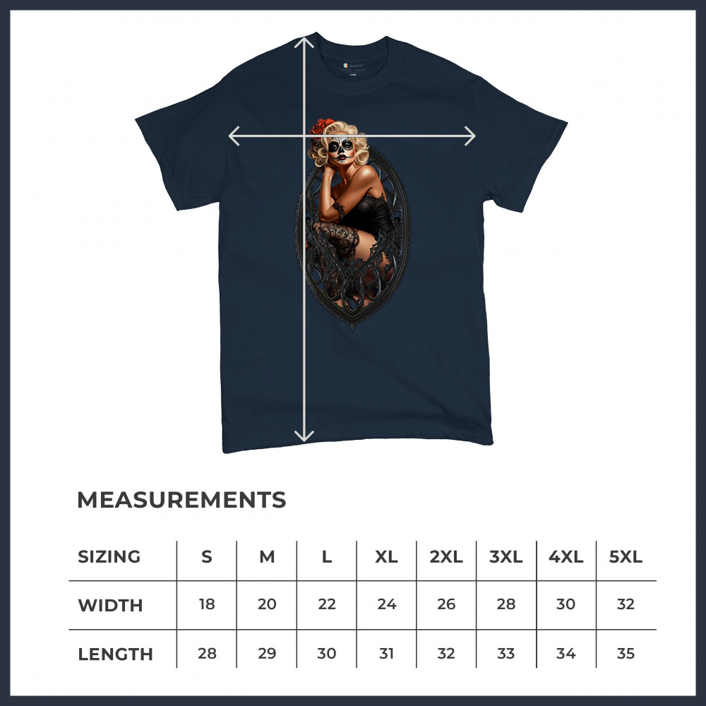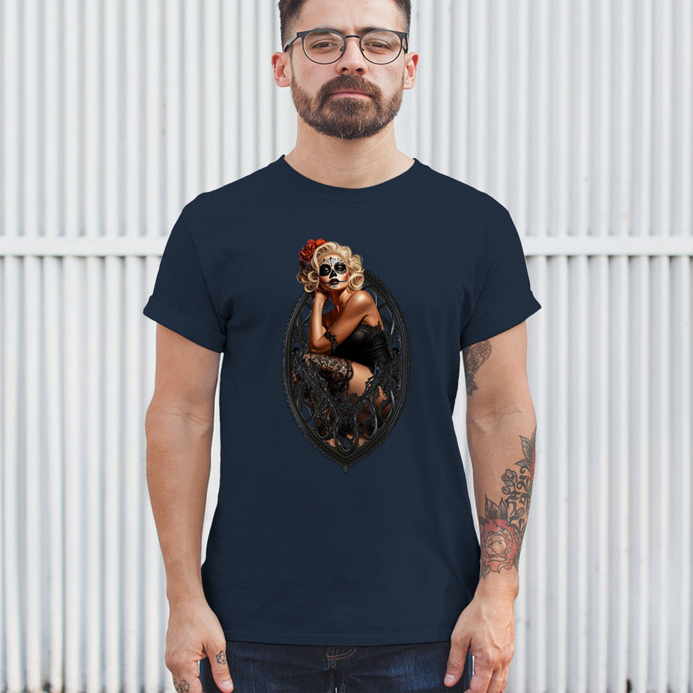 This sultry sugar skull pinup design blends gothic lace, seductive pose, and ornate frame detail for a bold Day of the Dead tribute. With striking makeup and vintage lingerie styling, it’s perfect for fans of macabre fashion, calavera art, and dark romance. A hauntingly beautiful mix of allure, attitude, and Dia de los Muertos charm.