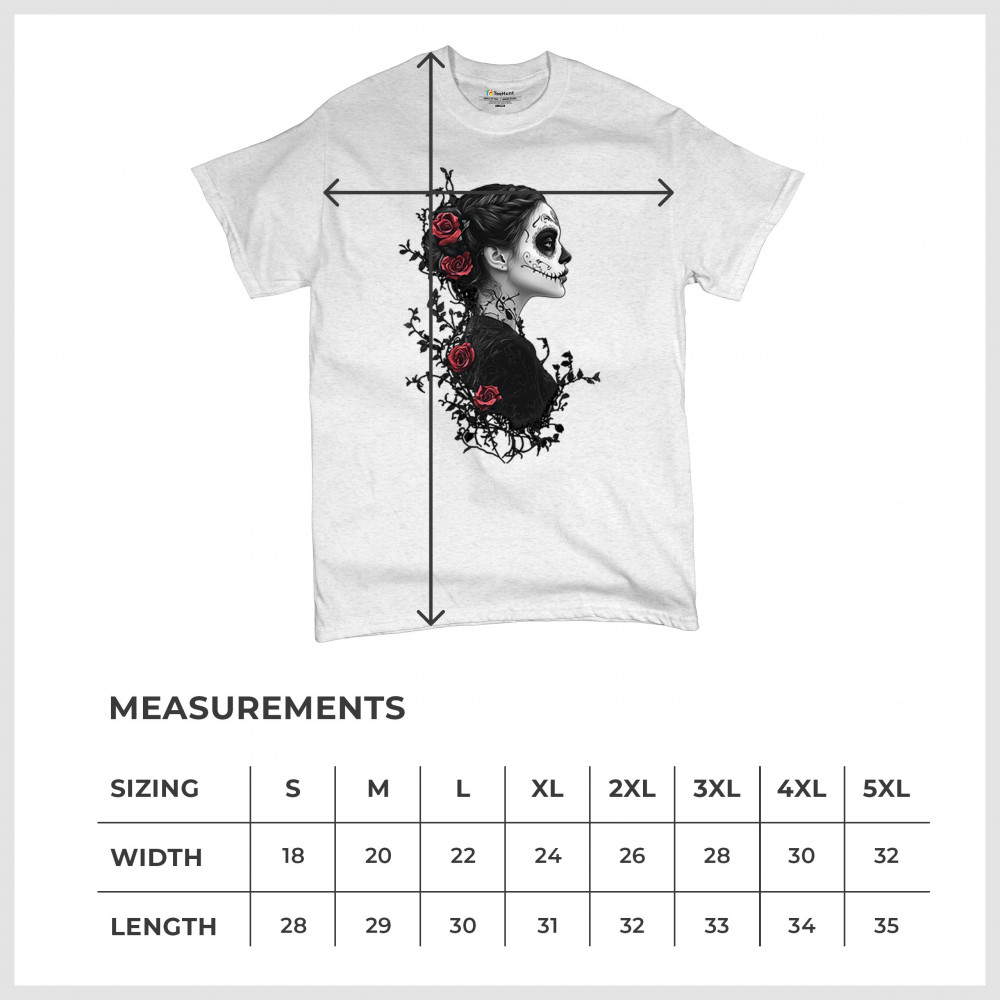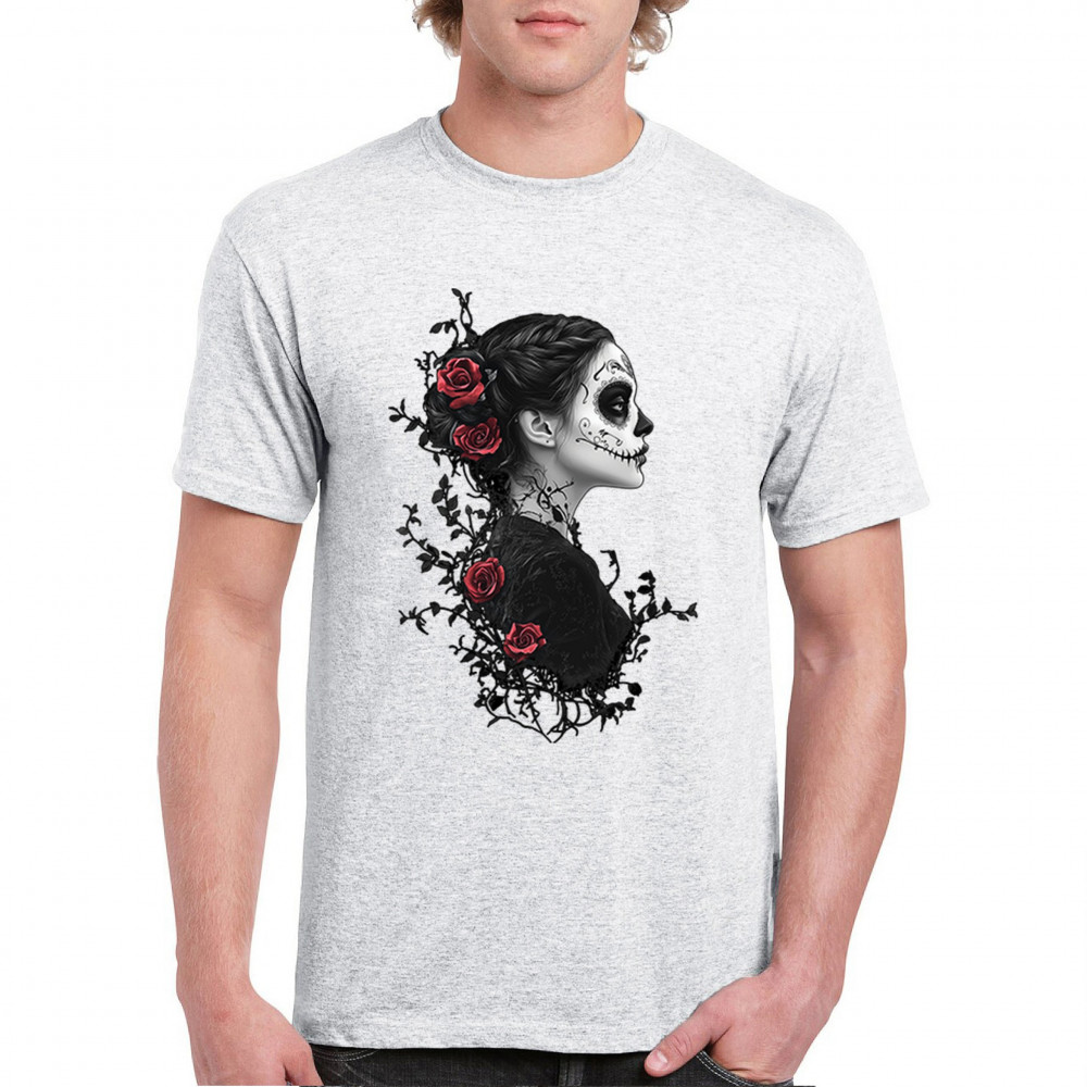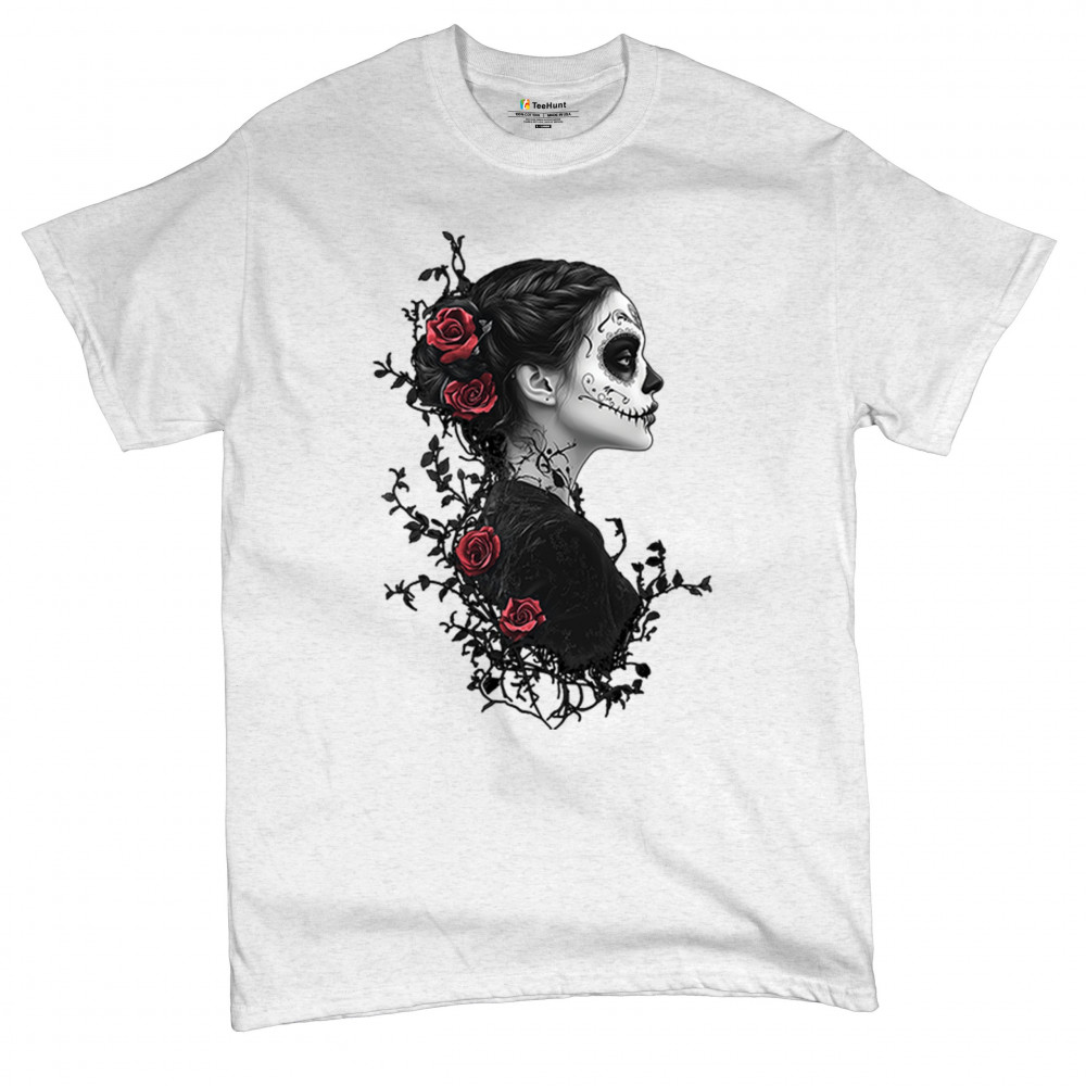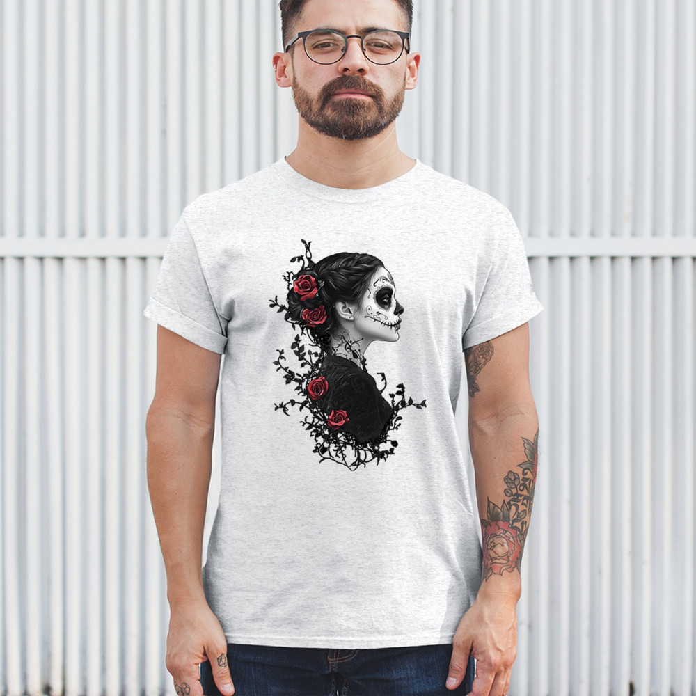 Celebrate Dia de los Muertos in style with this refined sugar skull woman design. Featuring a side profile view, vibrant red roses, and dark gothic floral elements, it creates a graceful balance between mystery and beauty. Ideal for fans of macabre art, skull themes, and honoring ancestral traditions through elegant visuals.