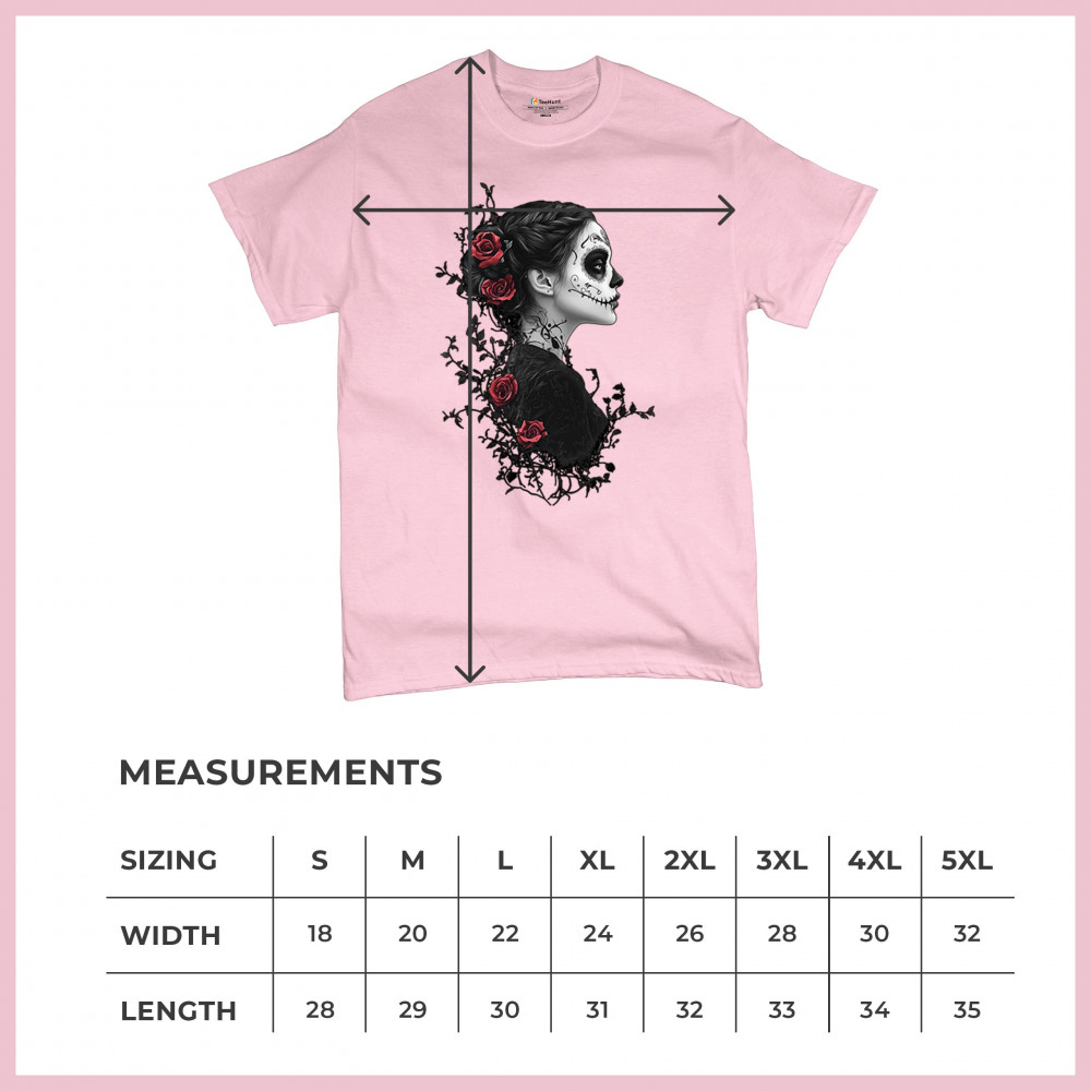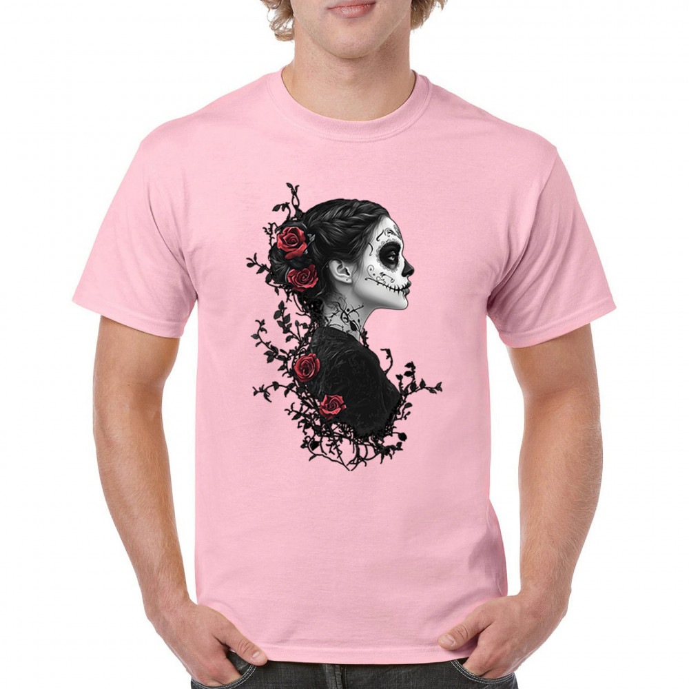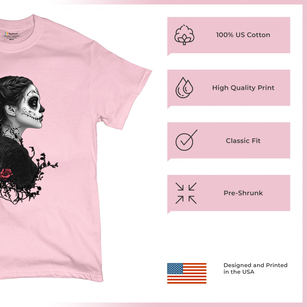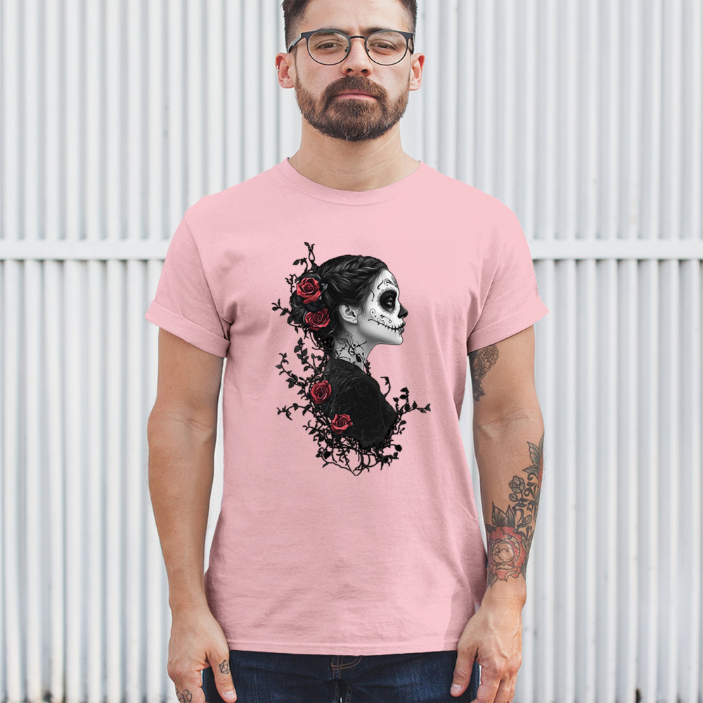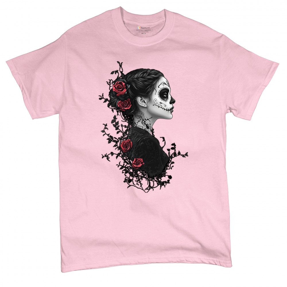 Celebrate Dia de los Muertos in style with this refined sugar skull woman design. Featuring a side profile view, vibrant red roses, and dark gothic floral elements, it creates a graceful balance between mystery and beauty. Ideal for fans of macabre art, skull themes, and honoring ancestral traditions through elegant visuals.