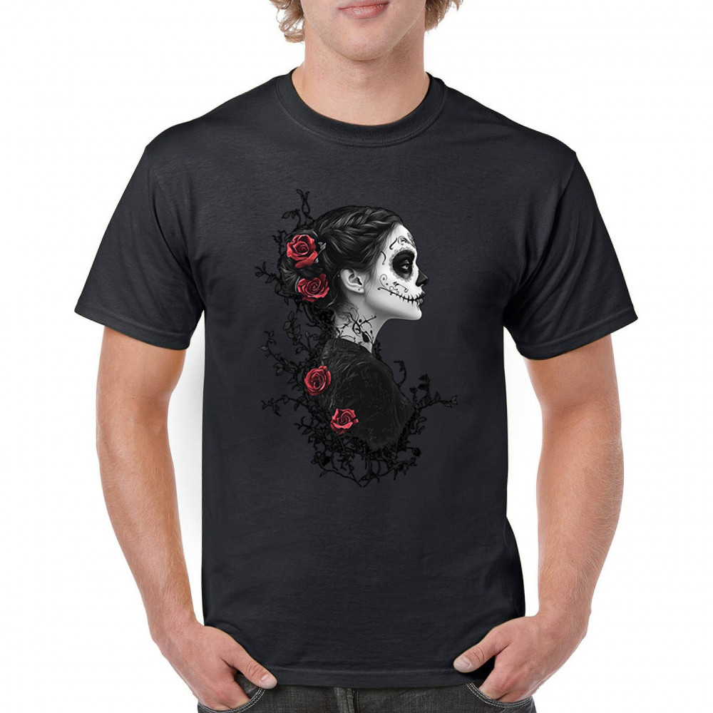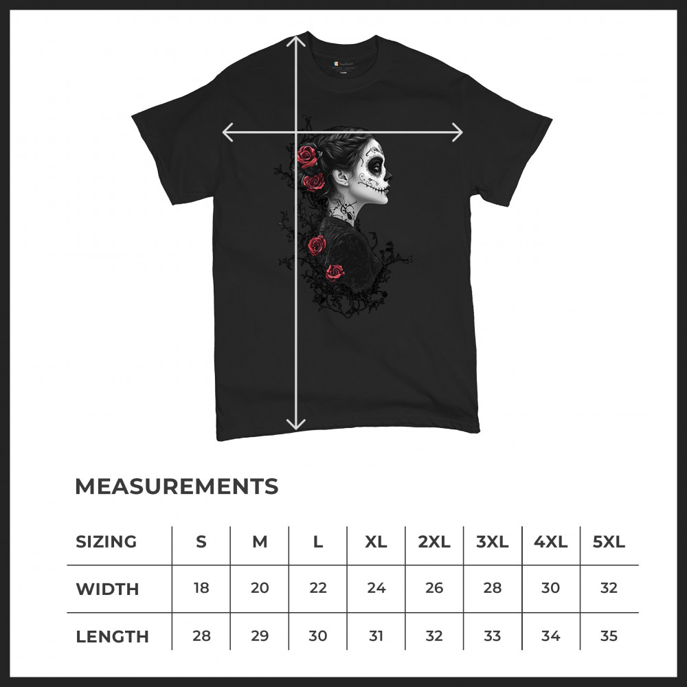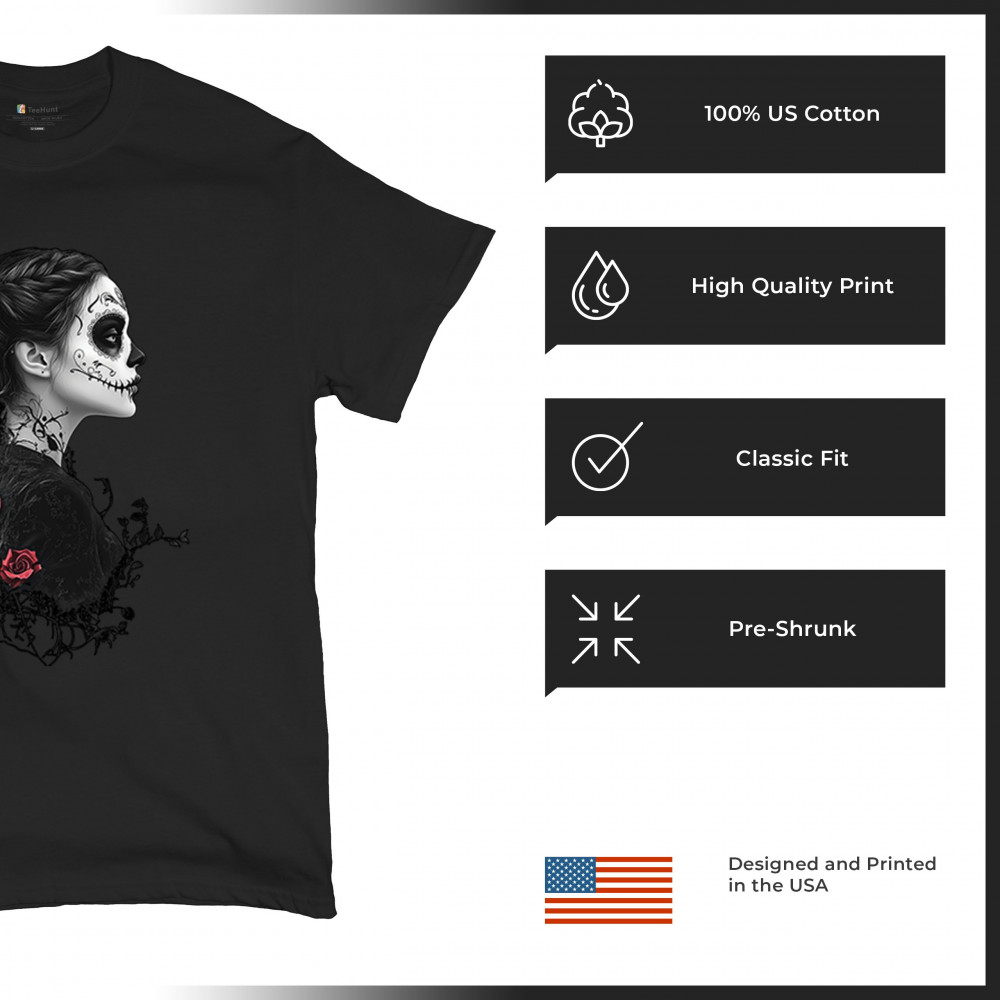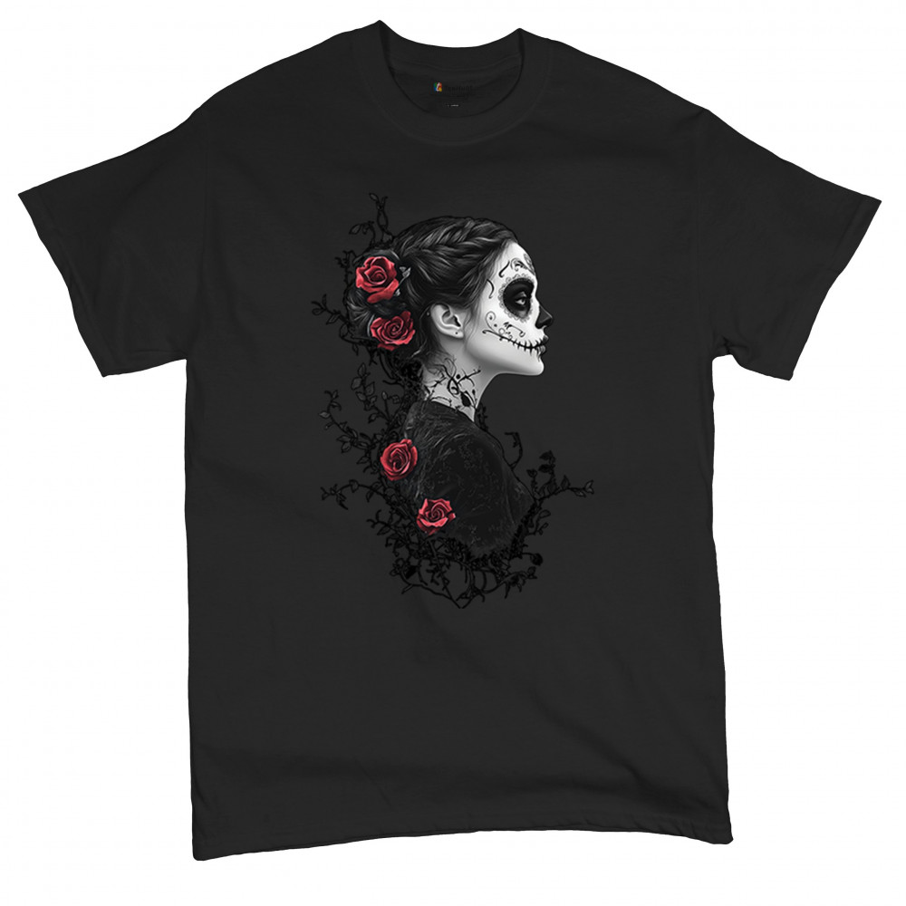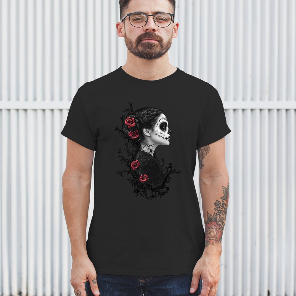 Celebrate Dia de los Muertos in style with this refined sugar skull woman design. Featuring a side profile view, vibrant red roses, and dark gothic floral elements, it creates a graceful balance between mystery and beauty. Ideal for fans of macabre art, skull themes, and honoring ancestral traditions through elegant visuals.
