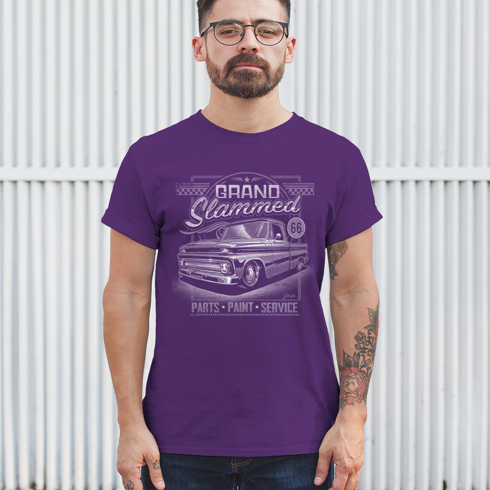 Step back in time with our Grand Slammed vintage truck design, perfect for fans of classic American automotive culture. This shirt showcases a beautifully detailed illustration of a custom truck, making it a standout piece for any car enthusiast. Whether you're attending a car show, hanging out in the garage, or just enjoying a casual day out, this shirt will keep you comfortable and stylish. It's an excellent gift for truck lovers, hot rod aficionados, and anyone with a love for vintage cars. Crafted from premium materials, this shirt offers both durability and softness. Add this unique design to your collection and celebrate the golden era of custom trucks.