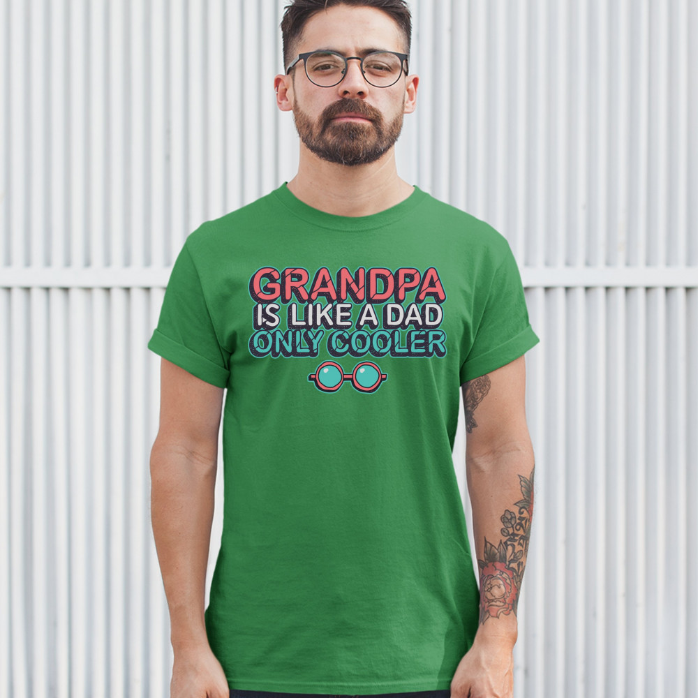 A funny print saying: "Grandpa is like dad only cooler" and featuring a pair of glasses. Great choice as a gift for Father's Day celebration.