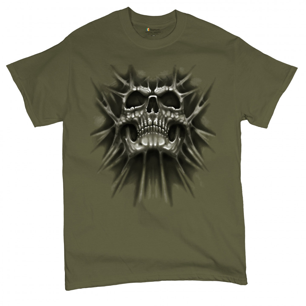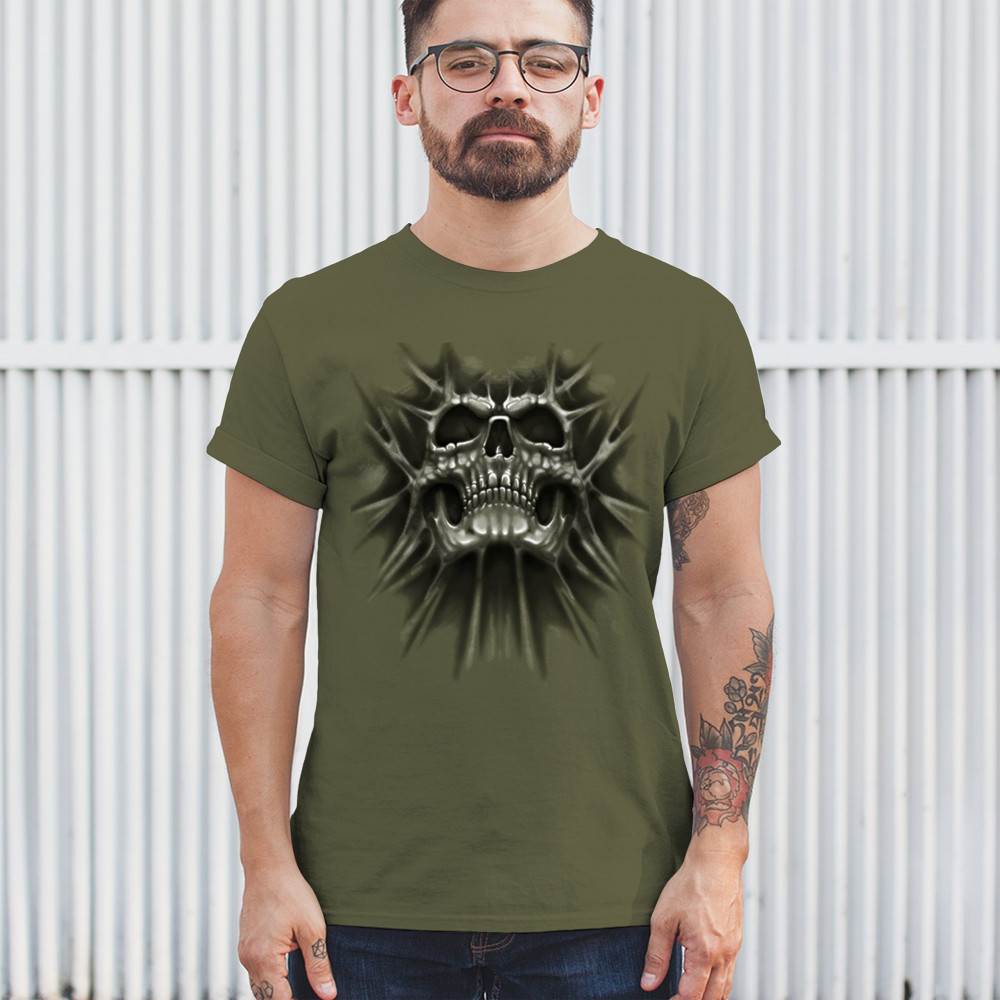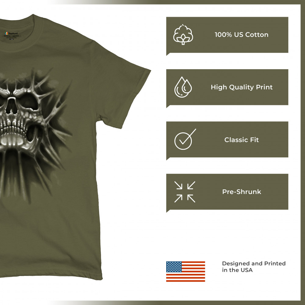 Gothic skull biker shirt with roots design. Perfect for Metalhead, Rock n Roll fans, edgy rebel fashion, and spooky Halloween vibes.