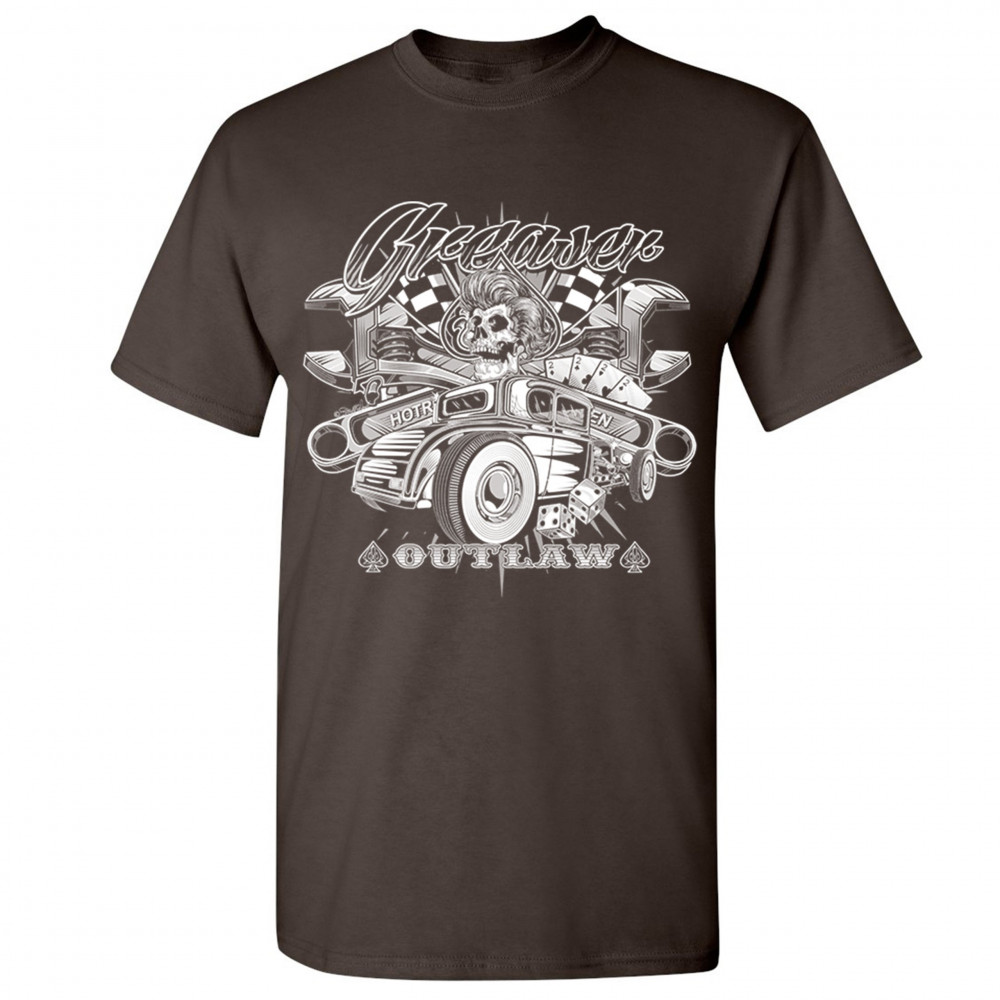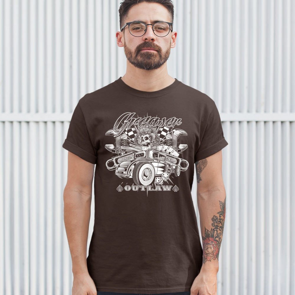 A print featuring a skull, a vintage Hot Rod and a pair of dice. In the background there are crossed wrenches, playing cards and racing flags. The print says: "Greaser outlaw". A great choice for a fan of customized American classic cars and hot rods.
