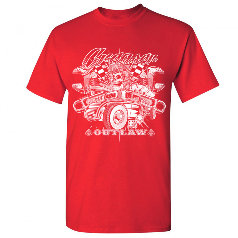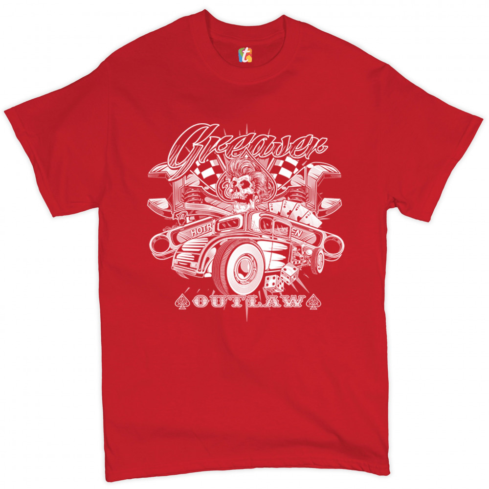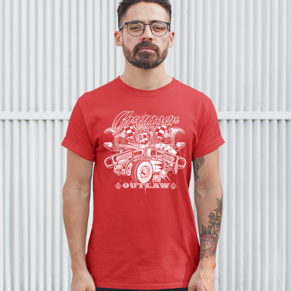 A print featuring a skull, a vintage Hot Rod and a pair of dice. In the background there are crossed wrenches, playing cards and racing flags. The print says: "Greaser outlaw". A great choice for a fan of customized American classic cars and hot rods.