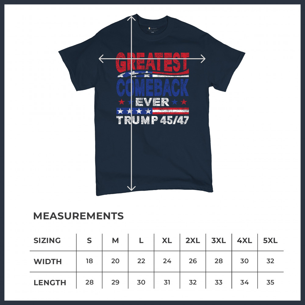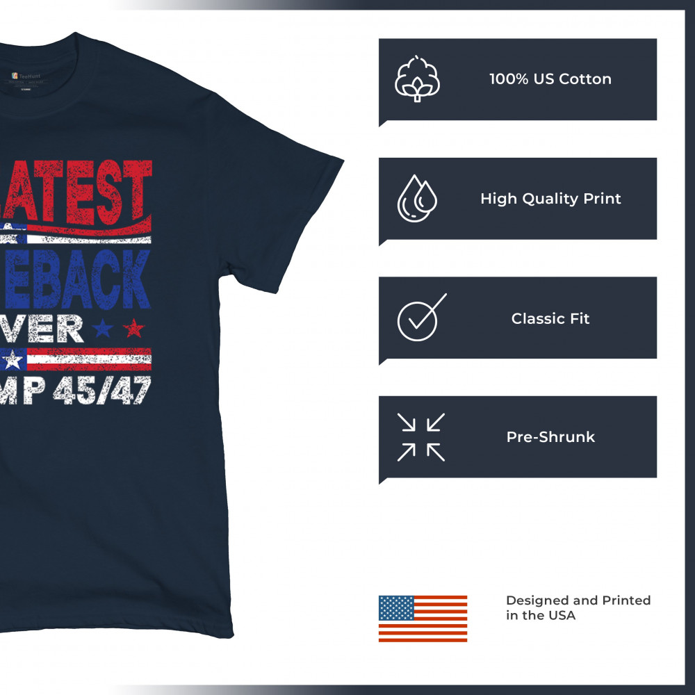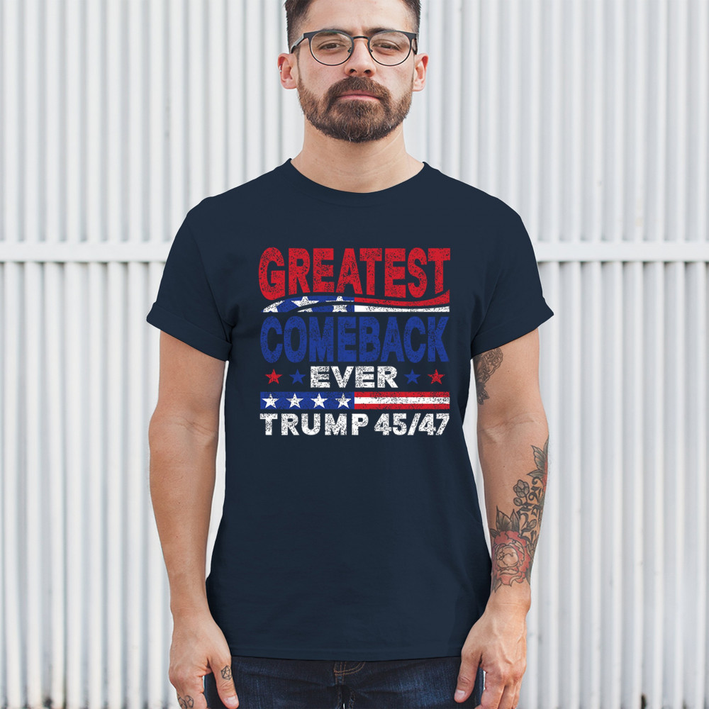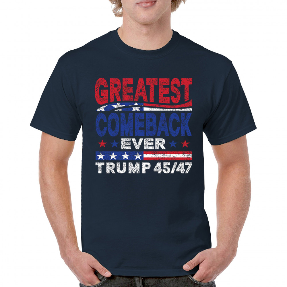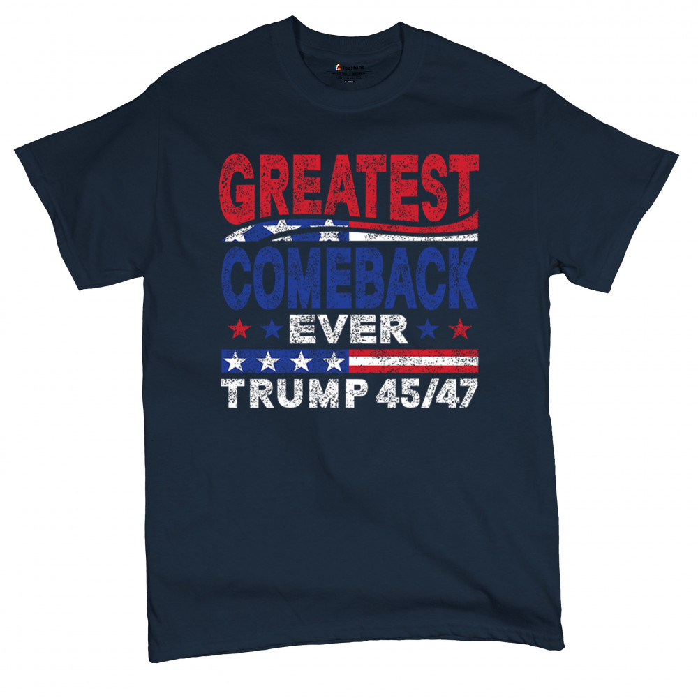 The "Greatest Comeback Ever" design is a tribute to resilience, patriotism, and the fight for American values. Featuring bold patriotic colors and a slogan that embodies the spirit of victory, this design is perfect for Trump supporters and conservatives who believe in never surrendering. Celebrate the leadership of Donald J. Trump as the 45th and 47th president and join the movement for America's future.