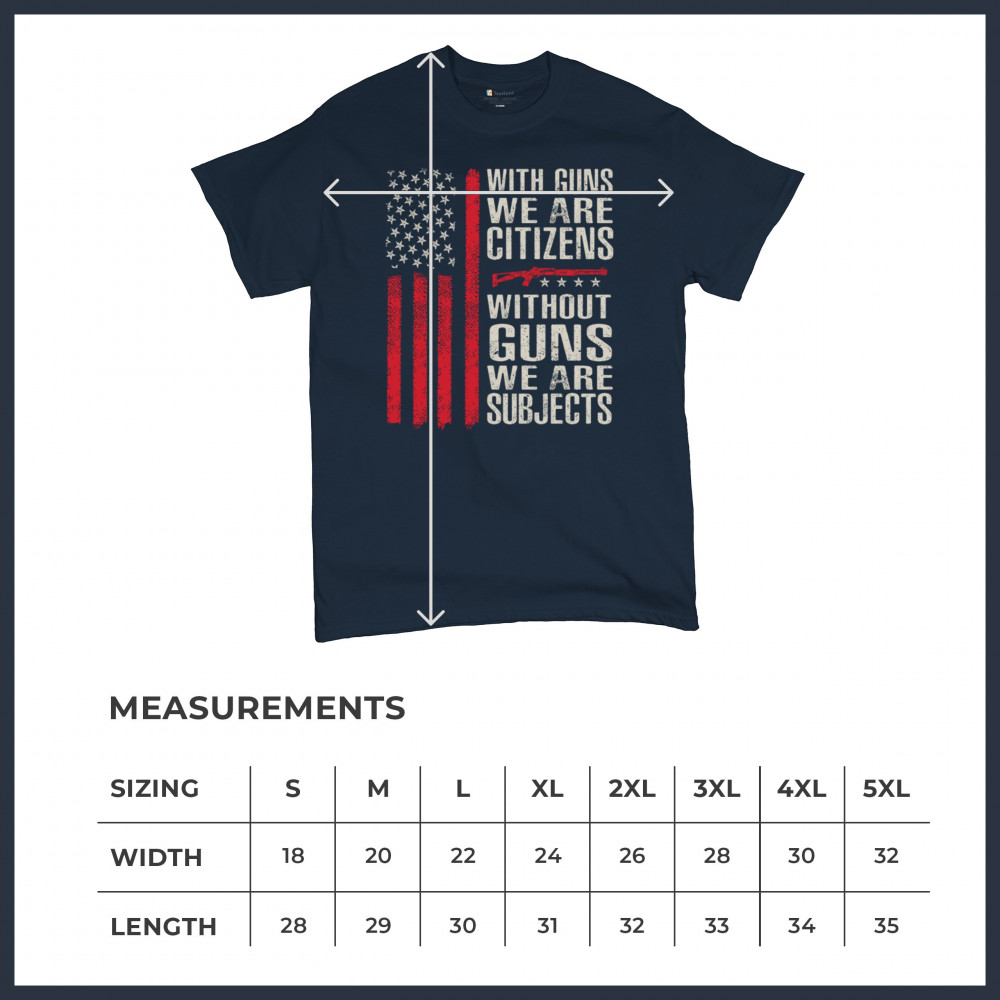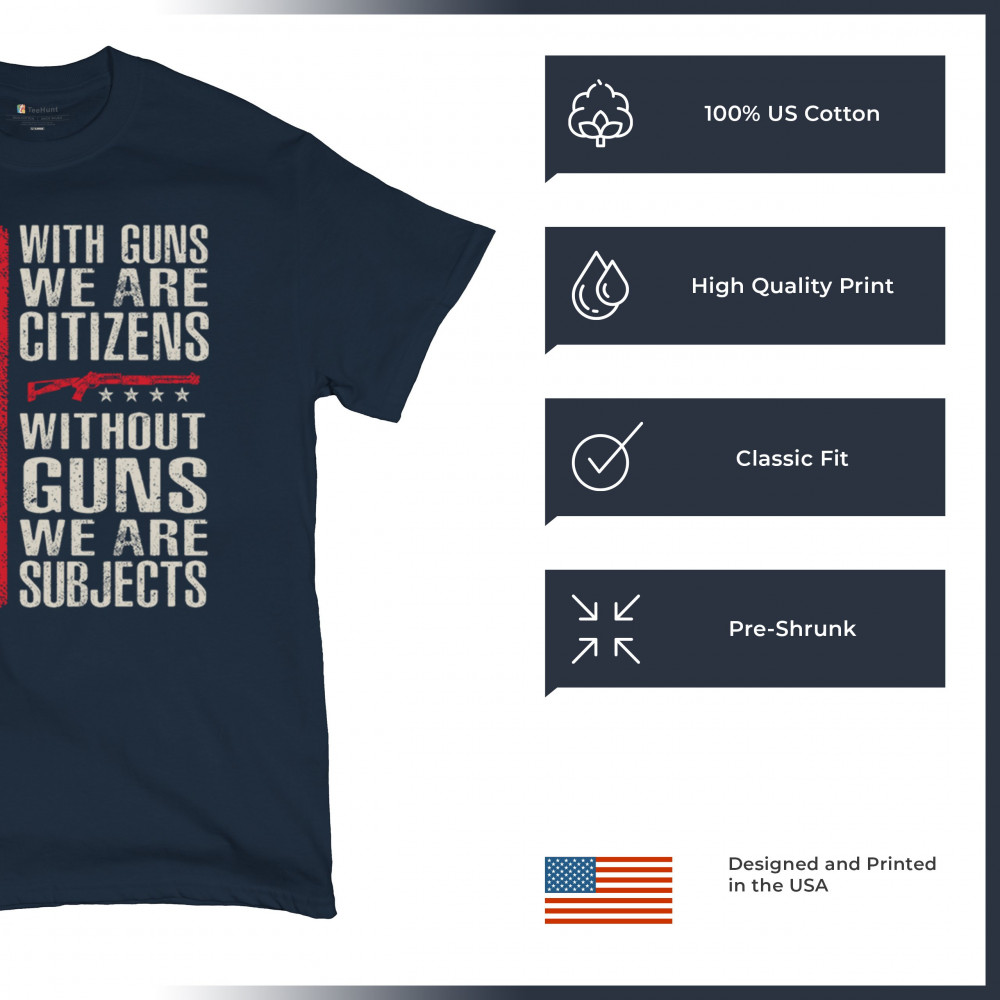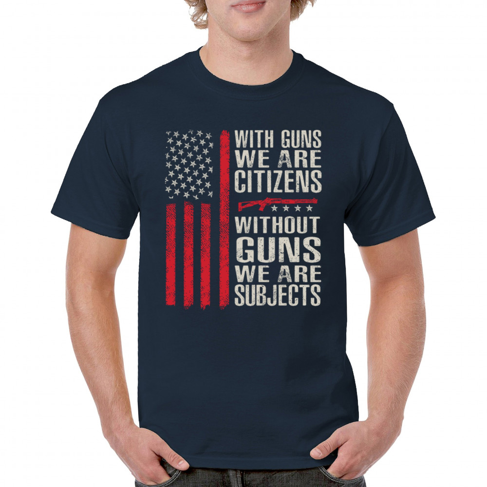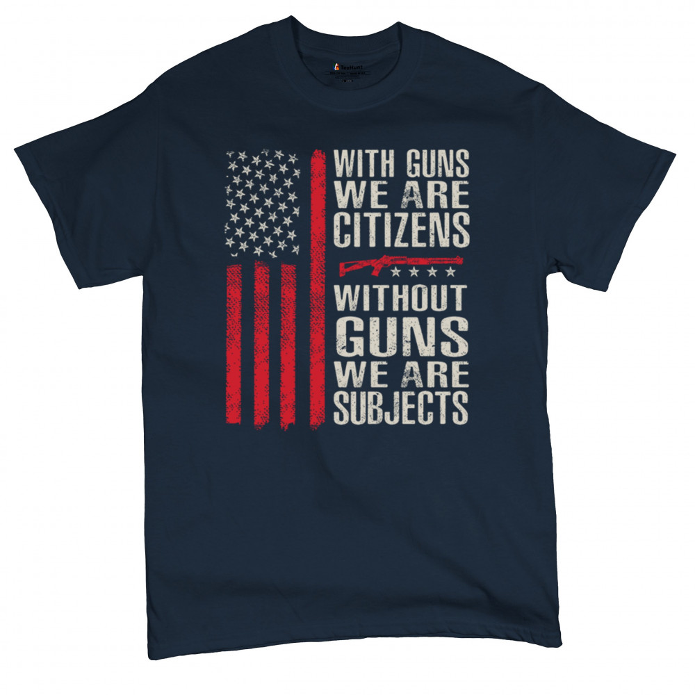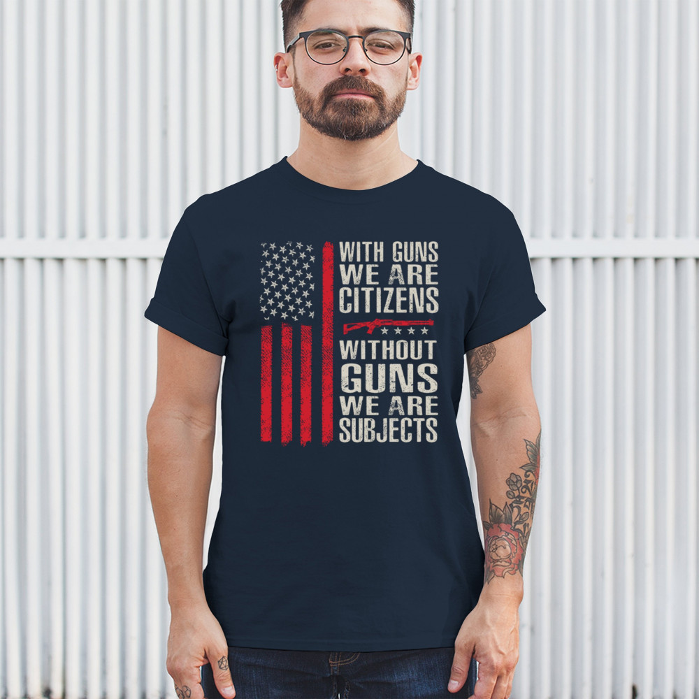 Make your voice heard with this powerful pro-2A design featuring an AR-15 graphic and distressed red American flag. The quote “With Guns We Are Citizens, Without Guns We Are Subjects†speaks directly to the heart of liberty and personal defense. A must-have for patriots, protestors, and gun rights supporters who defend the Constitution.