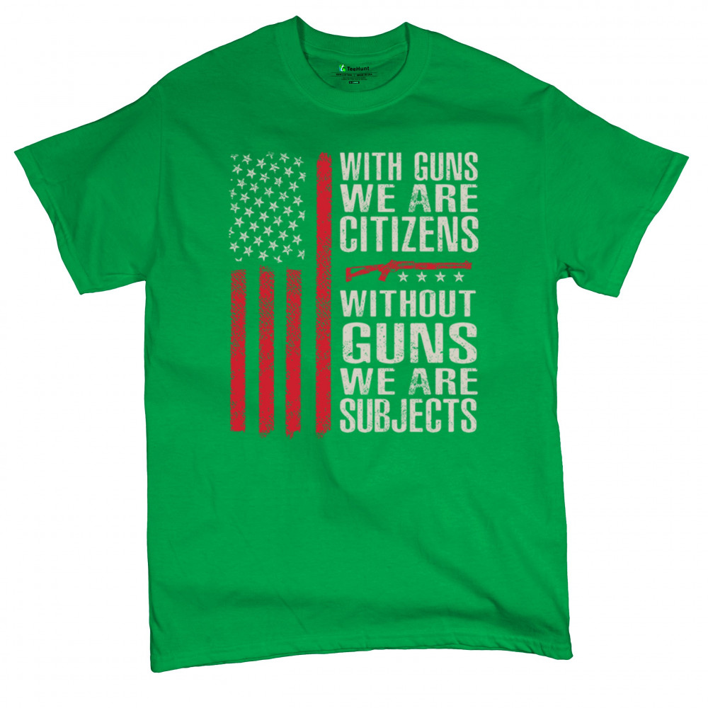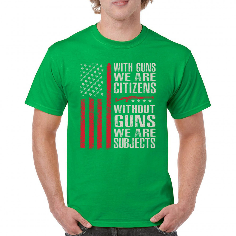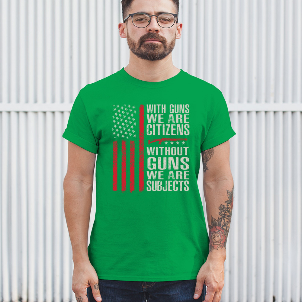 Make your voice heard with this powerful pro-2A design featuring an AR-15 graphic and distressed red American flag. The quote “With Guns We Are Citizens, Without Guns We Are Subjects†speaks directly to the heart of liberty and personal defense. A must-have for patriots, protestors, and gun rights supporters who defend the Constitution.