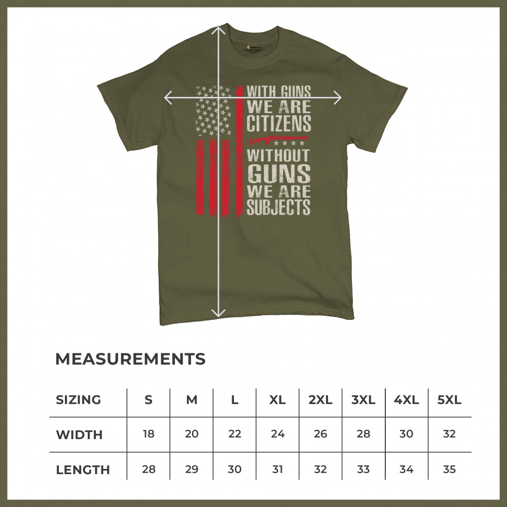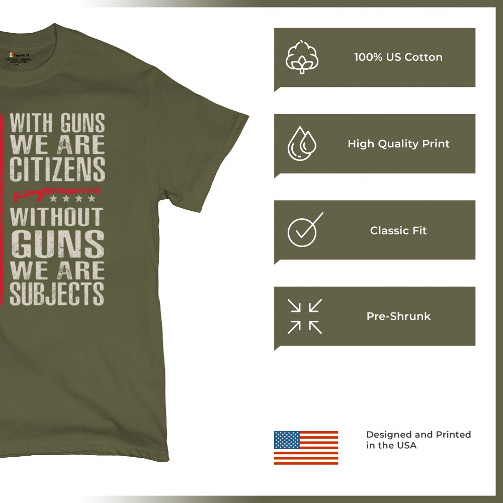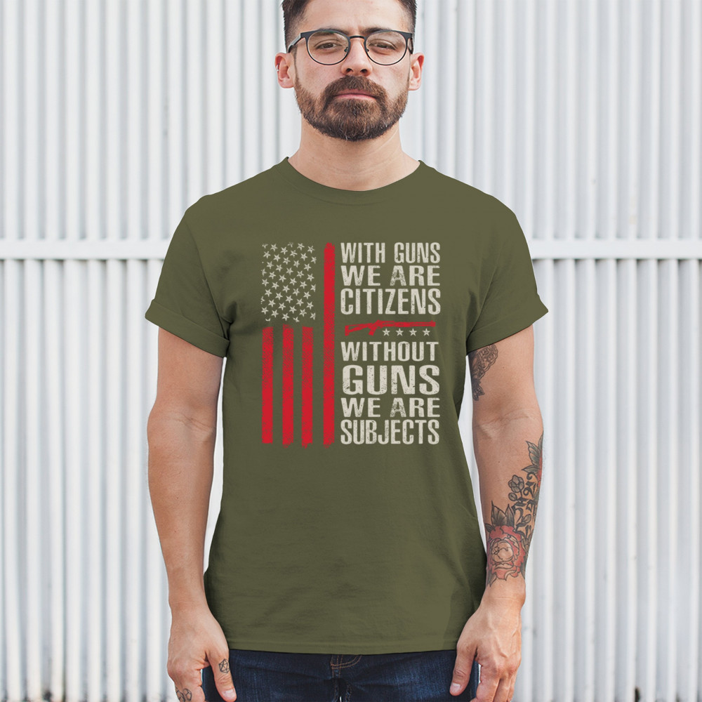 Make your voice heard with this powerful pro-2A design featuring an AR-15 graphic and distressed red American flag. The quote “With Guns We Are Citizens, Without Guns We Are Subjects†speaks directly to the heart of liberty and personal defense. A must-have for patriots, protestors, and gun rights supporters who defend the Constitution.