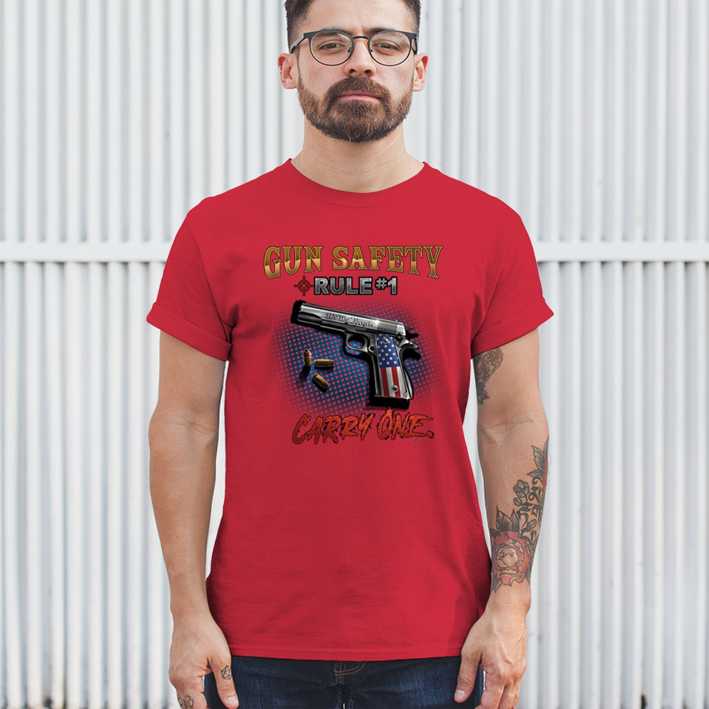 Show your commitment to gun safety and constitutional rights with our 'Carry One' graphic tee. Perfect for patriots, veterans, and advocates of liberty.