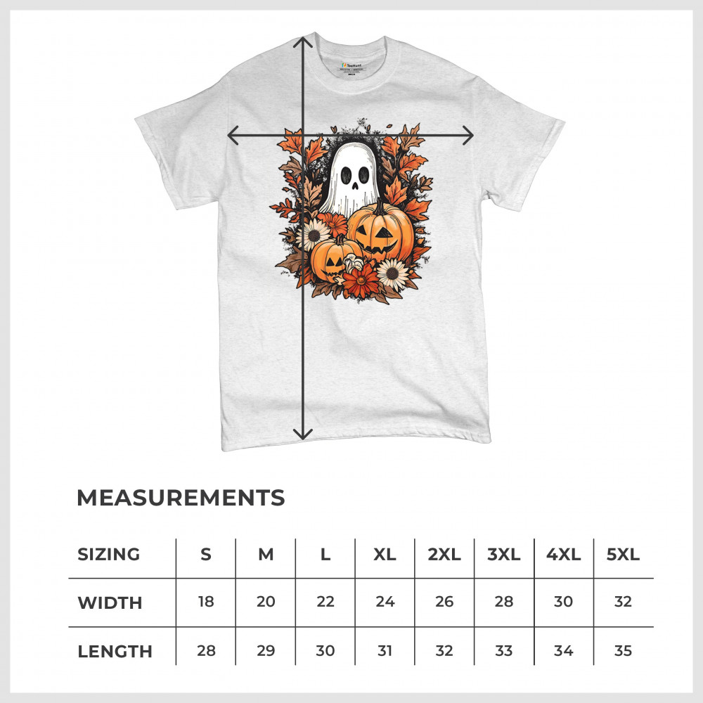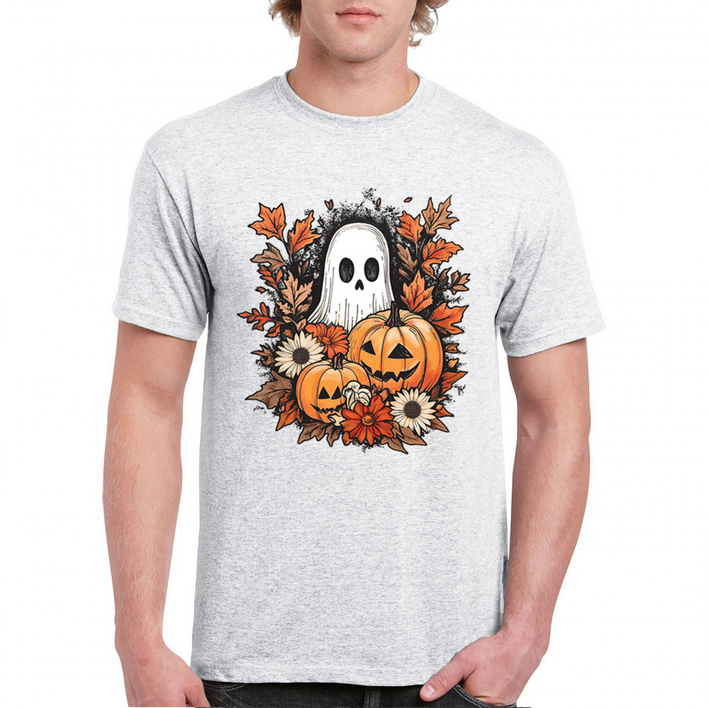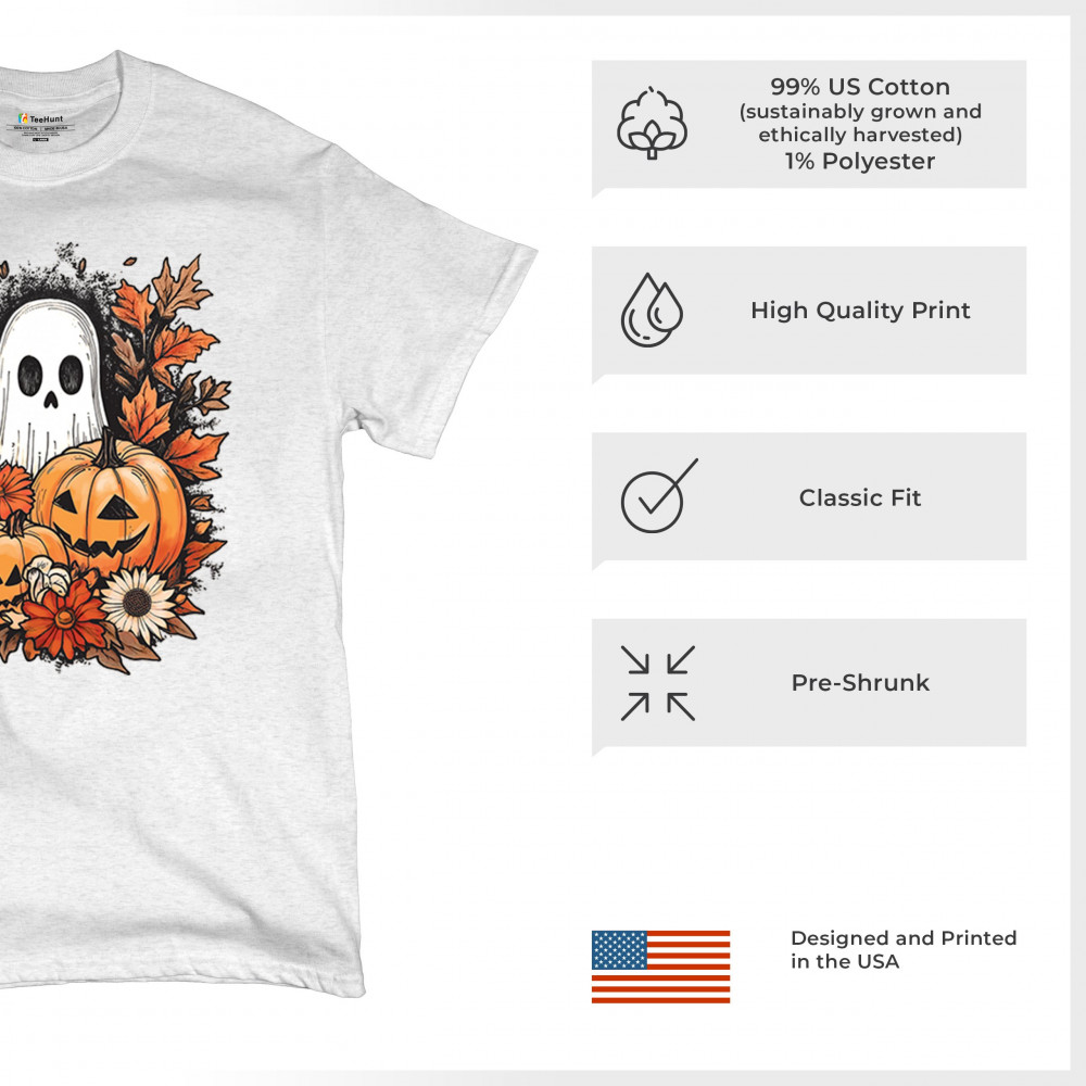 Celebrate the arrival of fall with this delightful design featuring pumpkins, autumn leaves, flowers, and a cute ghost. It's the perfect addition to your Halloween and autumn-themed wardrobe, or even as decor to welcome the fall spirit into your home. The combination of spooky and cozy elements creates a festive yet warm vibe, ideal for Halloween parties, pumpkin patch trips, or just enjoying the beautiful fall season.
