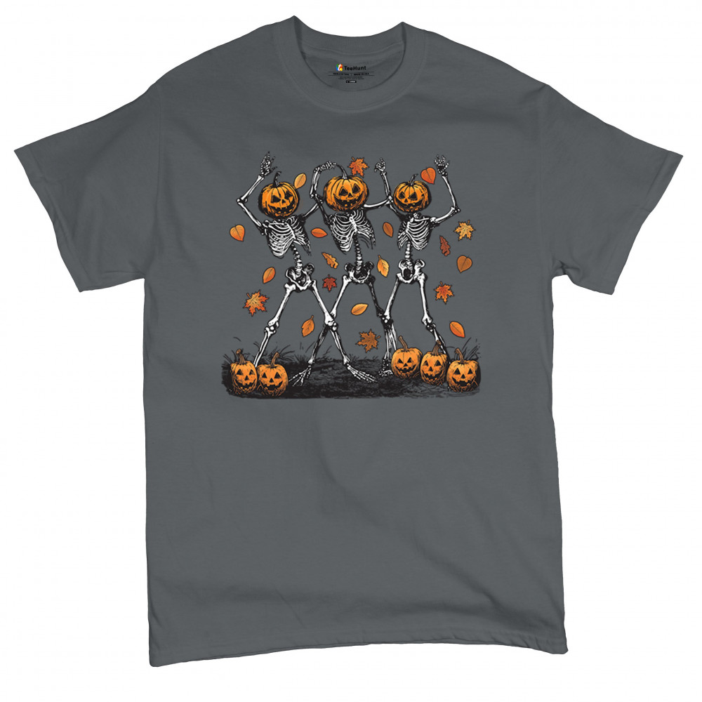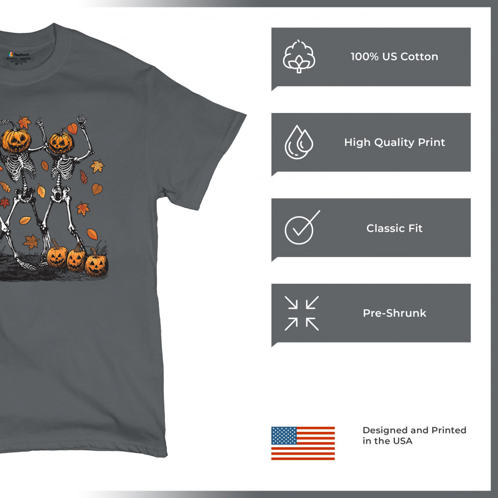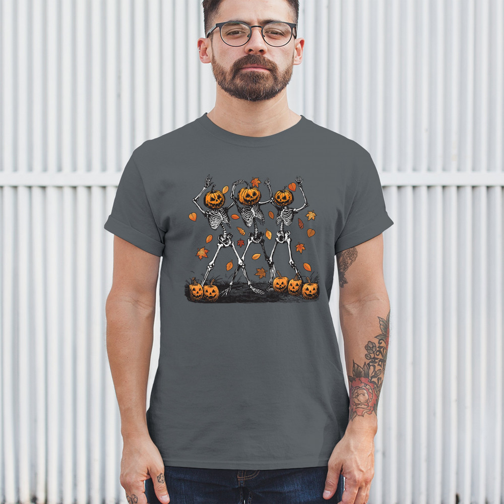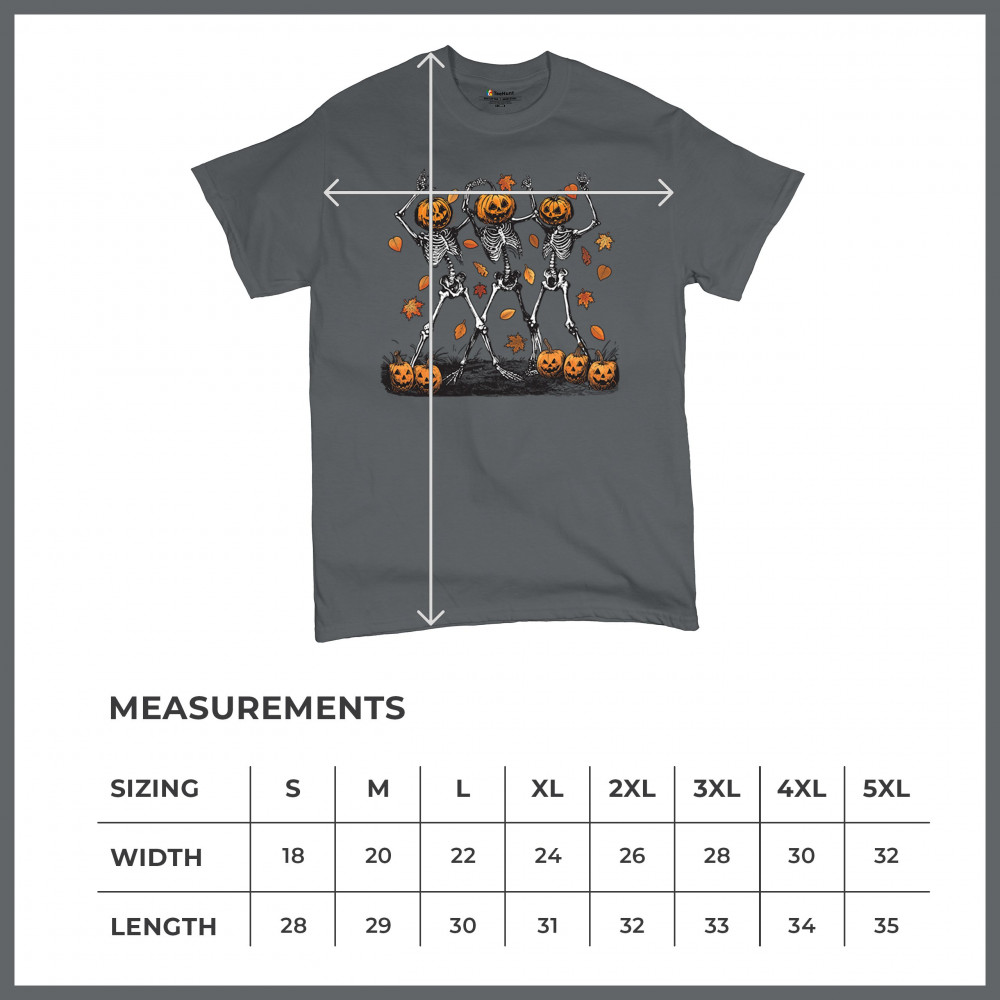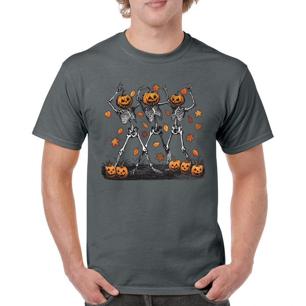 Add a touch of spooky fun to your wardrobe with this lively design featuring pumpkin-headed skeletons dancing through a swirl of autumn leaves. Perfect for Halloween parties, trick-or-treating, and fall festivals, this design is a must-have for anyone who enjoys the whimsical side of the spooky season. Made with comfort and quality in mind, this is the perfect apparel for all your October gatherings and events. Wear it to show off your Halloween spirit!