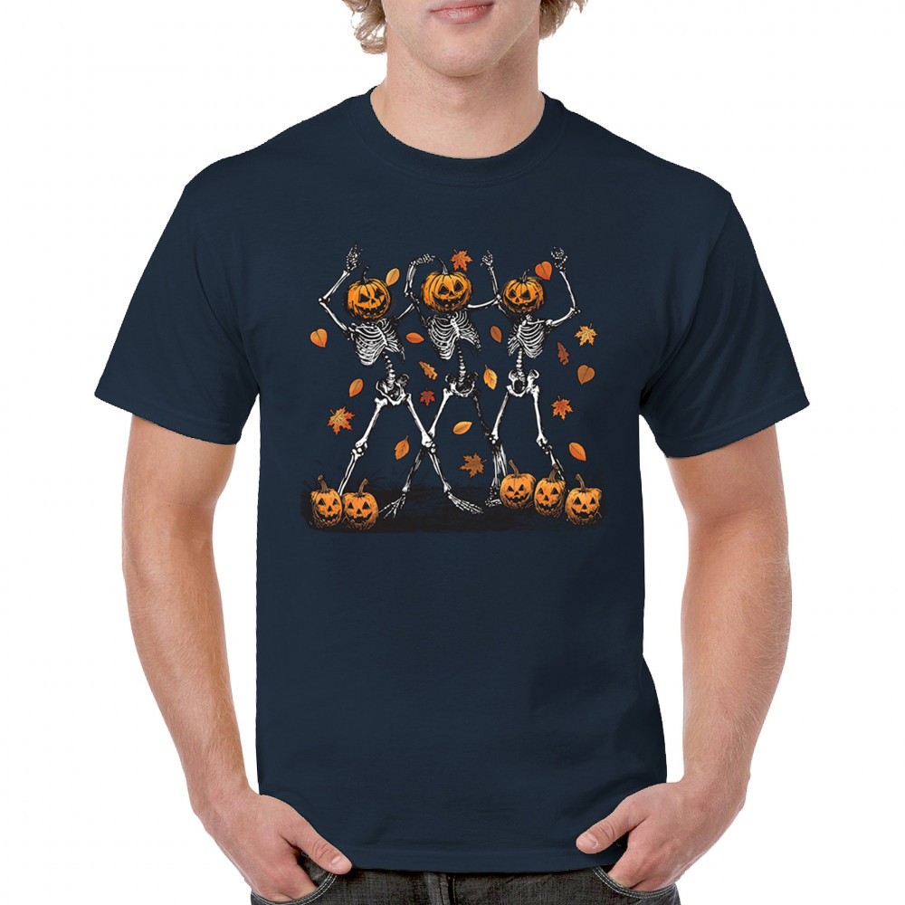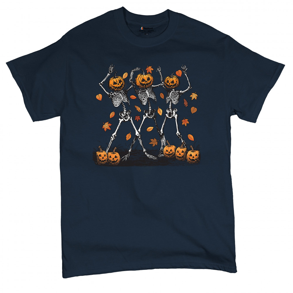 Add a touch of spooky fun to your wardrobe with this lively design featuring pumpkin-headed skeletons dancing through a swirl of autumn leaves. Perfect for Halloween parties, trick-or-treating, and fall festivals, this design is a must-have for anyone who enjoys the whimsical side of the spooky season. Made with comfort and quality in mind, this is the perfect apparel for all your October gatherings and events. Wear it to show off your Halloween spirit!