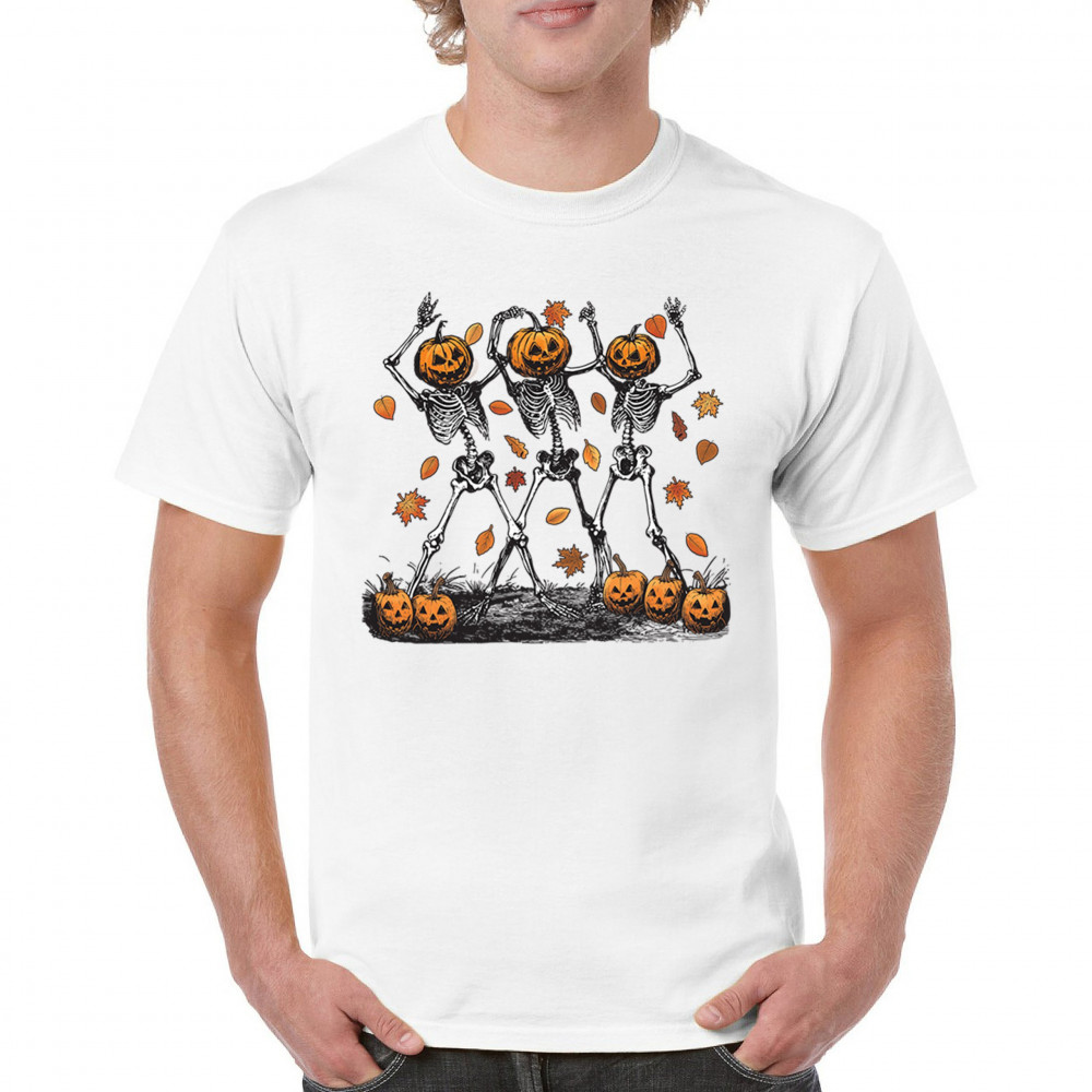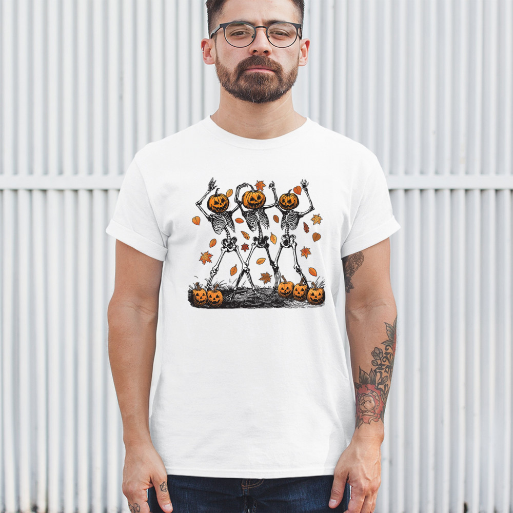 Add a touch of spooky fun to your wardrobe with this lively design featuring pumpkin-headed skeletons dancing through a swirl of autumn leaves. Perfect for Halloween parties, trick-or-treating, and fall festivals, this design is a must-have for anyone who enjoys the whimsical side of the spooky season. Made with comfort and quality in mind, this is the perfect apparel for all your October gatherings and events. Wear it to show off your Halloween spirit!