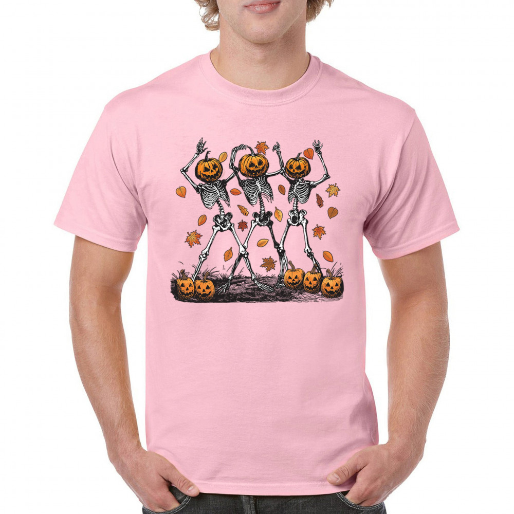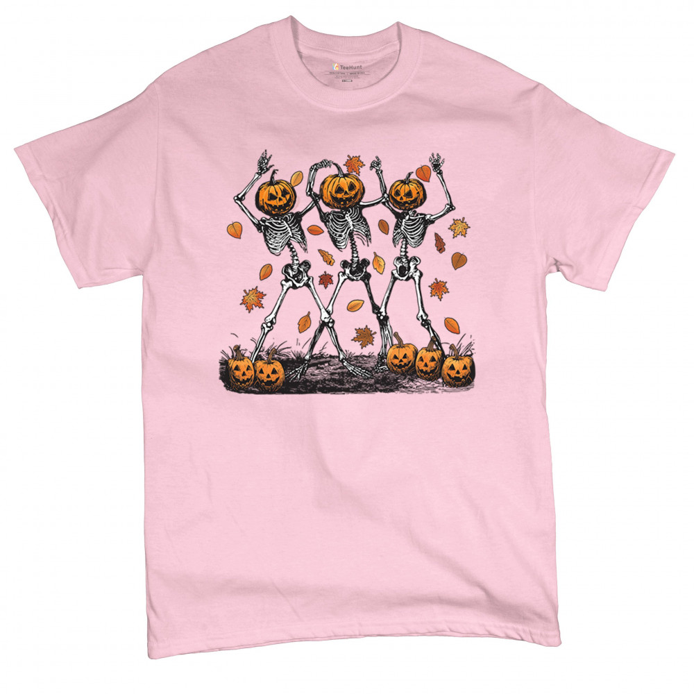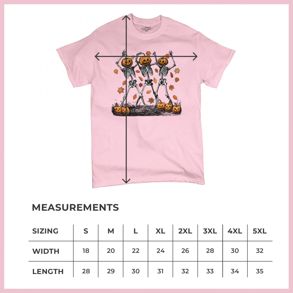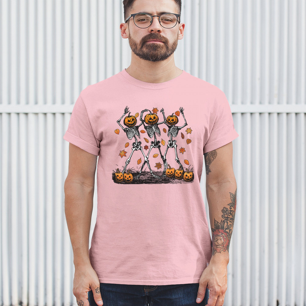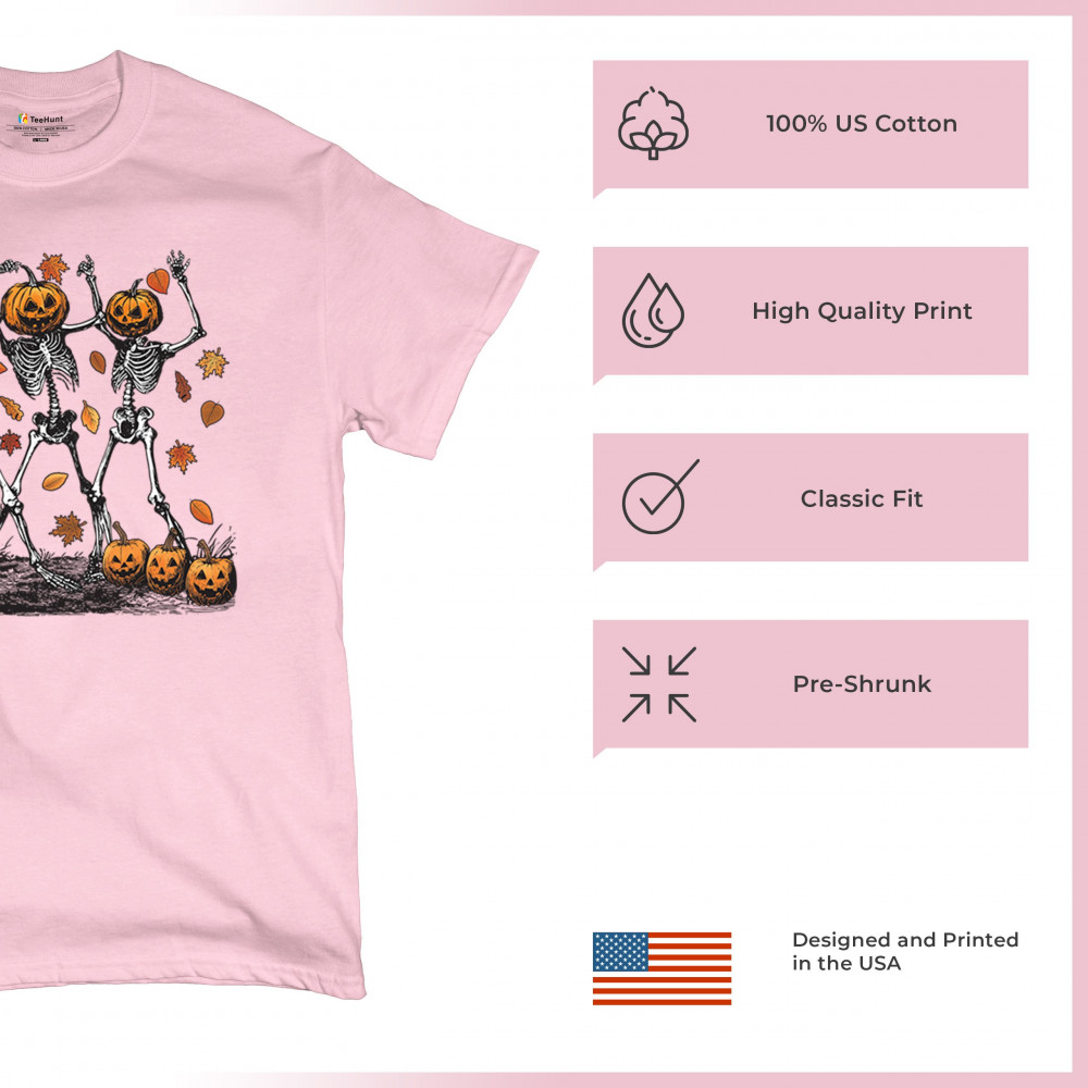 Add a touch of spooky fun to your wardrobe with this lively design featuring pumpkin-headed skeletons dancing through a swirl of autumn leaves. Perfect for Halloween parties, trick-or-treating, and fall festivals, this design is a must-have for anyone who enjoys the whimsical side of the spooky season. Made with comfort and quality in mind, this is the perfect apparel for all your October gatherings and events. Wear it to show off your Halloween spirit!