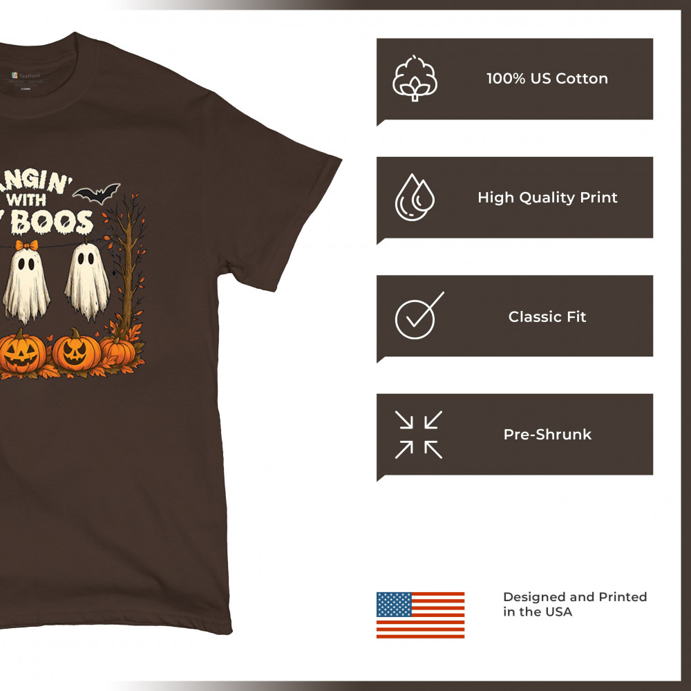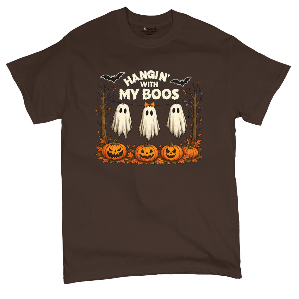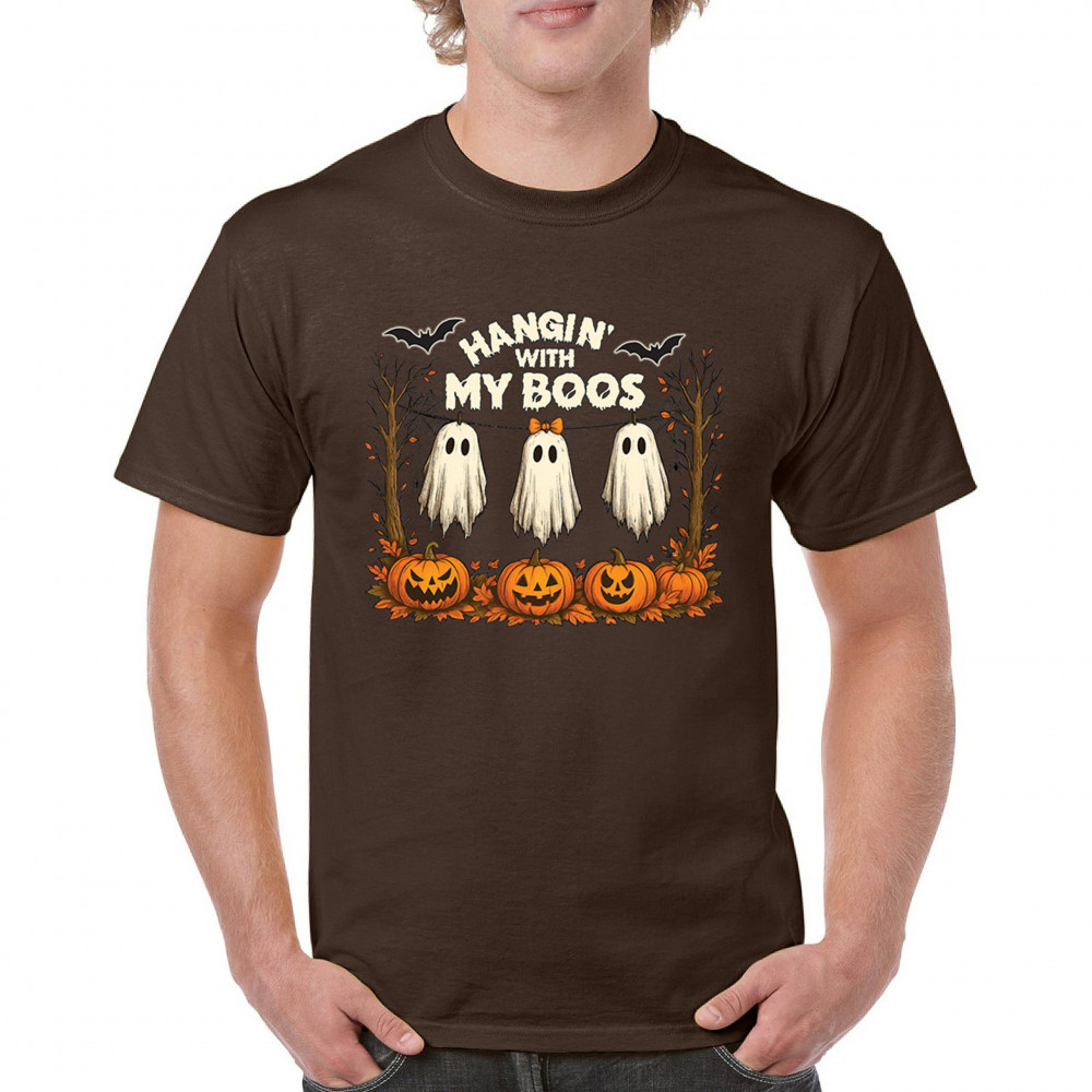 Hangin With My Boos design featuring spooky ghosts, jack o lanterns, and haunted house humor. Perfect for Halloween night, October 31, and parties.