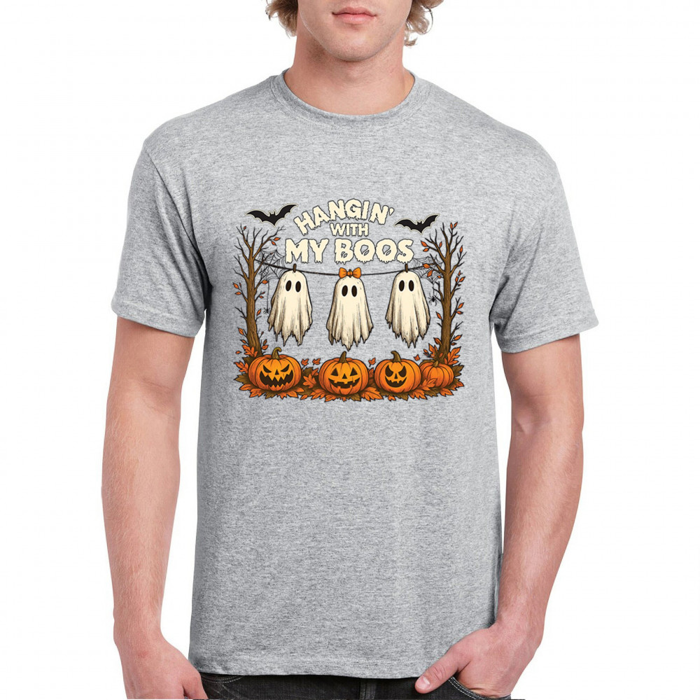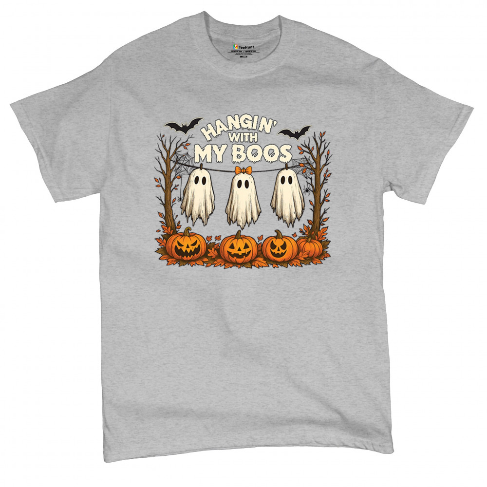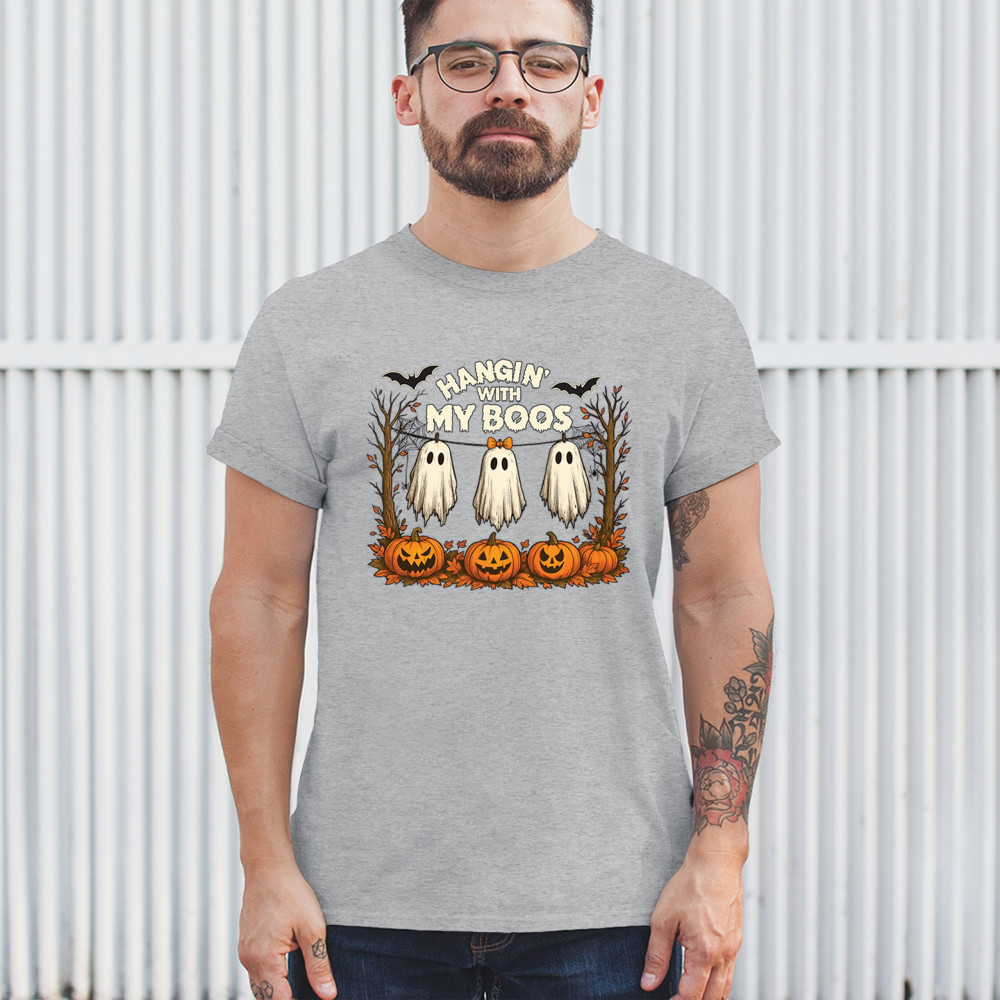 Hangin With My Boos design featuring spooky ghosts, jack o lanterns, and haunted house humor. Perfect for Halloween night, October 31, and parties.