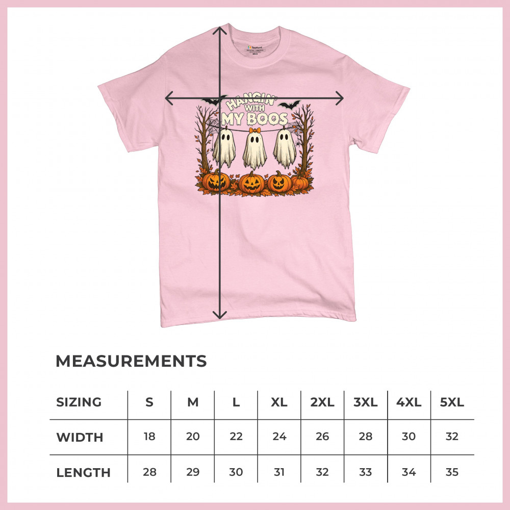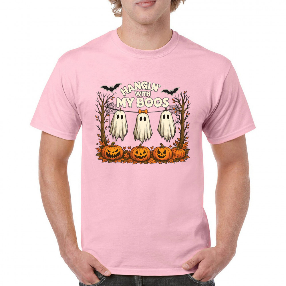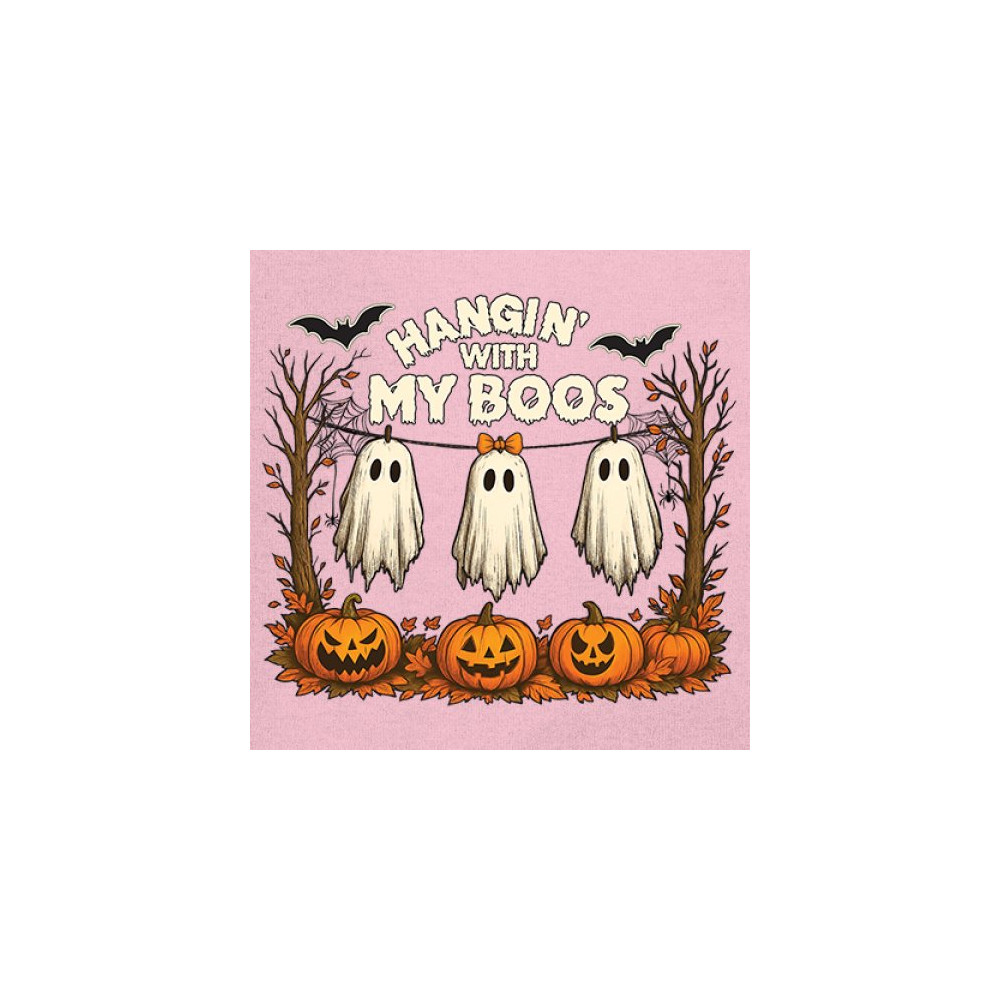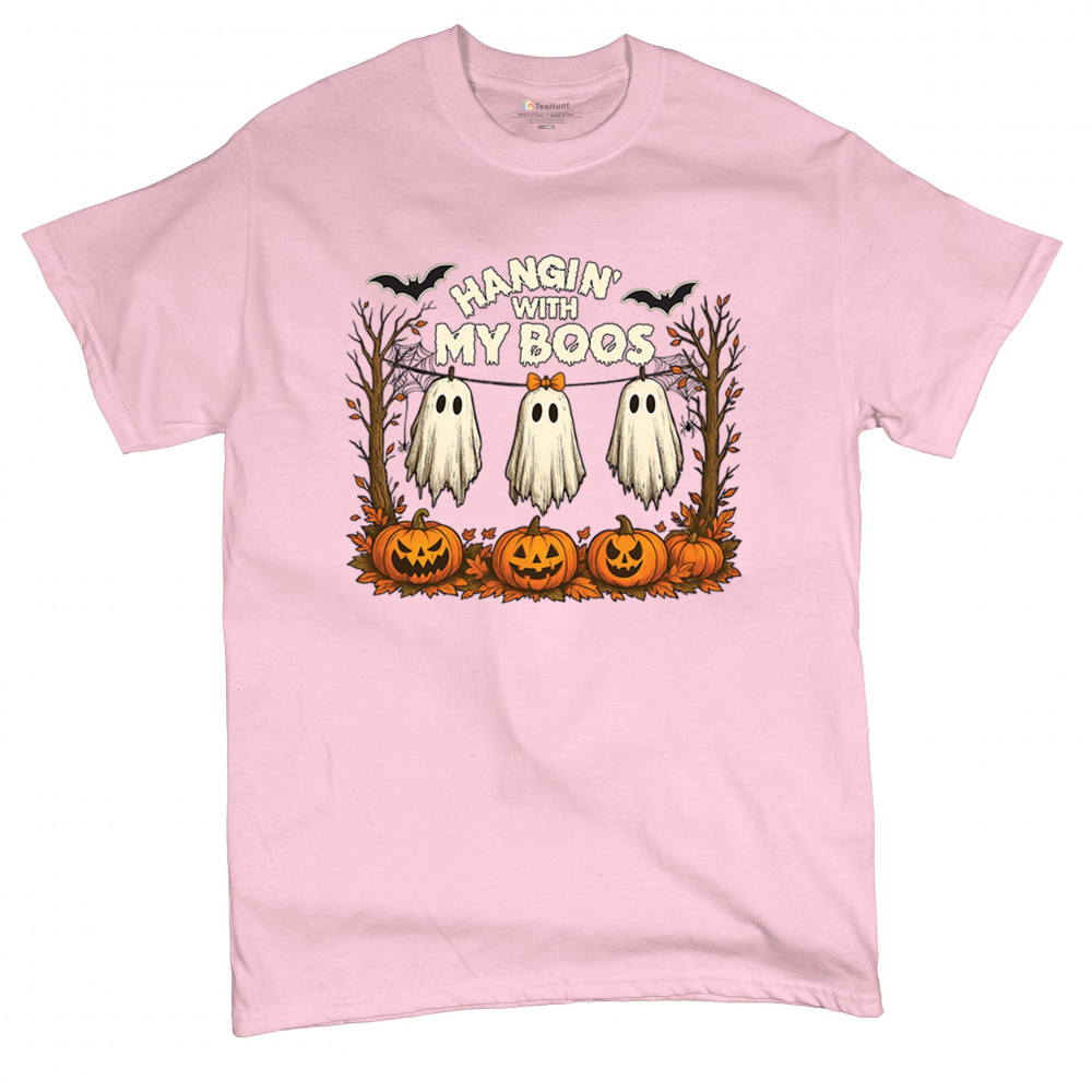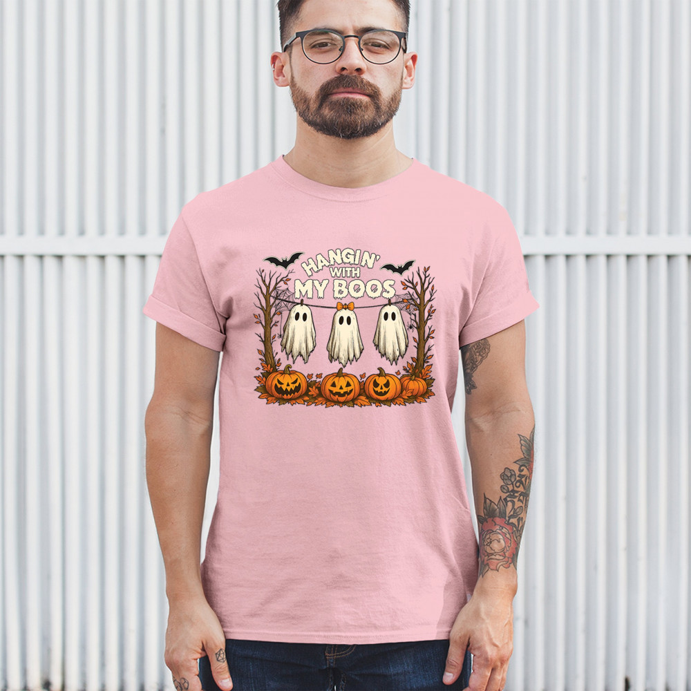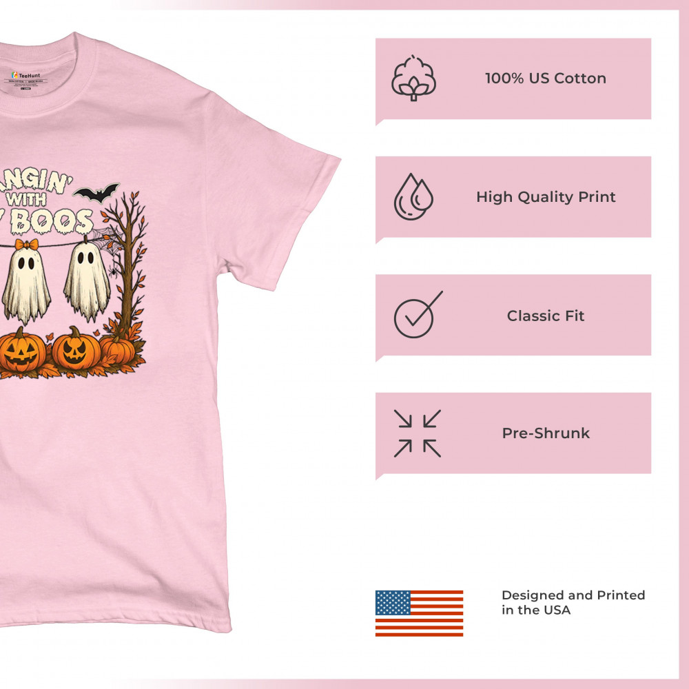 Hangin With My Boos design featuring spooky ghosts, jack o lanterns, and haunted house humor. Perfect for Halloween night, October 31, and parties.